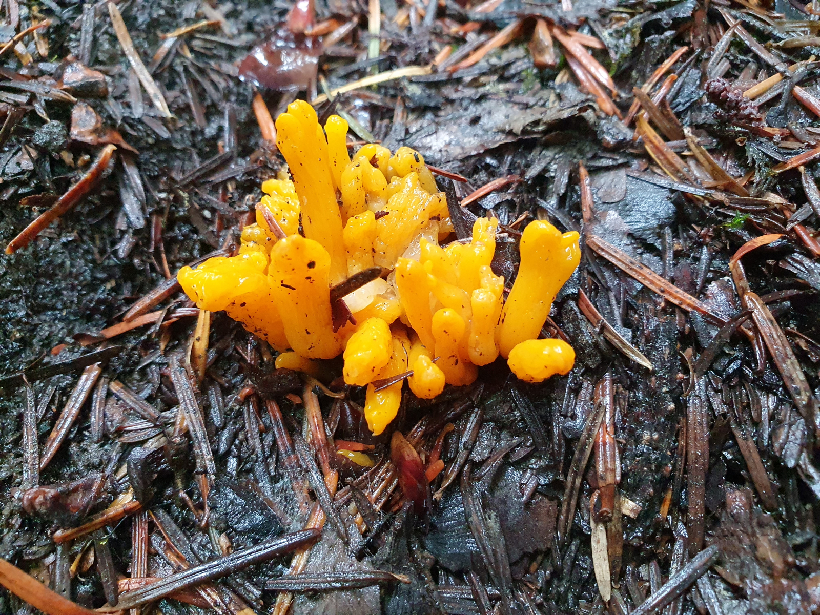 Aufgrund der Fruchtkörper suche ich bei Calocera. Aber vielleicht liege ich ja damit schon daneben.