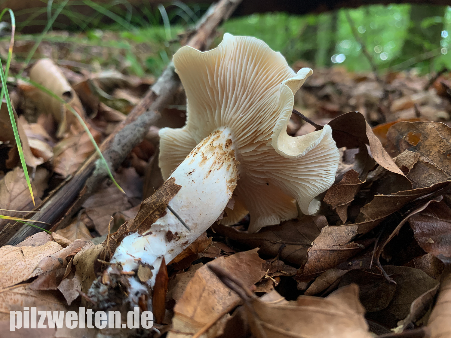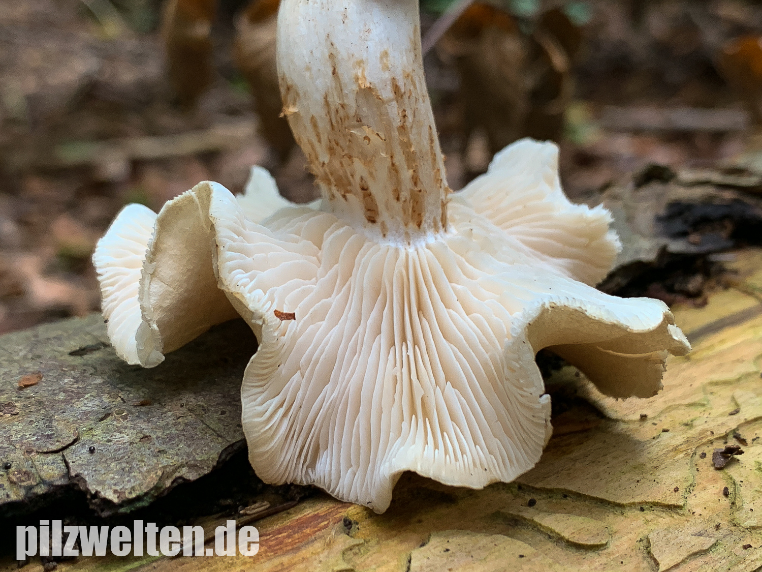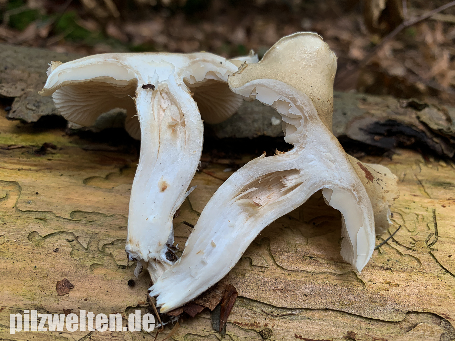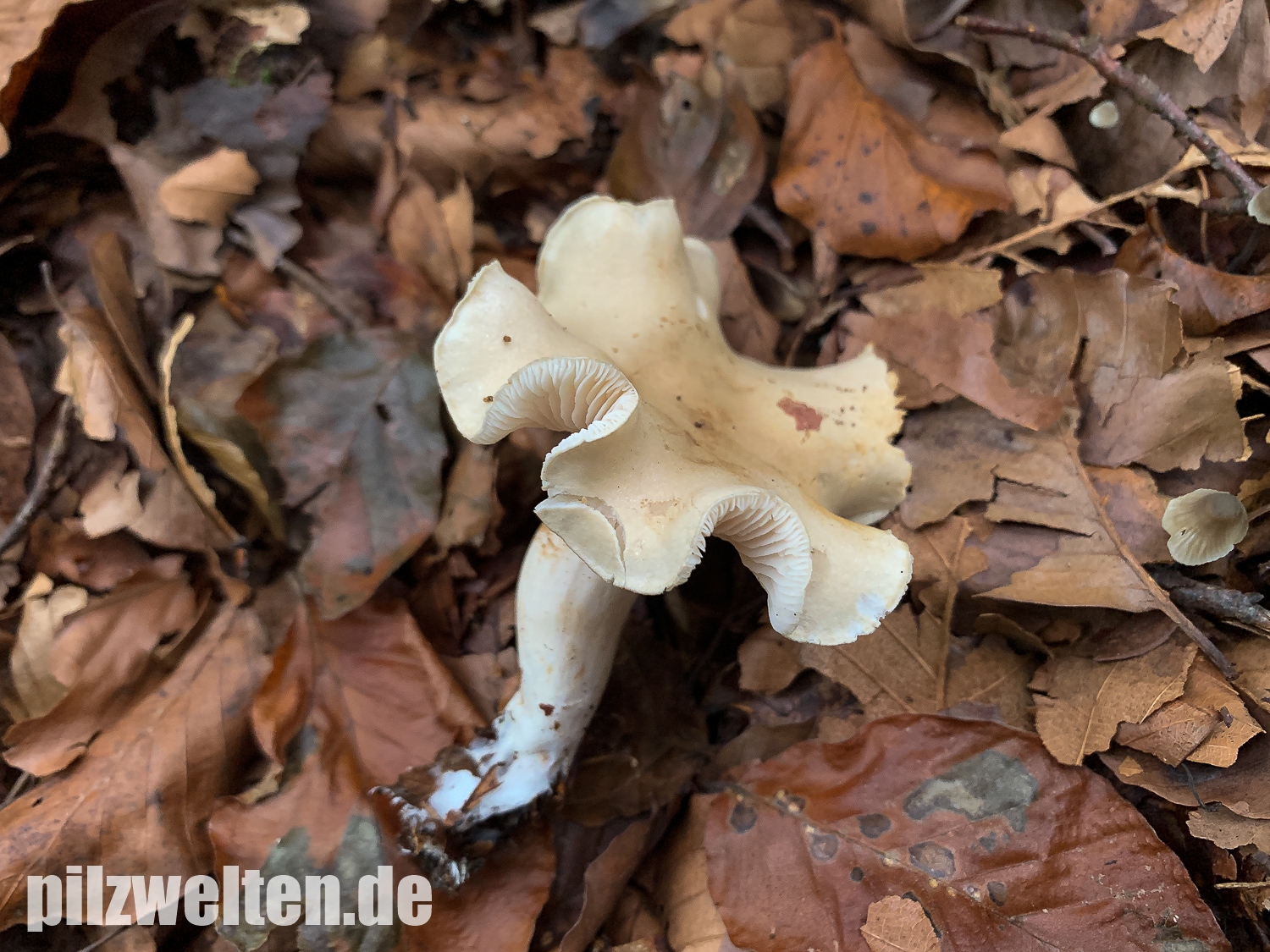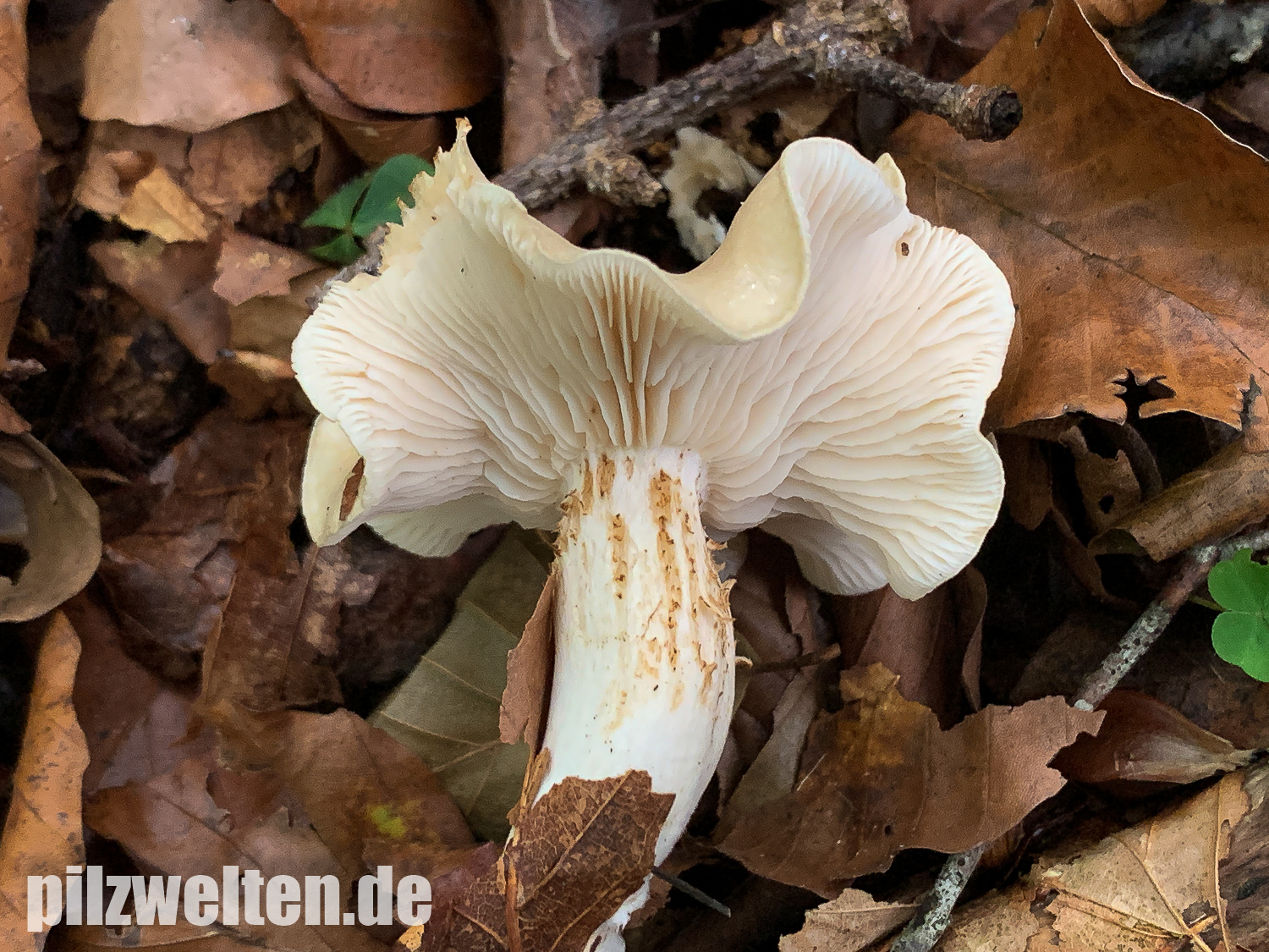 Besonderheiten: Bei zwei älteren FK jeweils etwas aufgerissener Stiel mit orangerötlichen Verfärbungen, Junge Fruchtkörper mit gleichmäßig gerade geformten Hut, ältere Fruchtkörper extrem wellig
