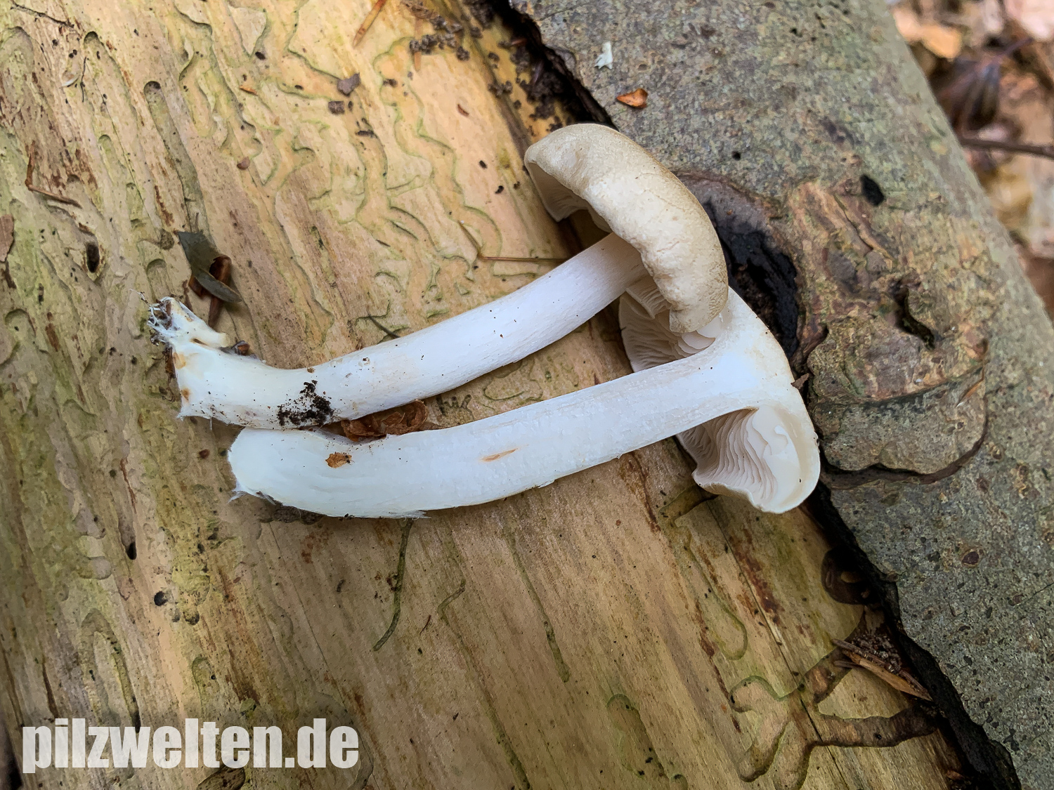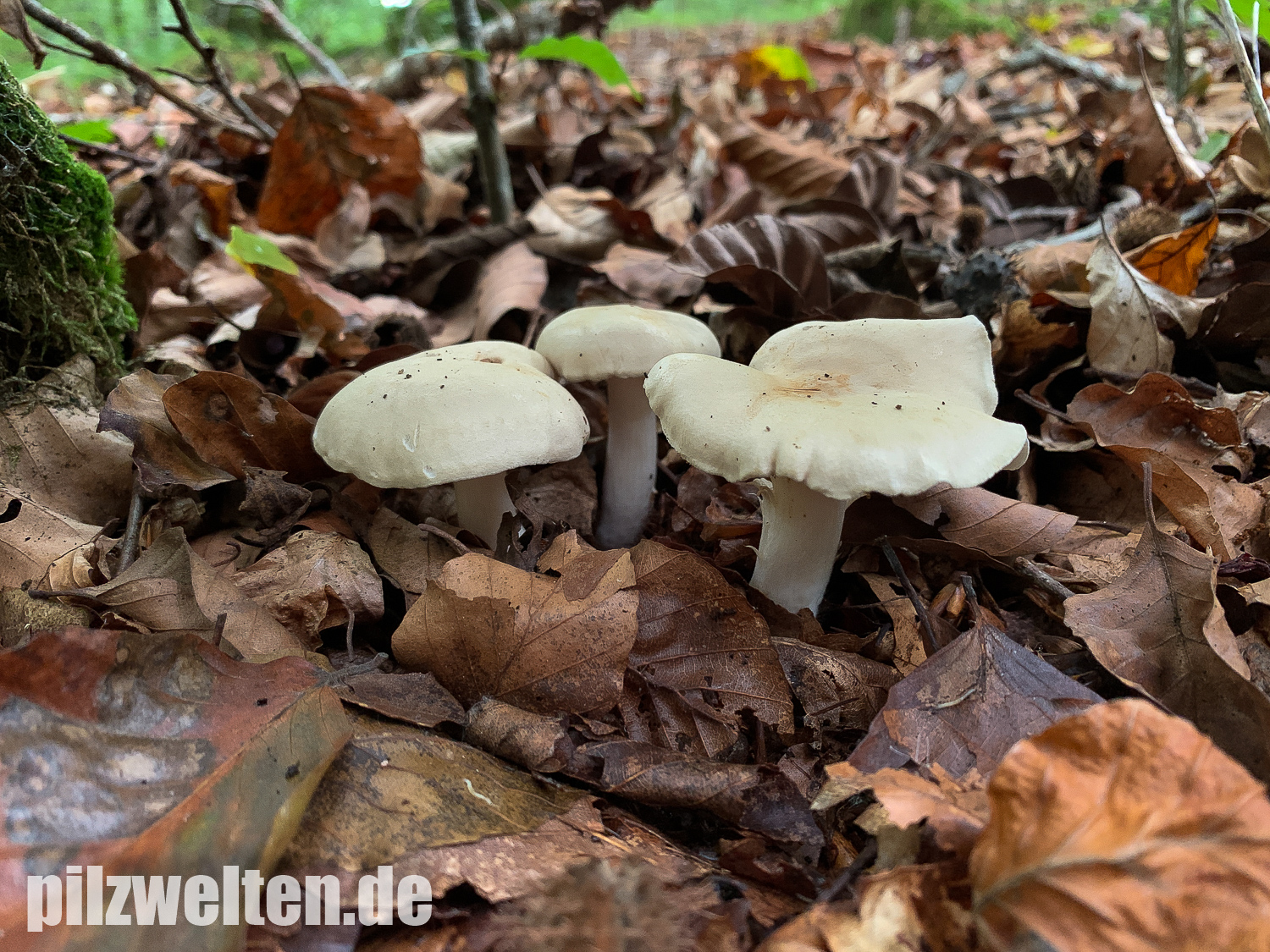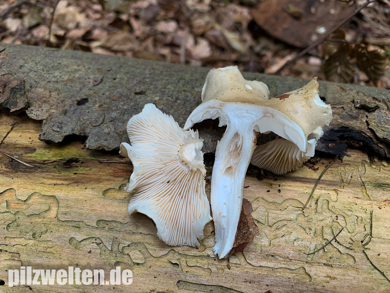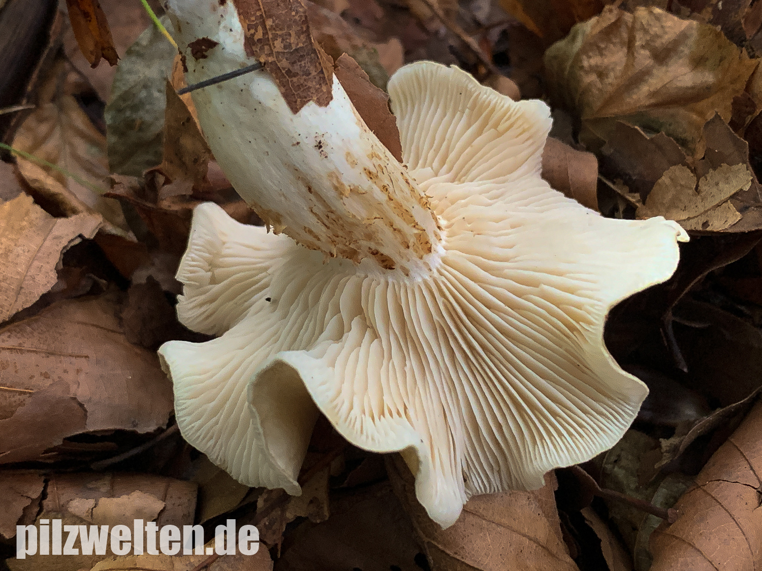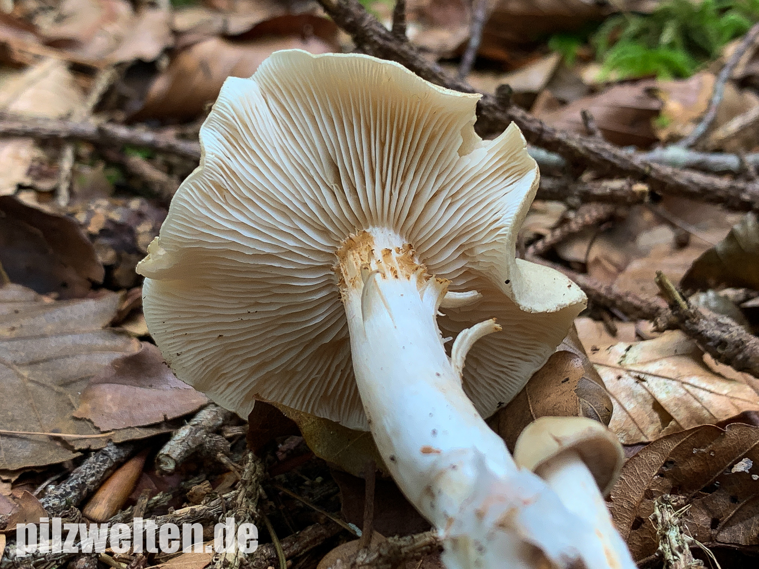 Besonderheiten: Bei zwei älteren FK jeweils etwas aufgerissener Stiel mit orangerötlichen Verfärbungen, Junge Fruchtkörper mit gleichmäßig gerade geformten Hut, ältere Fruchtkörper extrem wellig