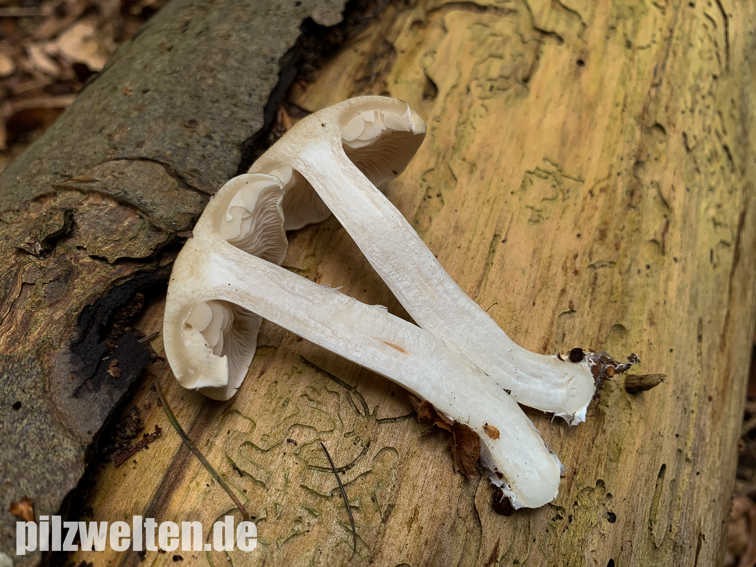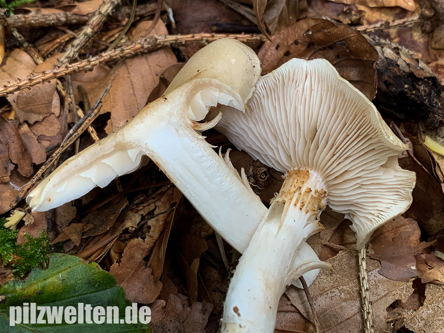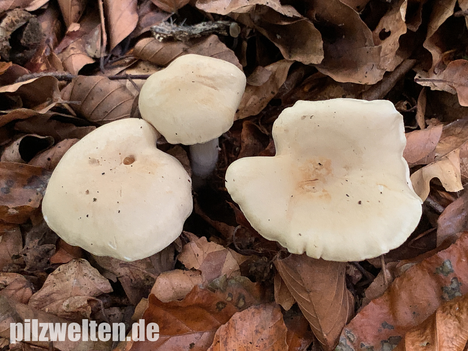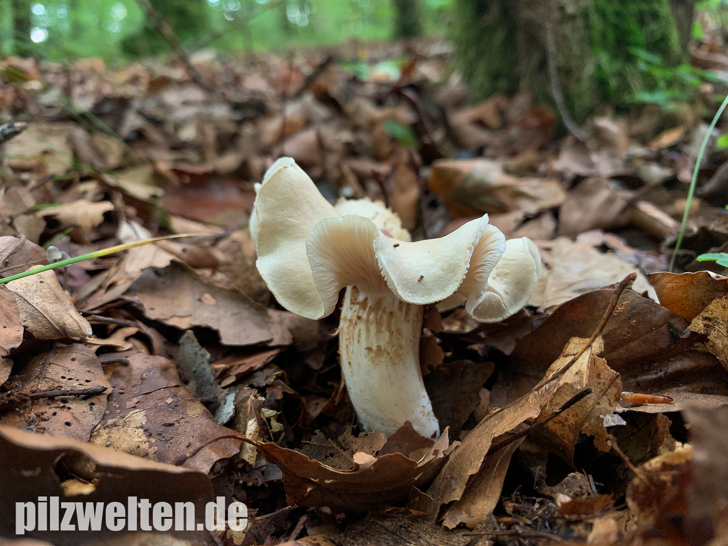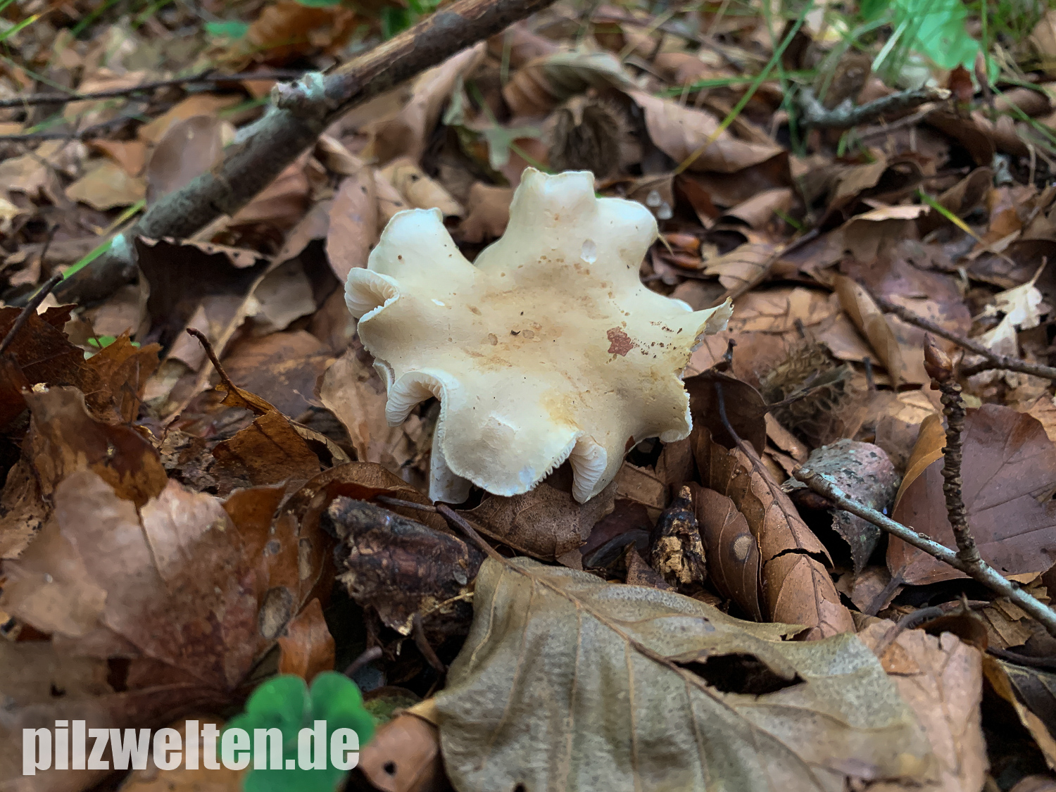 Besonderheiten: Bei zwei älteren FK jeweils etwas aufgerissener Stiel mit orangerötlichen Verfärbungen, Junge Fruchtkörper mit gleichmäßig gerade geformten Hut, ältere Fruchtkörper extrem wellig