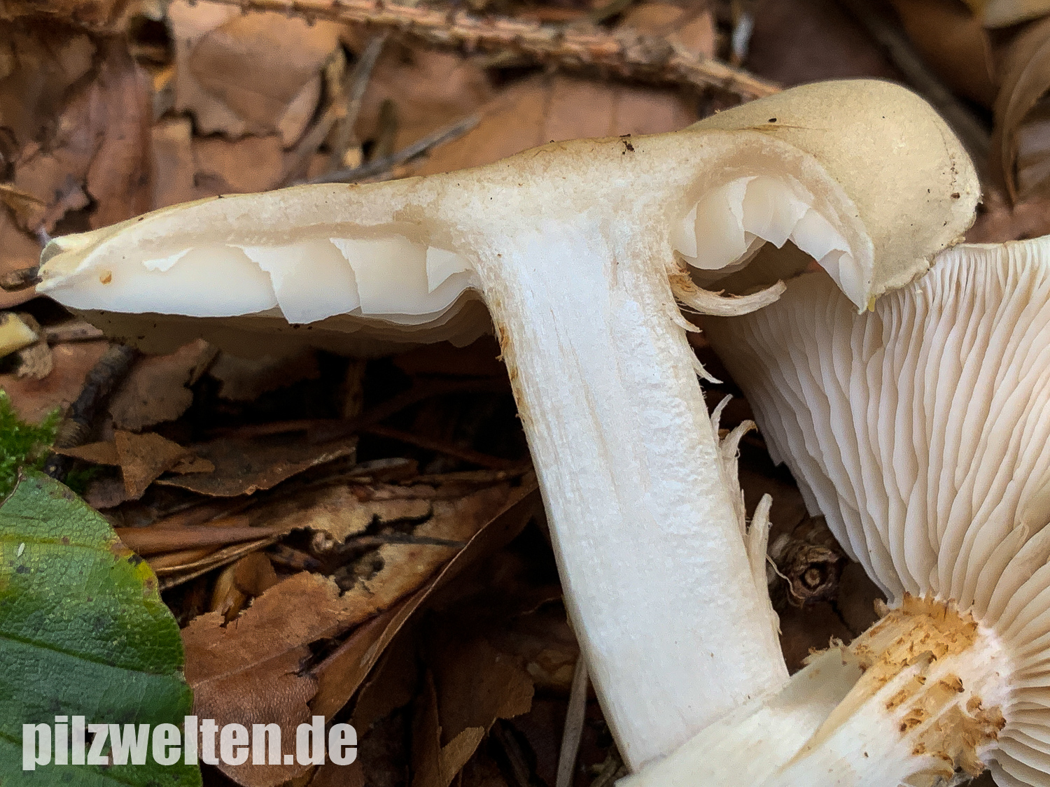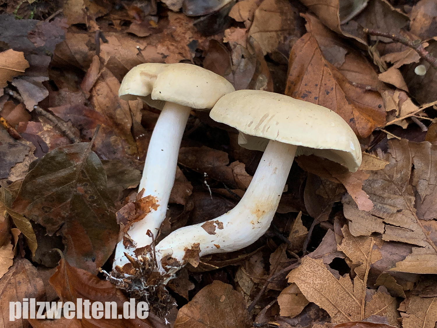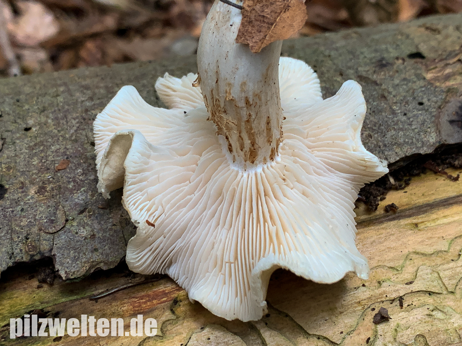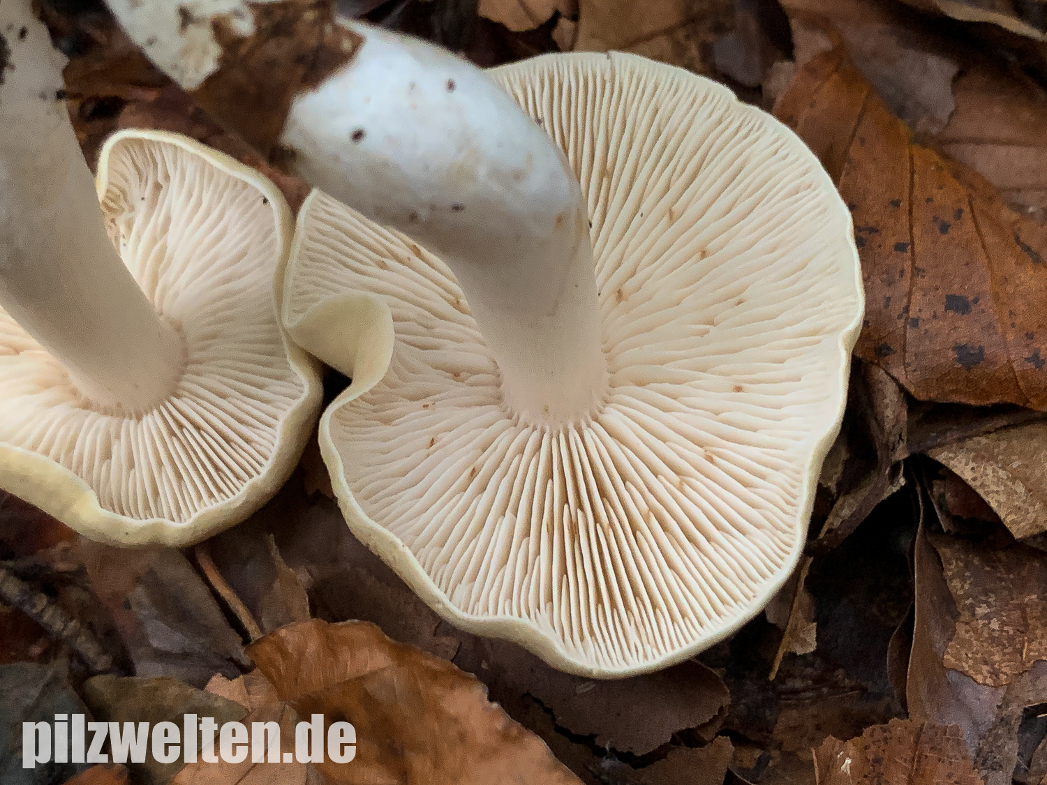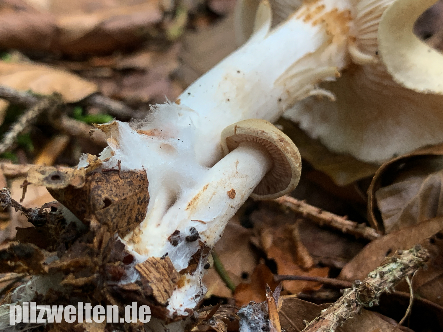 Besonderheiten: Bei zwei älteren FK jeweils etwas aufgerissener Stiel mit orangerötlichen Verfärbungen, Junge Fruchtkörper mit gleichmäßig gerade geformten Hut, ältere Fruchtkörper extrem wellig