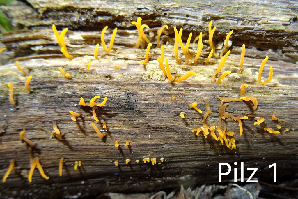 Pilz 1: Sieht aus wie Laubholzhörnlinge (Calocera cornea).
