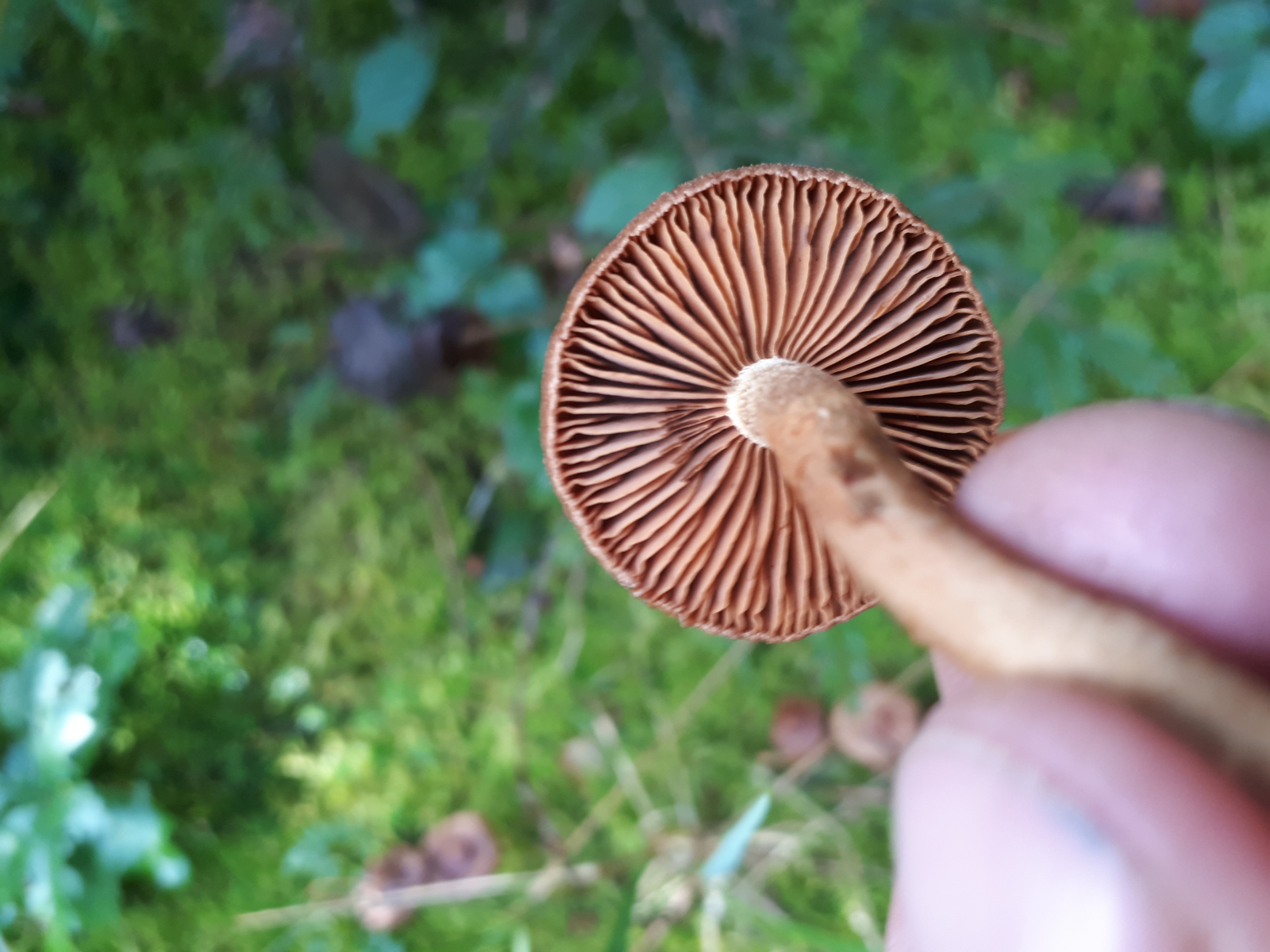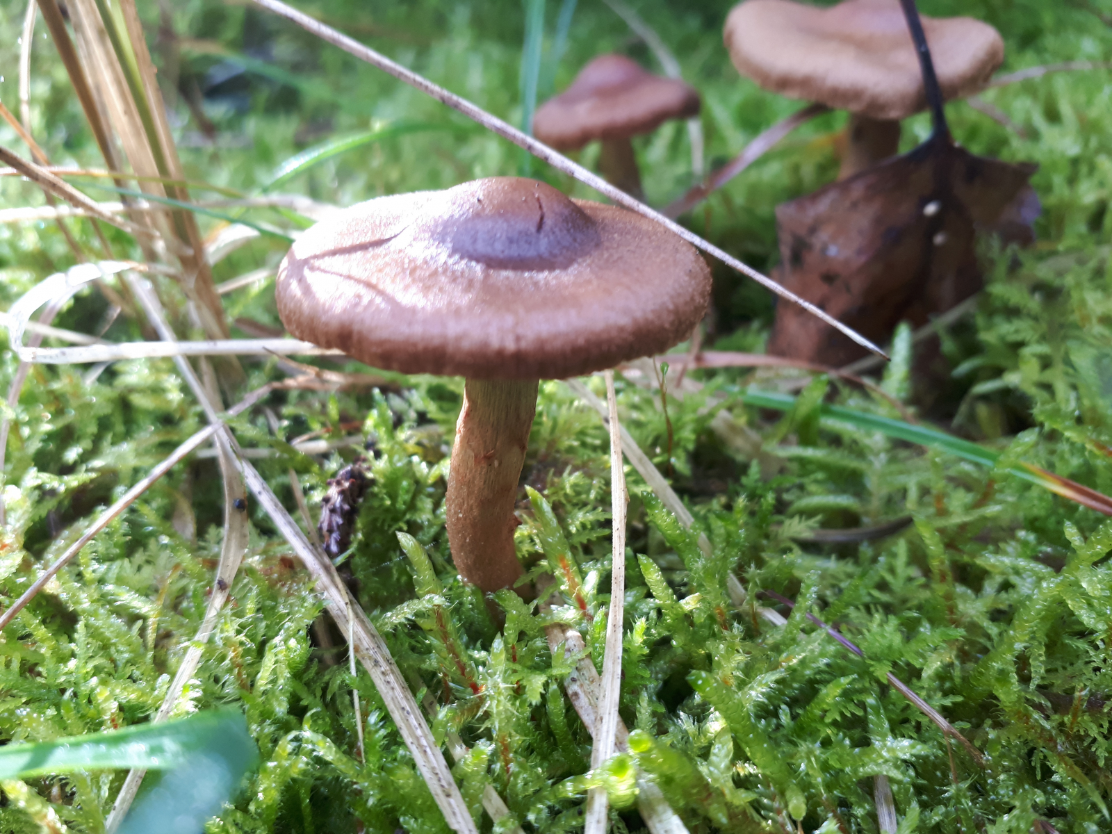 Sind die Hautköpfe (Dermocybe) hier ausgeschlossen? Da gibt es ja auch ein paar Arten mit so einem Buckel, vorwiegend Moorbewohner. Vielleicht wären die Lamellen bei einem noch jüngeren fruchtkörper ja doch irgendwie auffällig gefärbt?