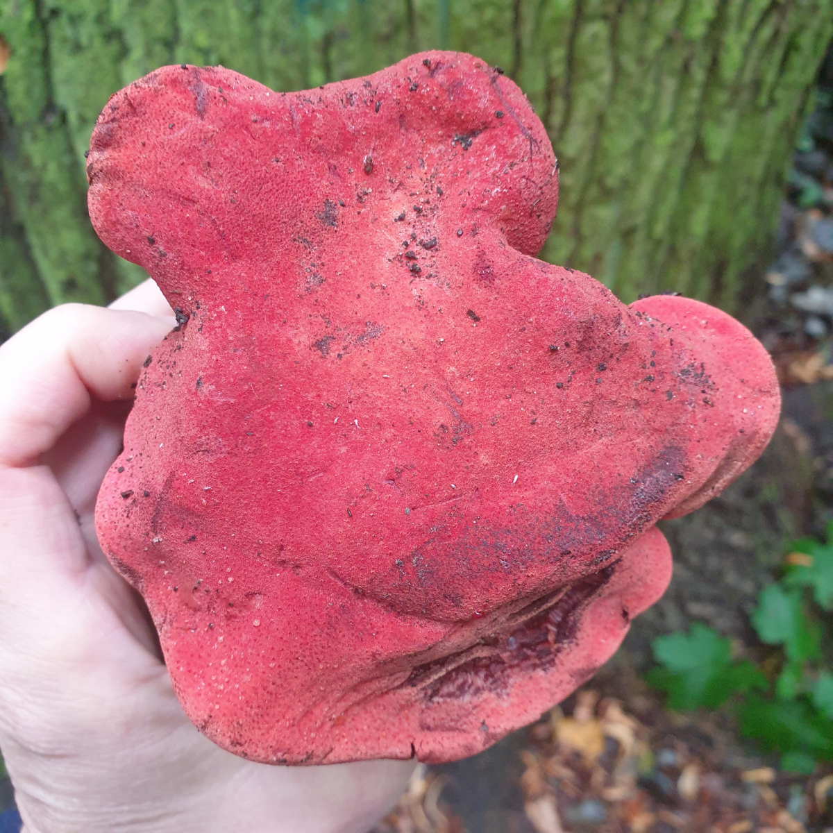 Der Pilz lag abgeschnitten oder abgefallen auf dem Boden. Möglicherweise ein Baumpilz? Die Erdreste am "Stiel" lassen aber er vermuten, dass er im Boden stand. Erde kann sich natĂŒrlich auch an BĂ€umen sammeln...Ich habe leider nicht ansatzweise ein Bild eines Pilzes im Internet oder BĂŒchern gefunden, was ungefĂ€hr passen könnte und wĂŒrde mich sehr freuen, hier Hilfe von den Profis zu bekommen!