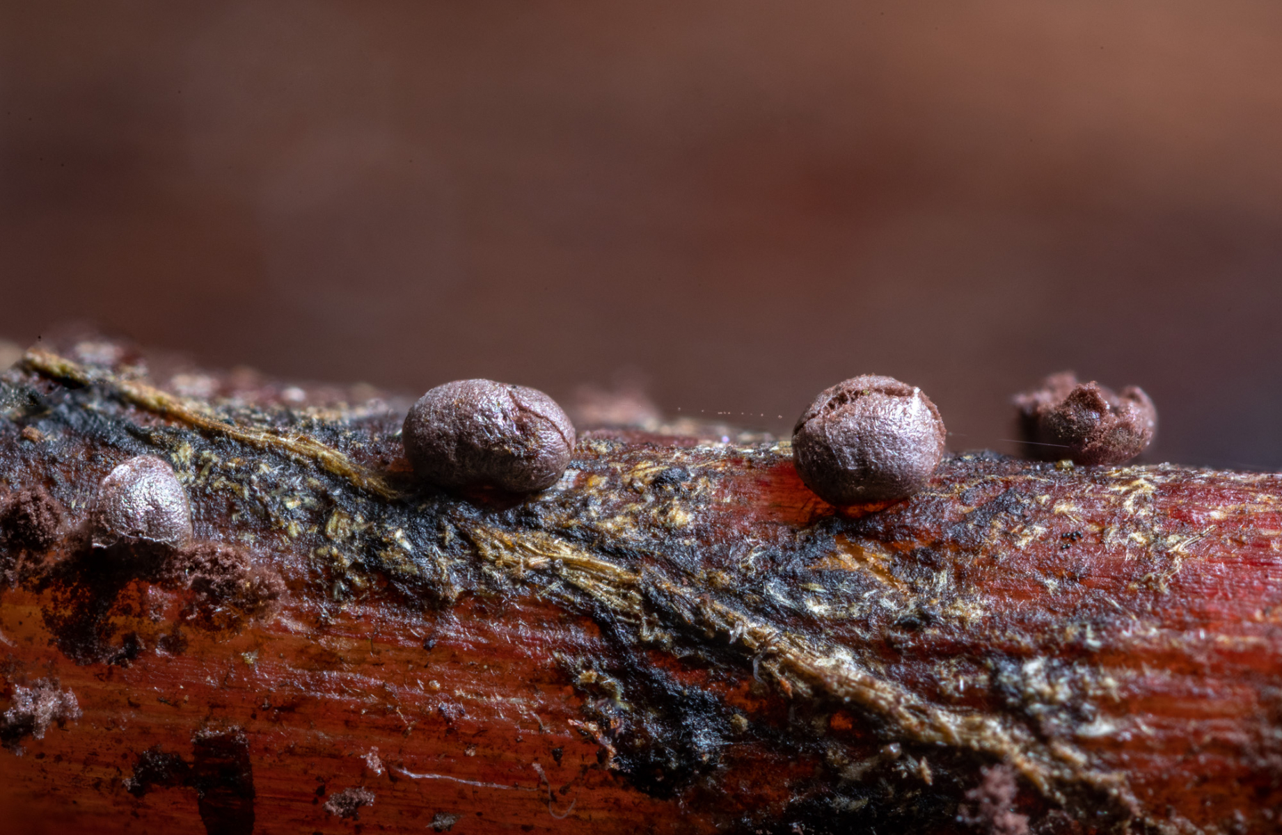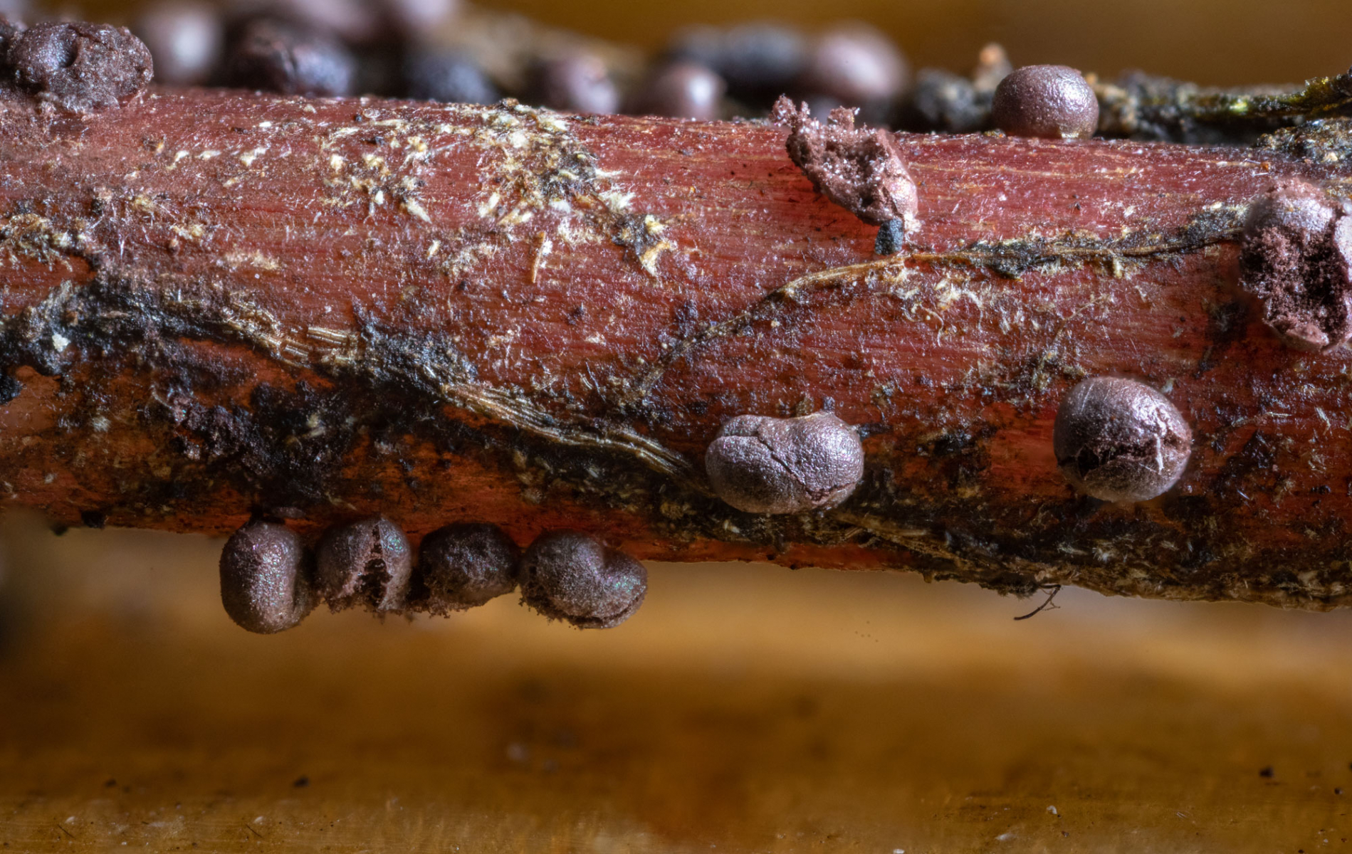 Die Peridie erscheint dünn und ist irisierend. Aufgrund der makroskopischen Merkmale tippe ich auf Calomyxa metallica.