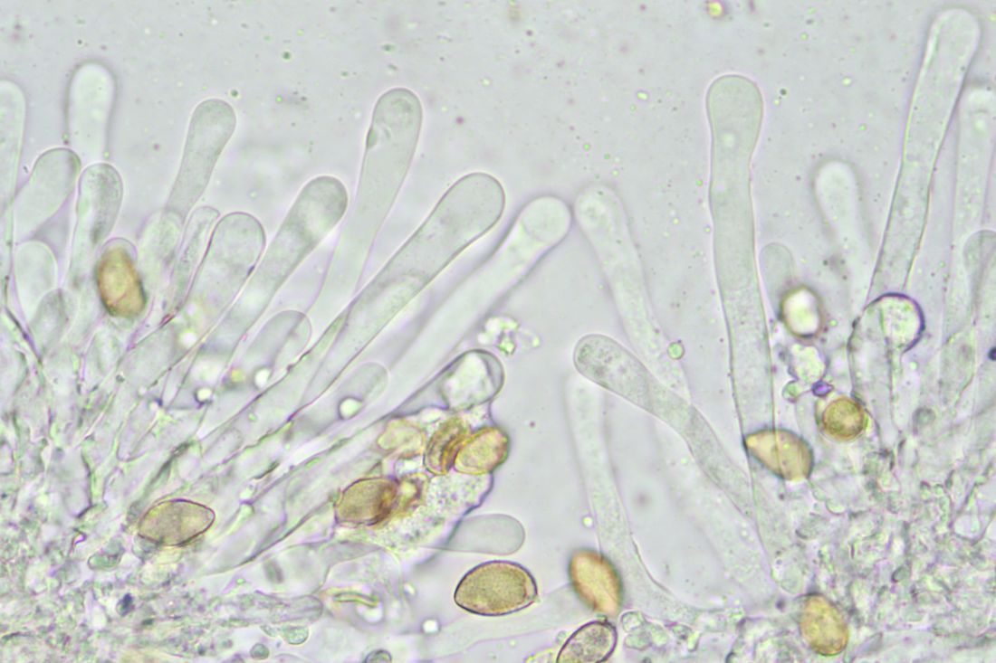 8. Cheilozystiden länglich und am Kopf etwas dicker. Größe 44-87 x 5-8 Mikrometer erst einmal habe ich nur 12 Cheilozystiden gemessen.