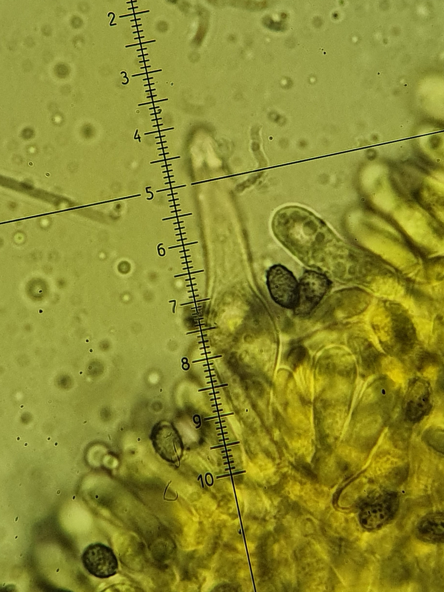 Schwer fällt mir auch die Einordnung "Makrozystiden", da Münzmey für die Hymenialzystiden hier die Grenze bei genau 60µm zieht. Die Pleurozystiden sind so ziemlich genau 60µm, die Cheilos wirken kürzer wobei sie auch nicht bis zur Basis zu beurteilen waren. Deutlich längere Zystiden mit z.B. bis zu 100 µm lang waren nicht zu finden.