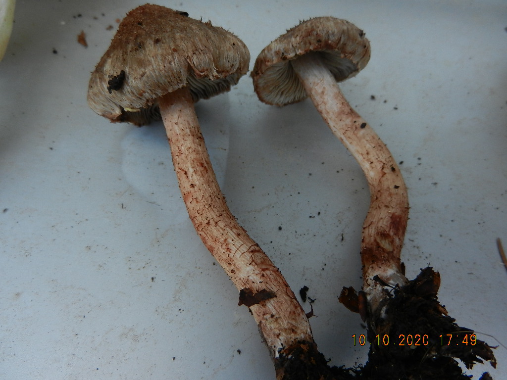 ziemlich groß (Höhe der hier gezeigten Exemplare ca. 8 cm, Hutbreite 4 cm), Hut grau, ziemlich struppig, im Alter felderig aufreißend, Stiel mit auffallend fleischbräunlichen Tönen