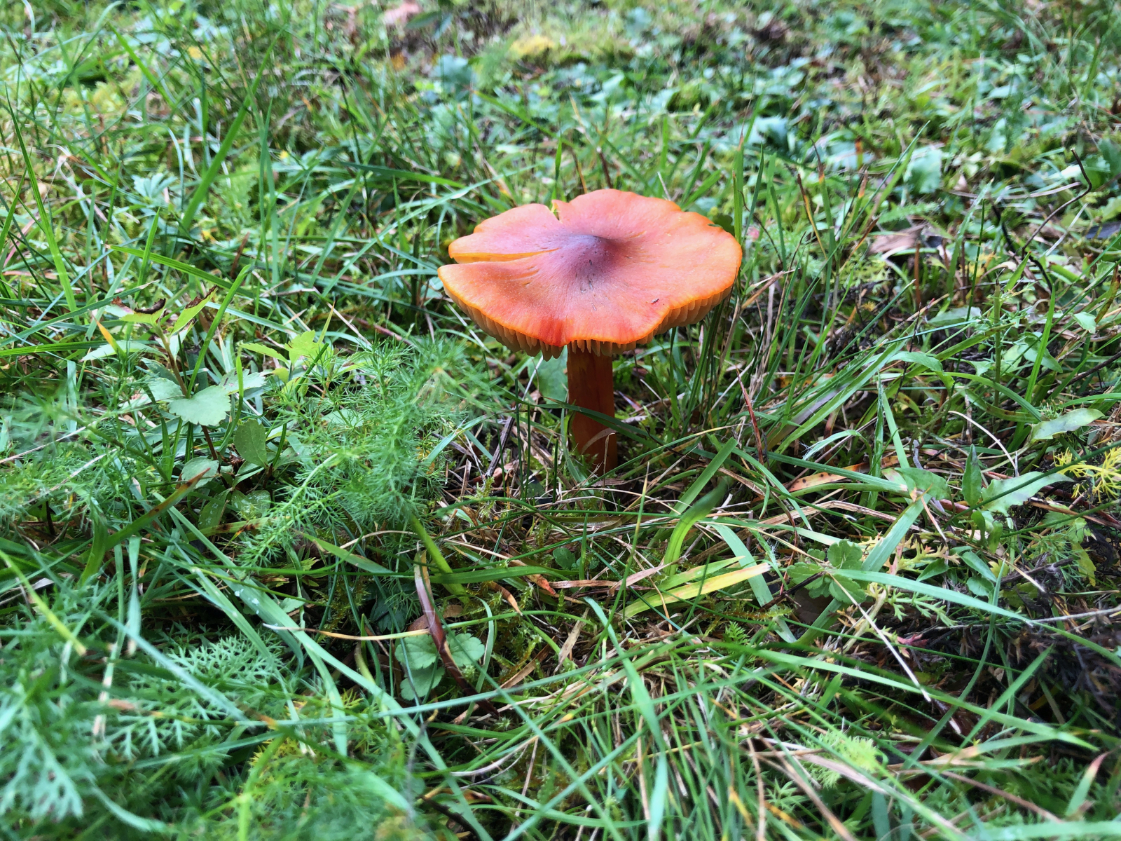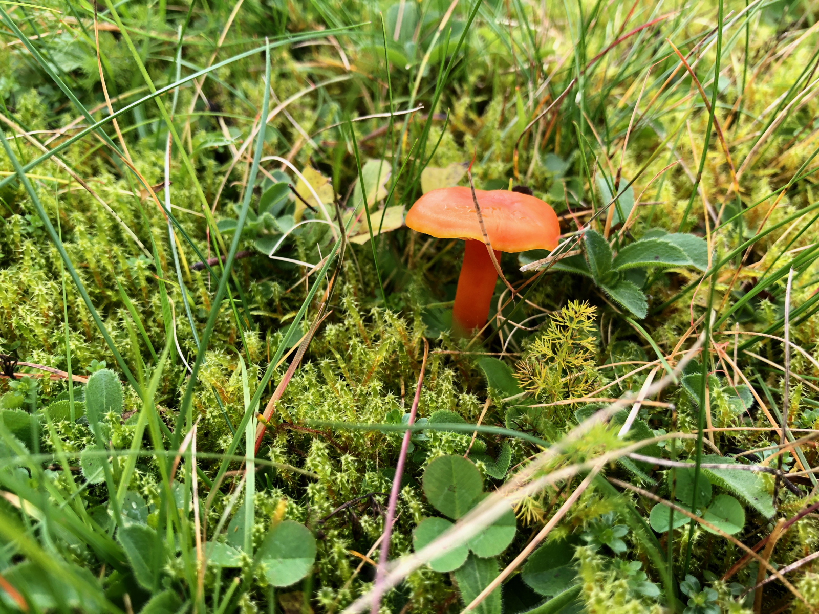 Bei diesem Pilz bin ich mir ziemlich sicher, dass es sich um den Granatroten Saftling - Hygrocybe punicea handelt.
