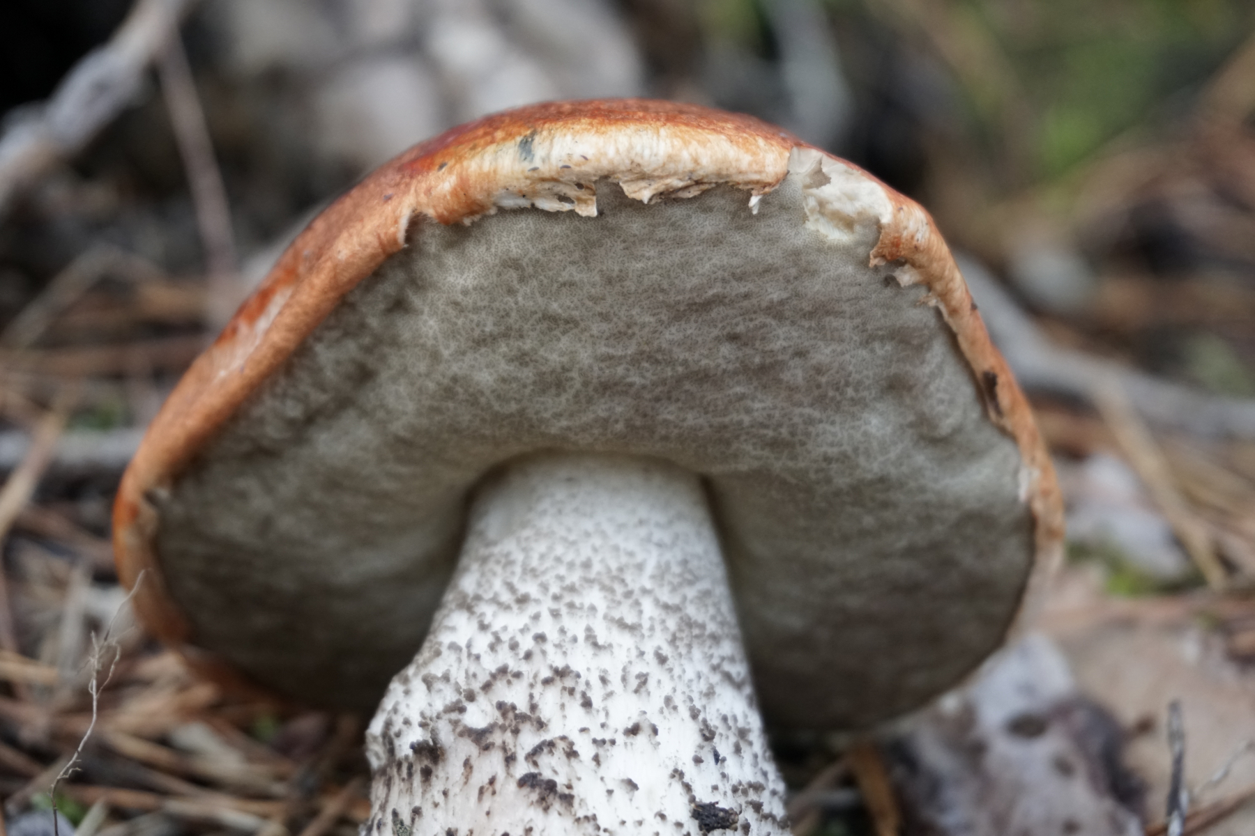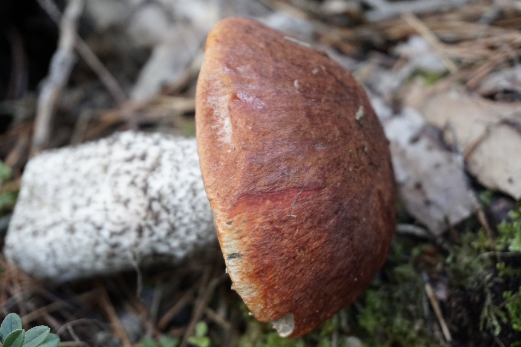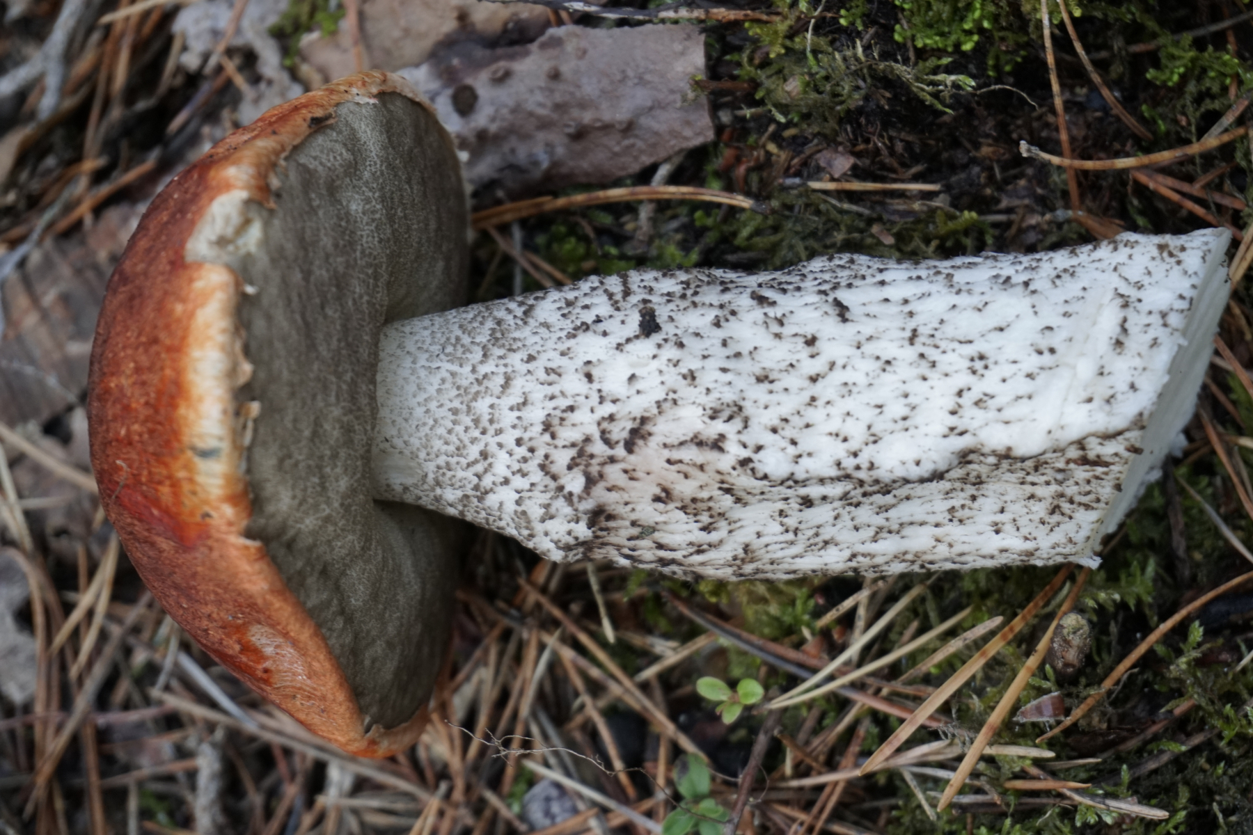 das sieht für mich wie ein typsches Leccinum piceinum aus, die nicht nur bei Fichte, sondern auch bei Kiefer wachsen kann. Typisch sind die alt schwarzen Stielschuppen (bei L. vulpinum nur rotbraun werdend), die früh grau verfärbenden Poren (wie bei der Heiderotkappe - aber da ist der Hut zu dunkel) und das nur schwach schärzende Fleisch (das man hier nicht sieht - das betrifft alle Nadelwaldrotkappen).