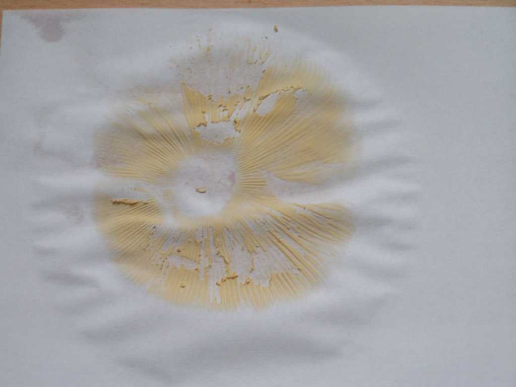 (3) Lege einen Pilzhut über Nacht auf ein weisses Blatt Papier und decke das ganze mit einem Glas oder einer Schüssel ab ---> Der Pilz sport aus und du hast die Farbe des Sporenpulvers. Bitte fotografiere das und zeige uns dann ein Bild davon