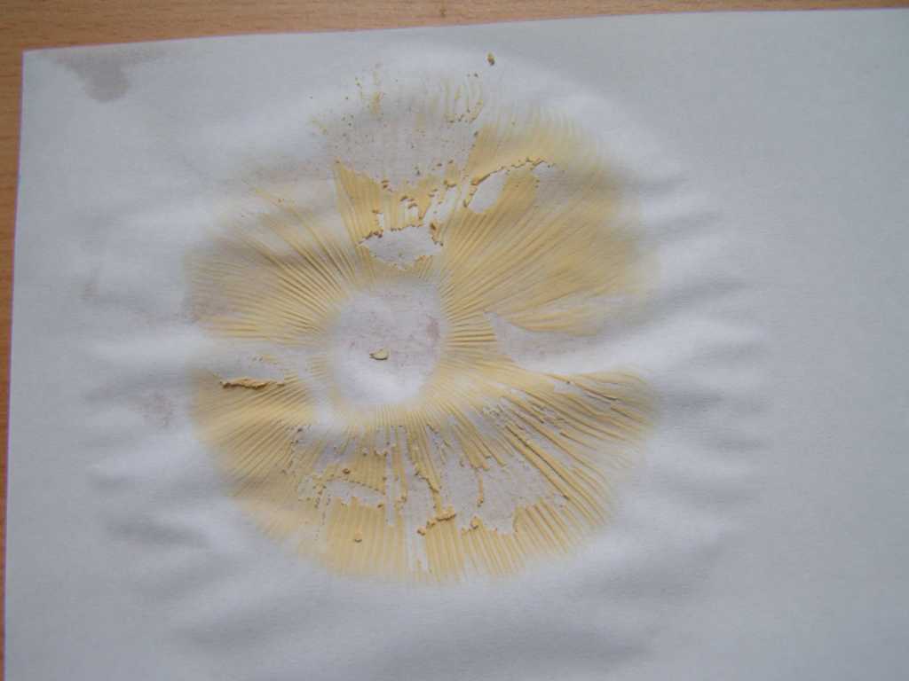 (3) Lege einen Pilzhut über Nacht auf ein weisses Blatt Papier und decke das ganze mit einem Glas oder einer Schüssel ab ---> Der Pilz sport aus und du hast die Farbe des Sporenpulvers. Bitte fotografiere das und zeige uns dann ein Bild davon