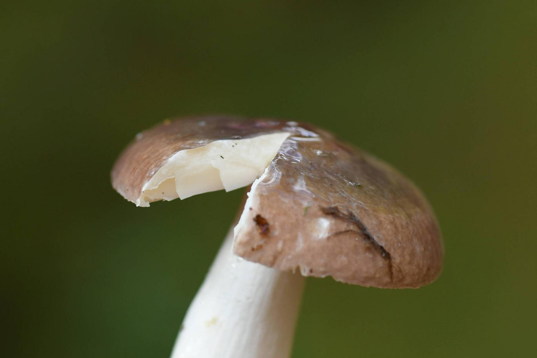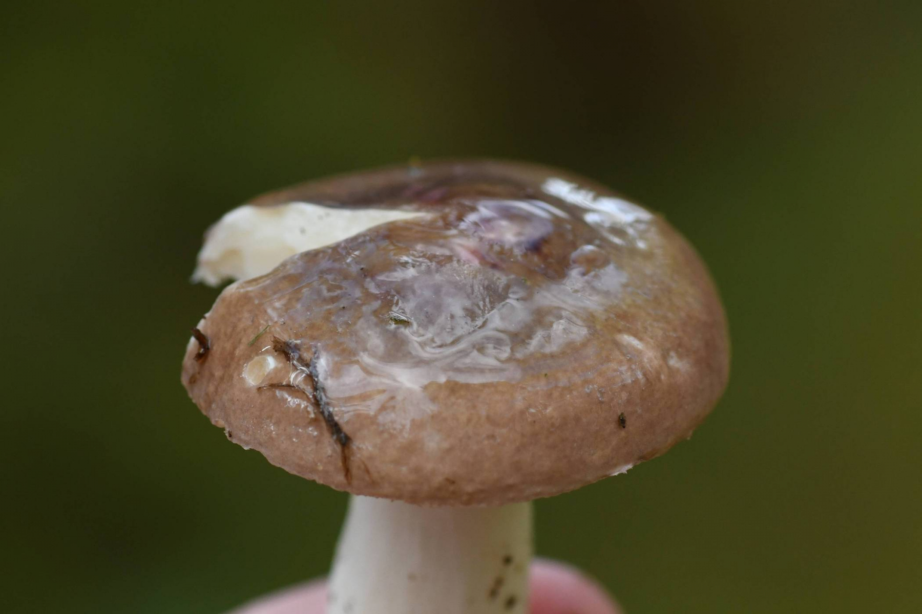 Huthaut feucht schleimig, trocken fein samtig, Mitte grünlich, Rand blass rosa; etwa 50% bis 2/3 abziehbar