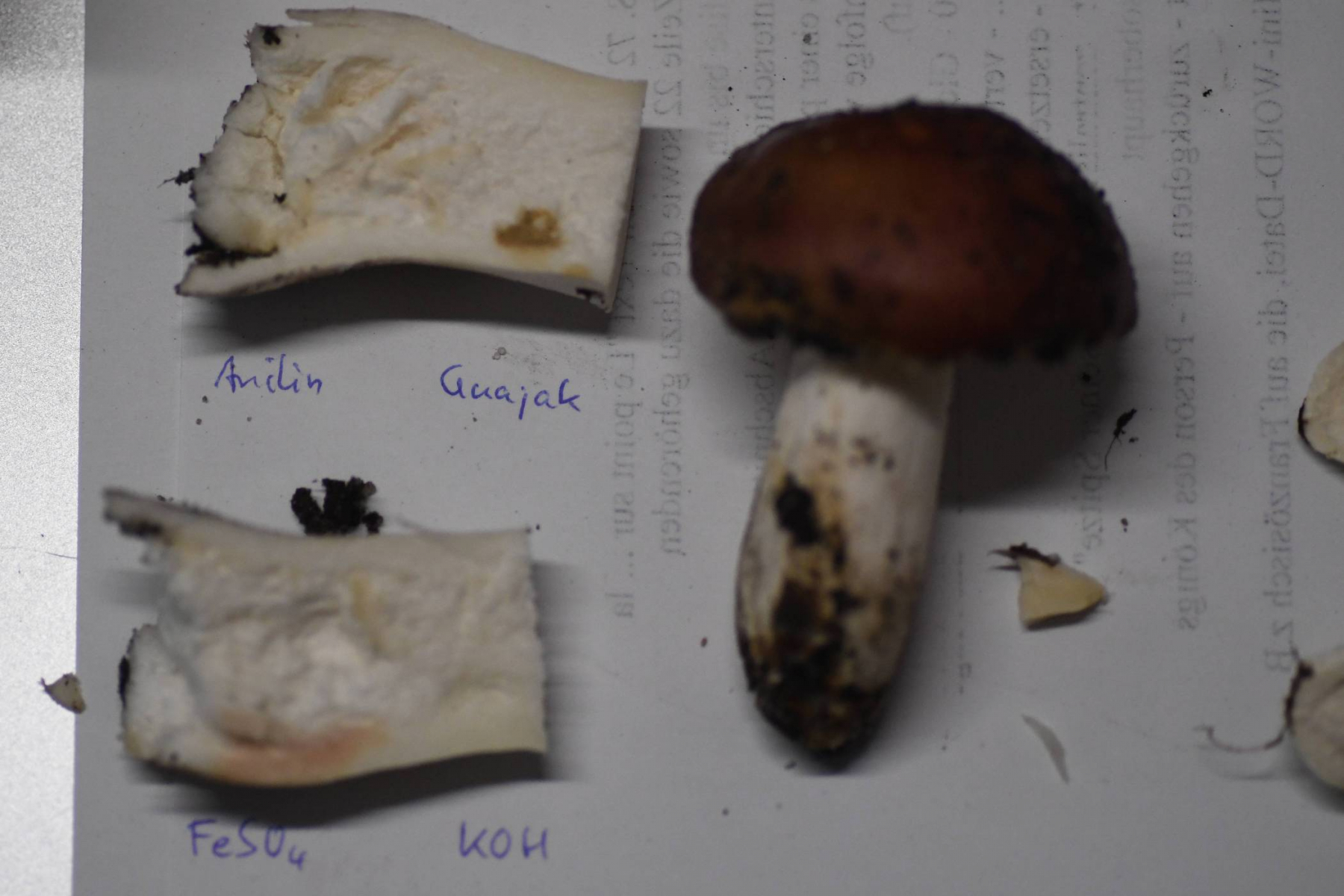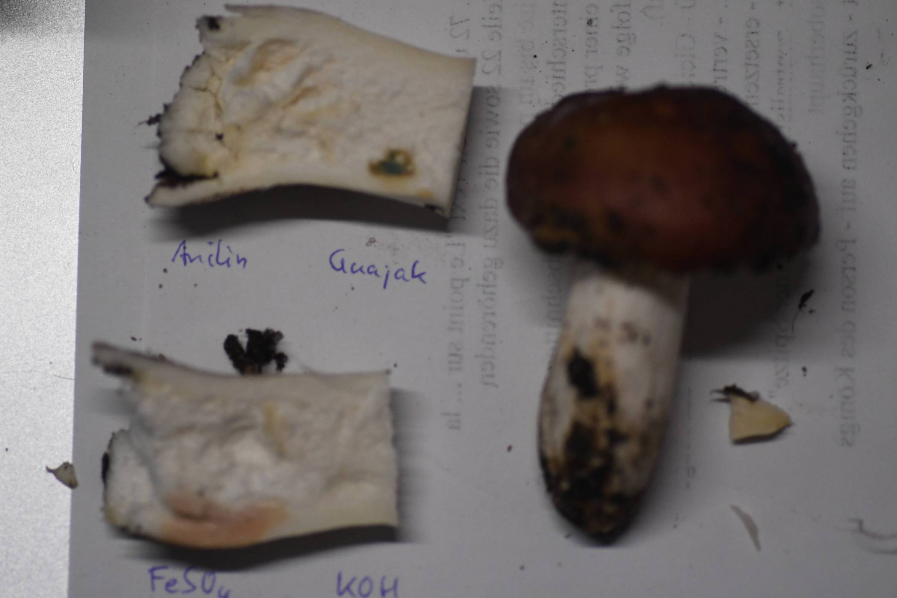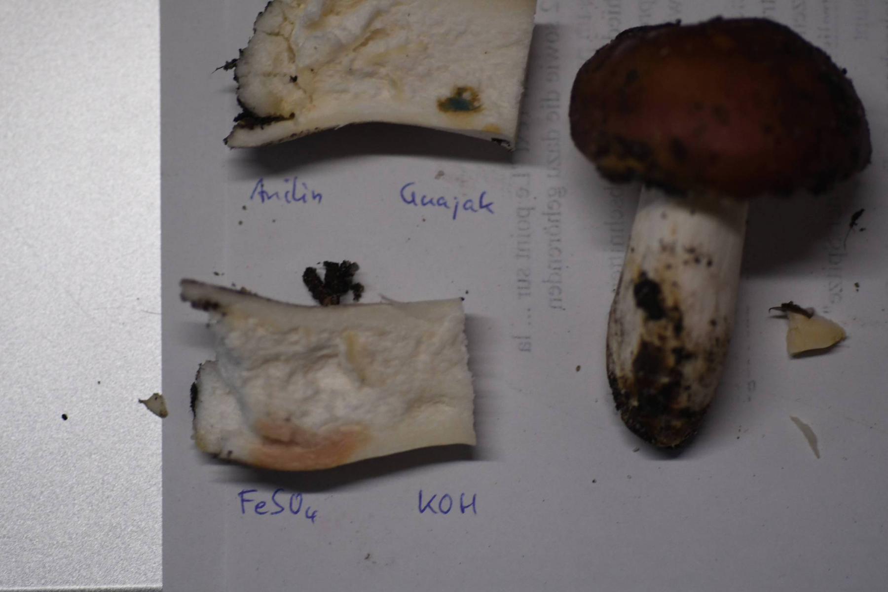 Chemische Reaktionen: FeSO4 anfangs blassrosa, später bräunlich rosa; KOH keine Reaktion; Anilin blass gelb, nach 10 min orangebraun; Guajak olivgrün, rtelativ hell bleibend