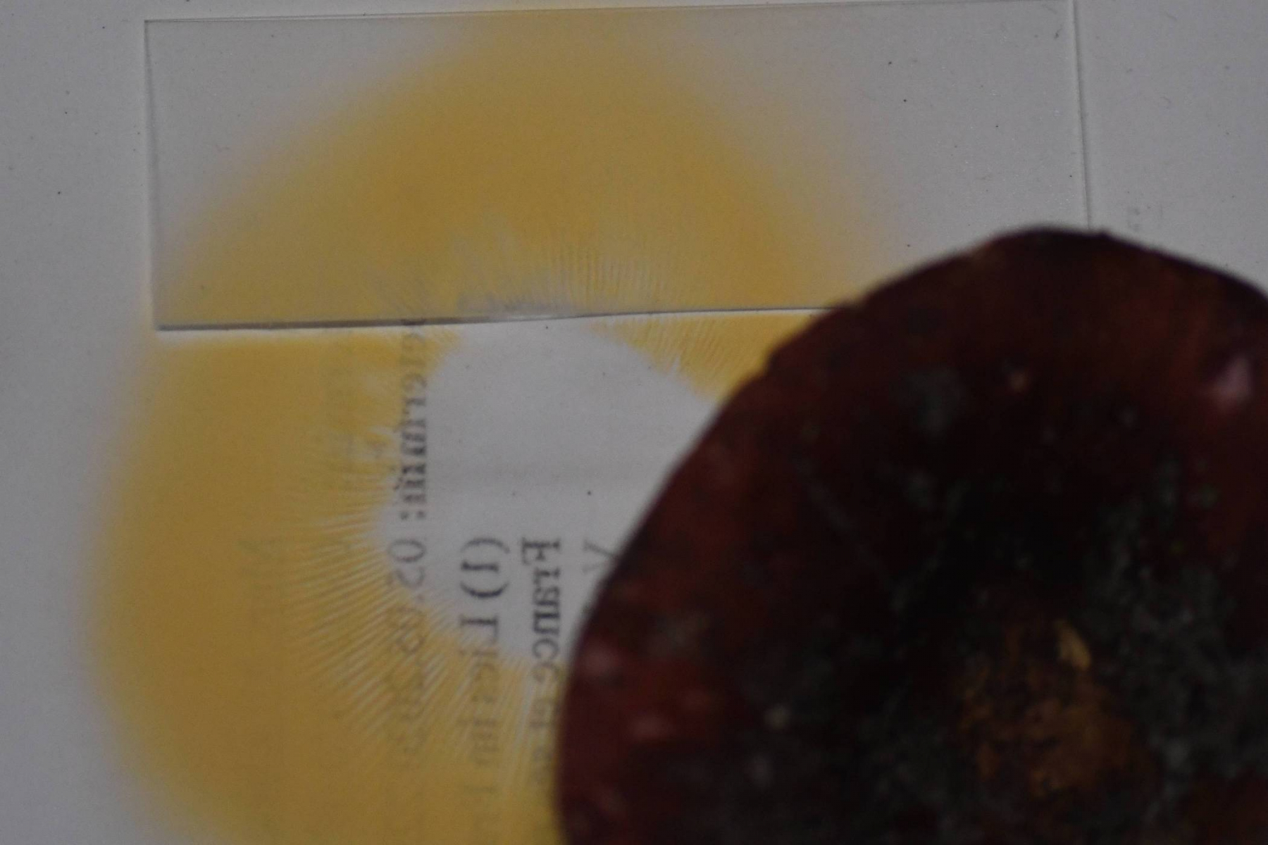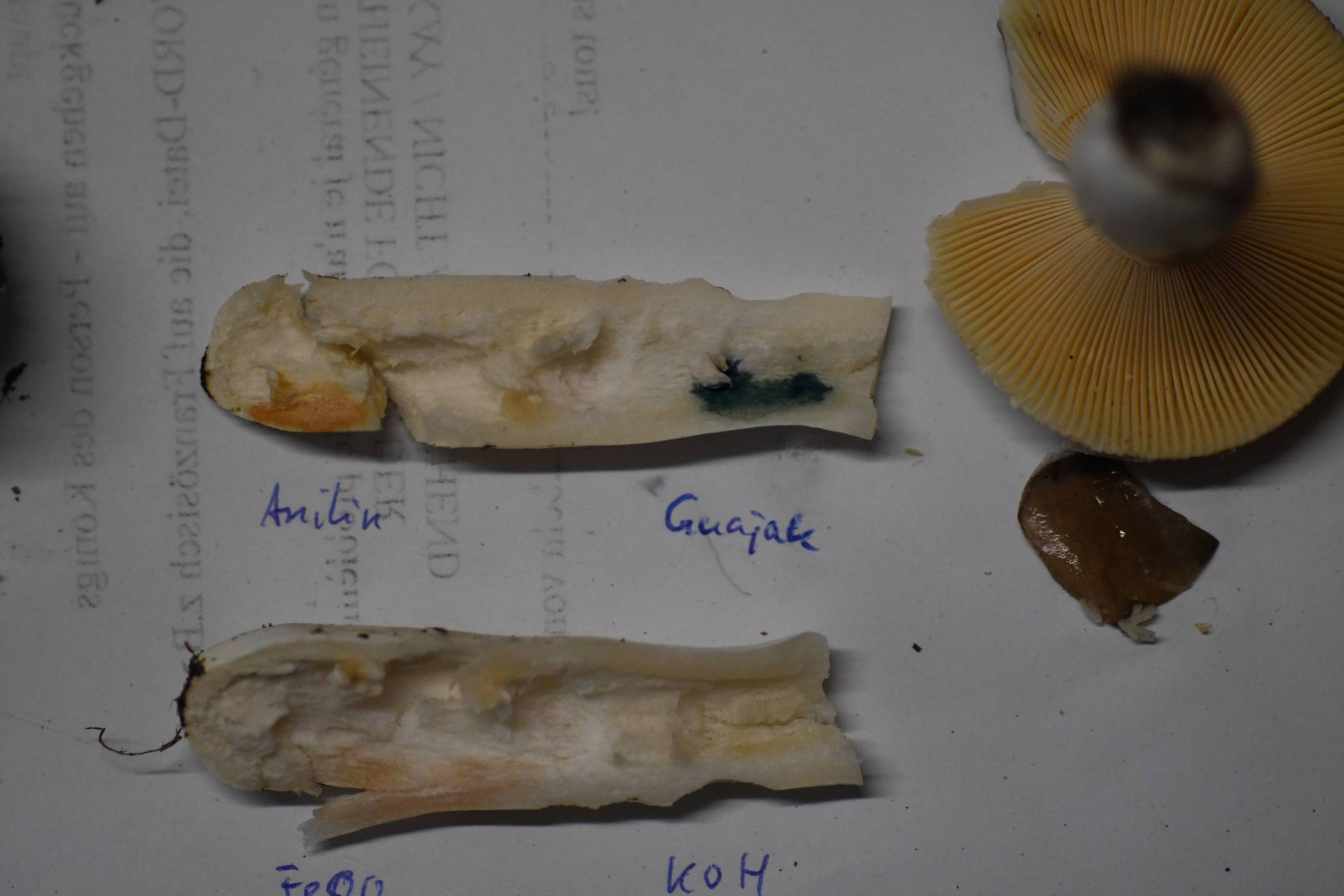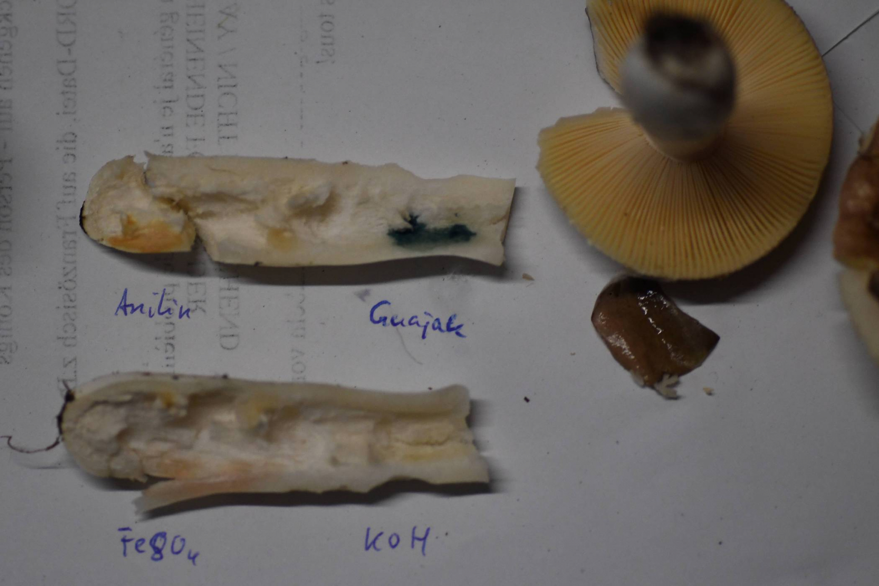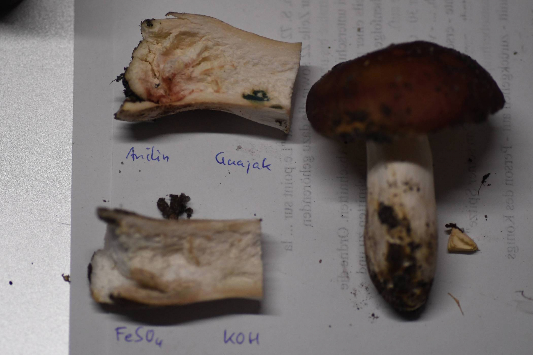 Chemische Reaktionen: FeSO4 anfangs blassrosa, später bräunlich rosa; KOH keine Reaktion; Anilin blass gelb, nach 10 min orangebraun; Guajak olivgrün, rtelativ hell bleibend