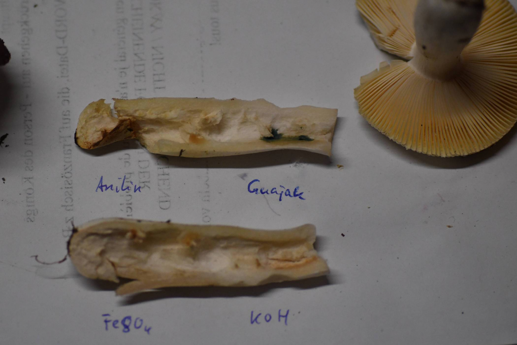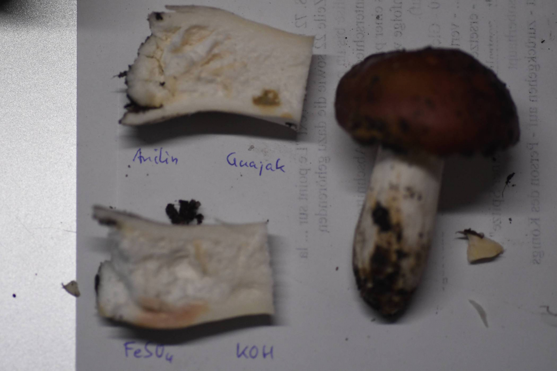 Chemische Reaktionen: FeSO4 anfangs blassrosa, später bräunlich rosa; KOH keine Reaktion; Anilin blass gelb, nach 10 min orangebraun; Guajak olivgrün, rtelativ hell bleibend