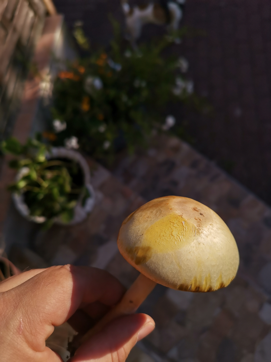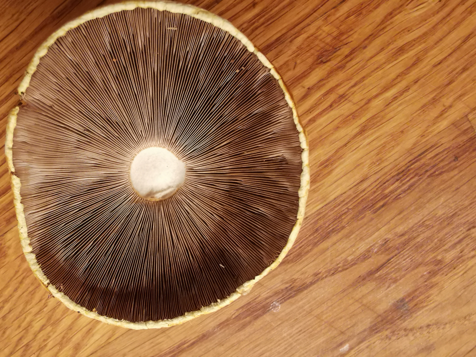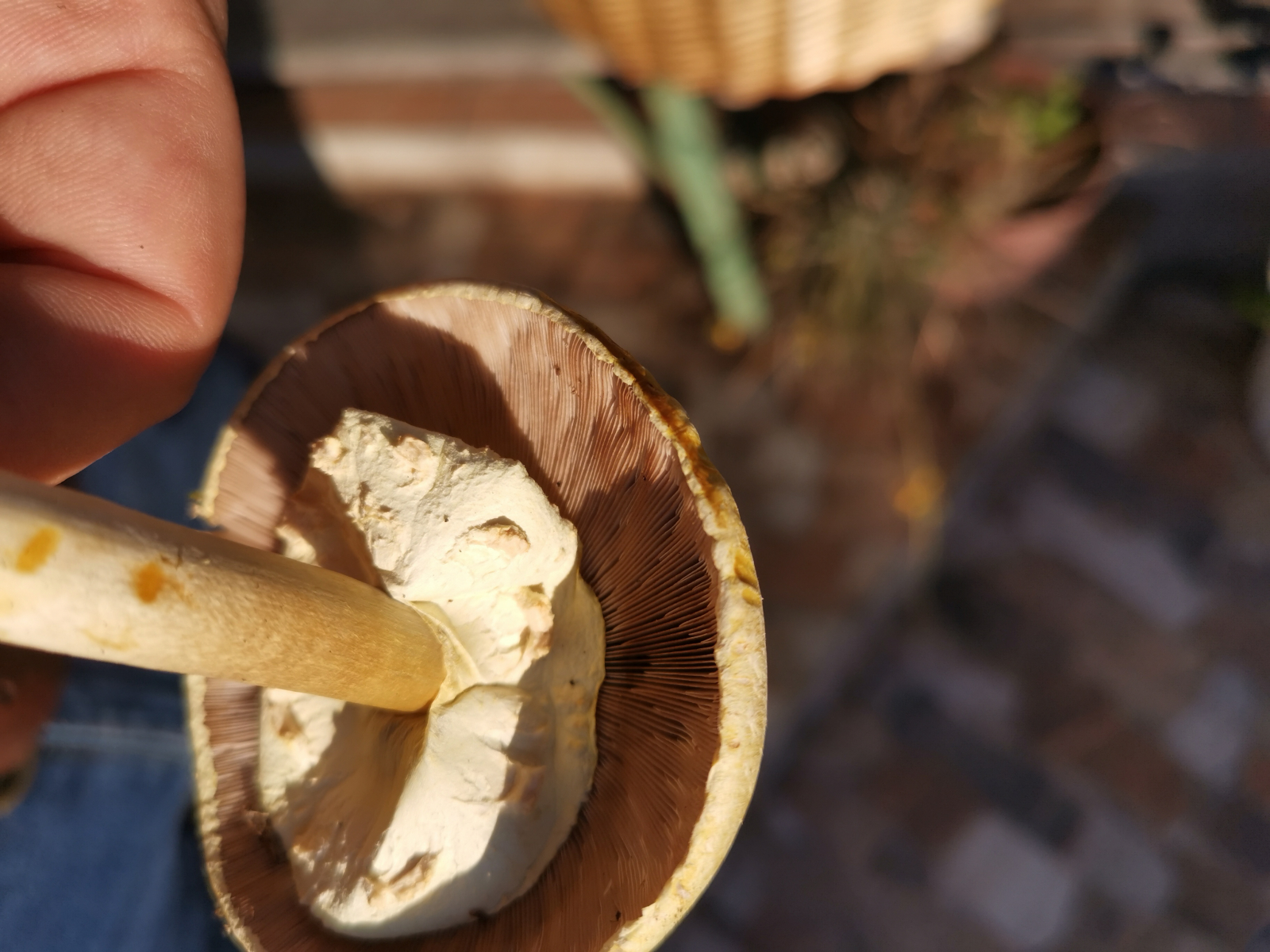 Beim reiben des Hutes oder Stils verfärbte ernsich langsam gelblich und blieb auch nach längerem Warten gelb. An den verfärbte Stellen roch er herrlich nach Anis/Mandel. Bei diesem Exemplar sieht man auch das sternenförmige Velum sehr gut.