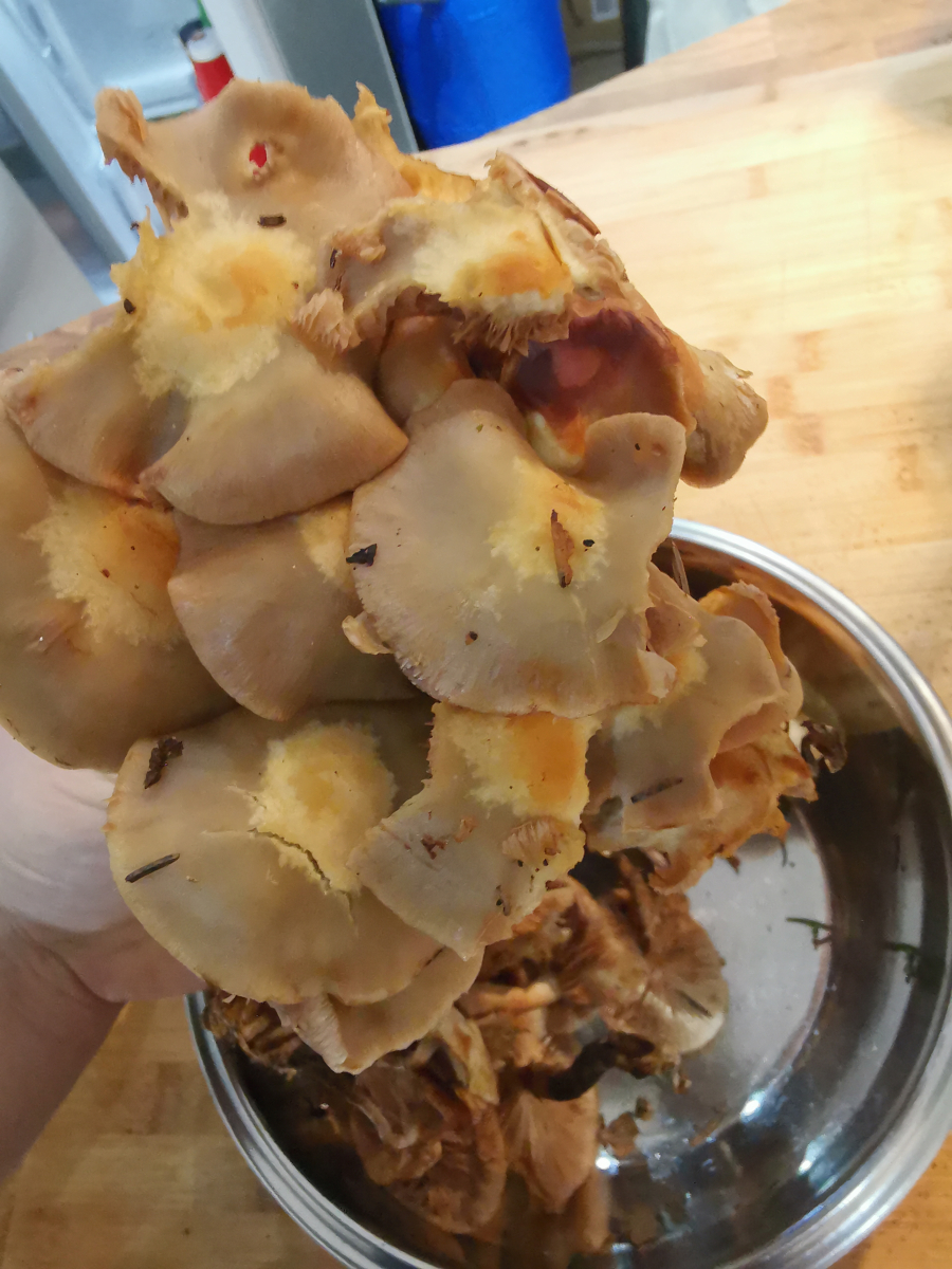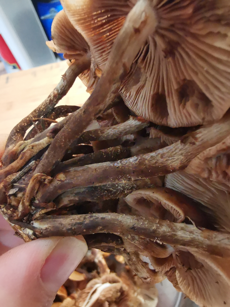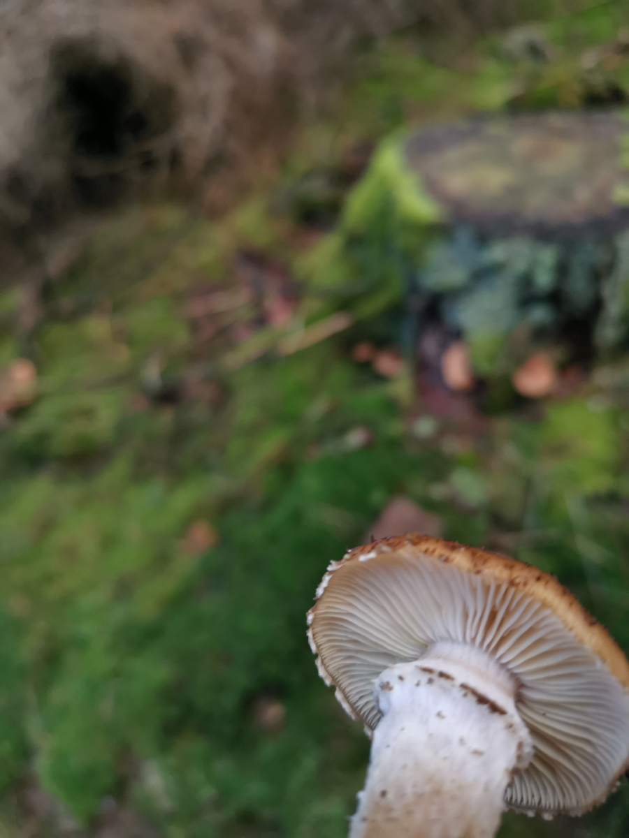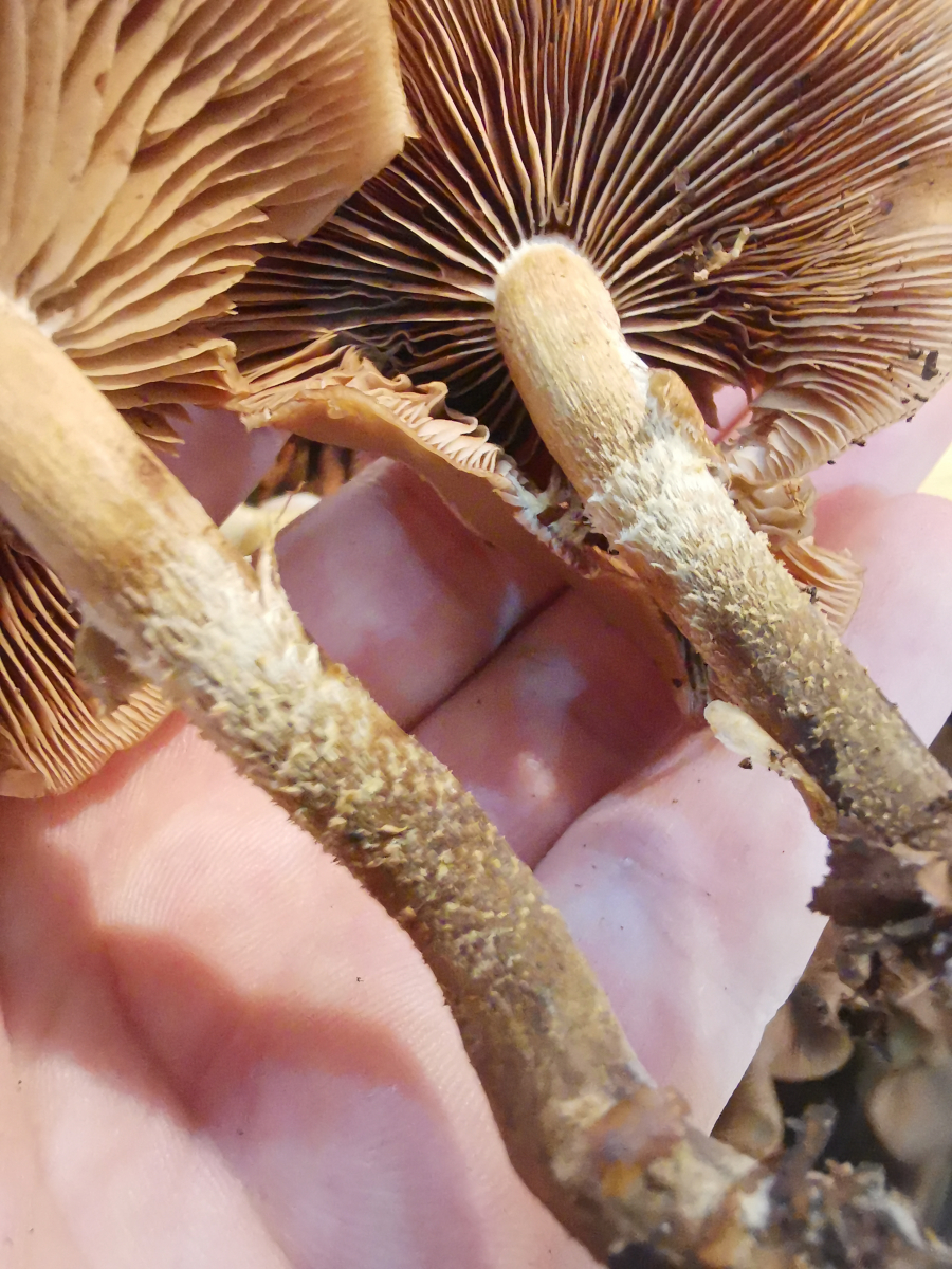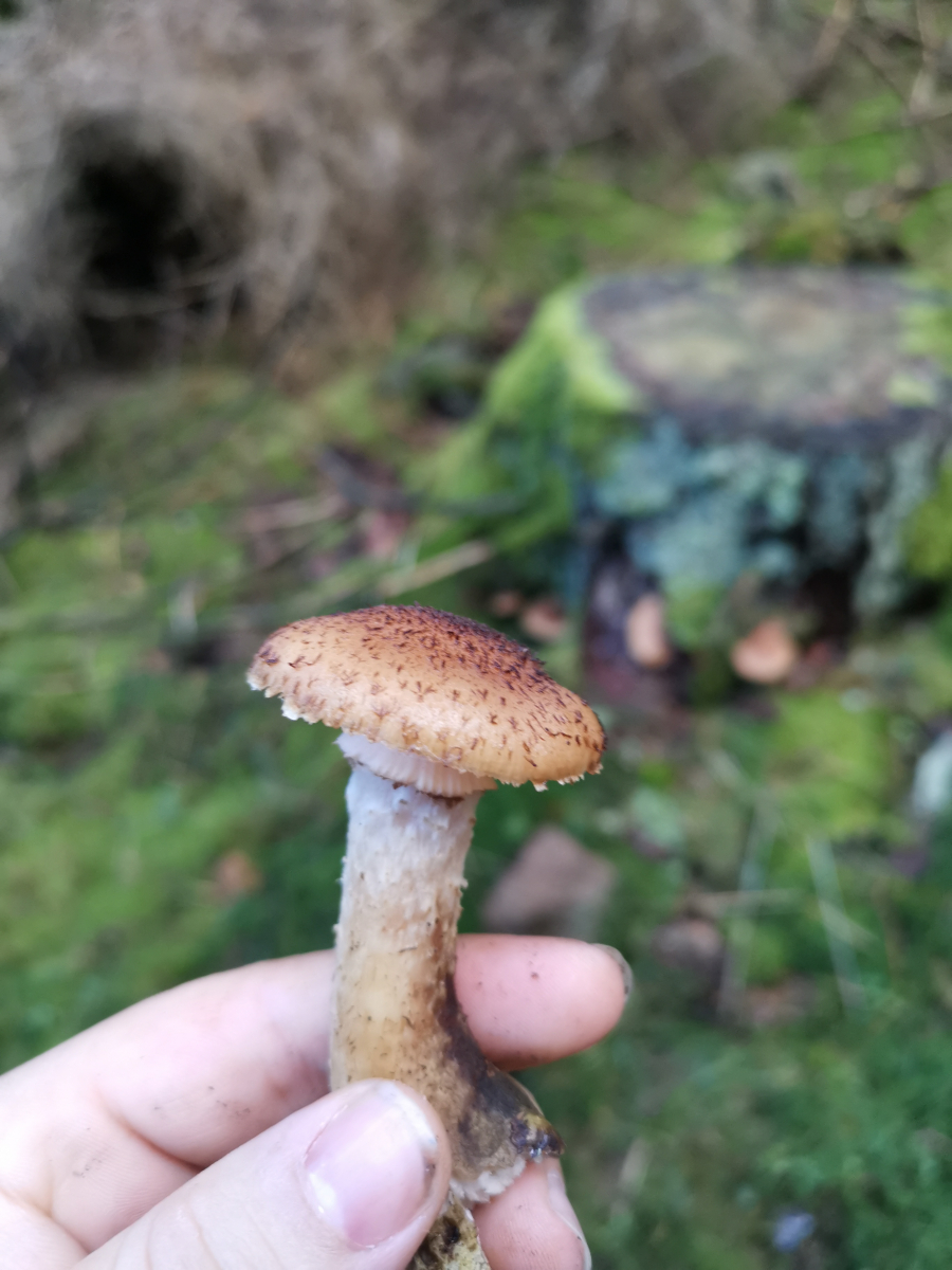 Hier bin ich mir ziemlich sicher auf meine erste Gruppe Stockschwämmchen gestoßen zu sein. Die Schuppung am Stil und die Hygrofanität des Huts sind deutlich zu sehen. Auch der glatte Bereich über dem Ring ist bei einigen gut erkennbar und sie wachsen deutlich in Büschel. Sie waren schön fest und dufteten angenehm pilzig/würzig.
