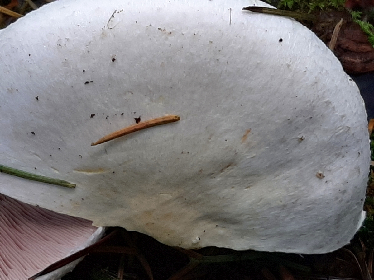 Hut: 15cm, fleischig, hellweiß mit grünlichgrauer Mitte, Huthaut leicht radialfaserig, überall, vor Allem am Rand, etwas befasert, etwas überstehend.
