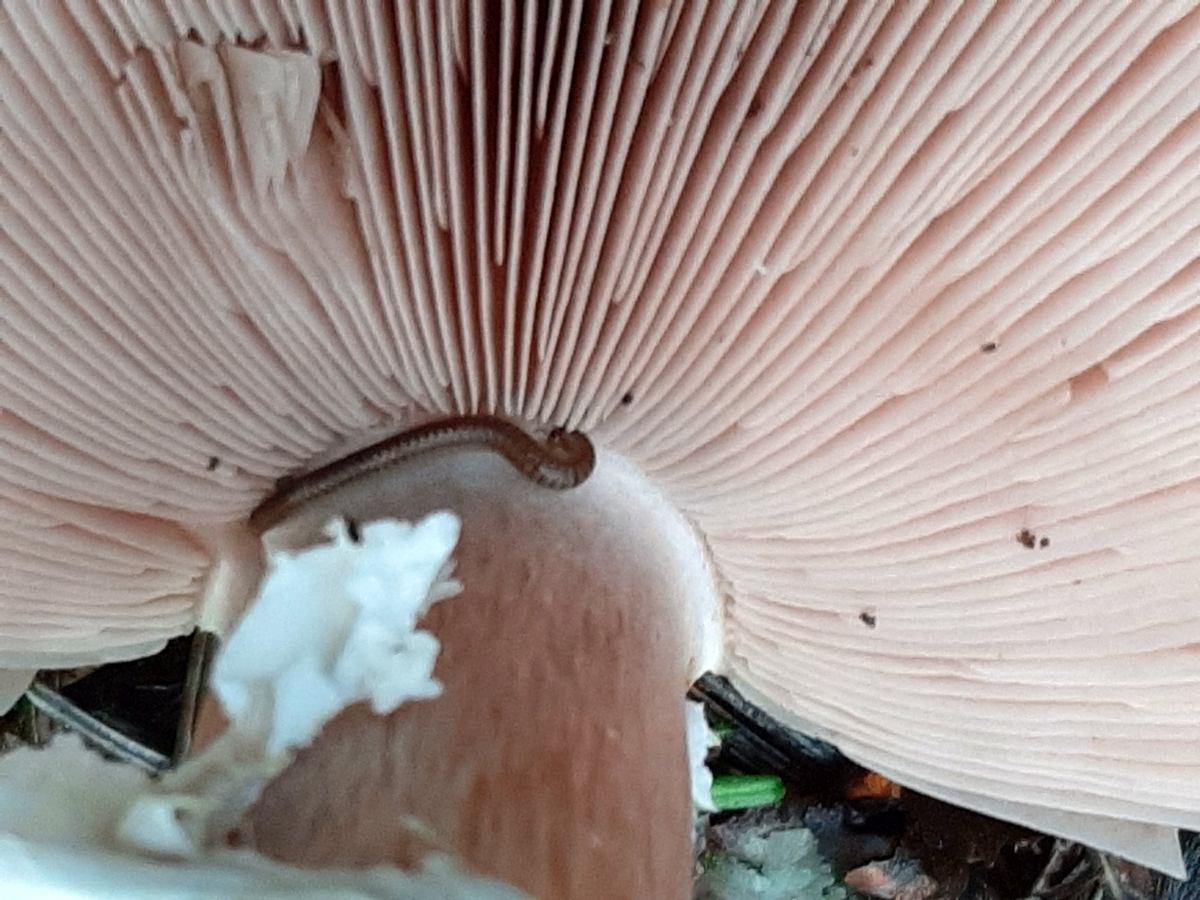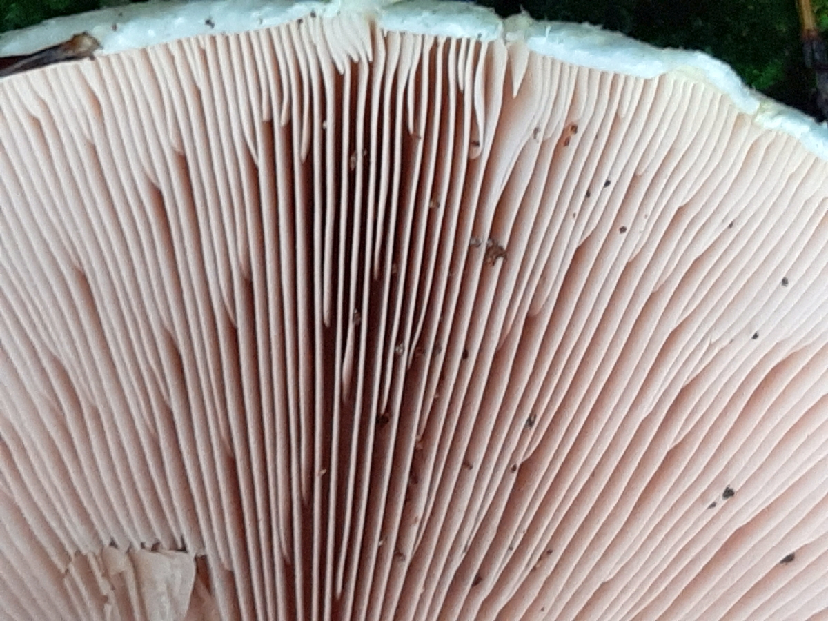 Lamellen: hellrosa, gedrängt, am Stiel frei, viele Zwischenlamellen, breit.