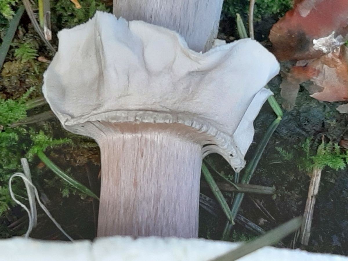 Stiel: 15 x 3 cm, hohl, weiß mit rotvioletter Überfaserung, Basis leicht knollig verdickt, nicht abgeknickt, im Schnitt safranfarbig verfärbend, vor Allem in der Basis.
