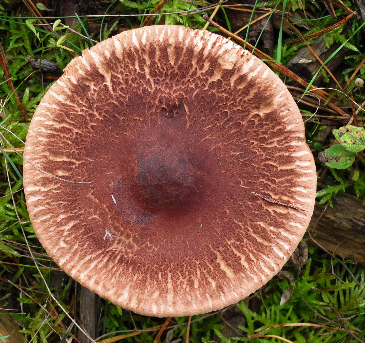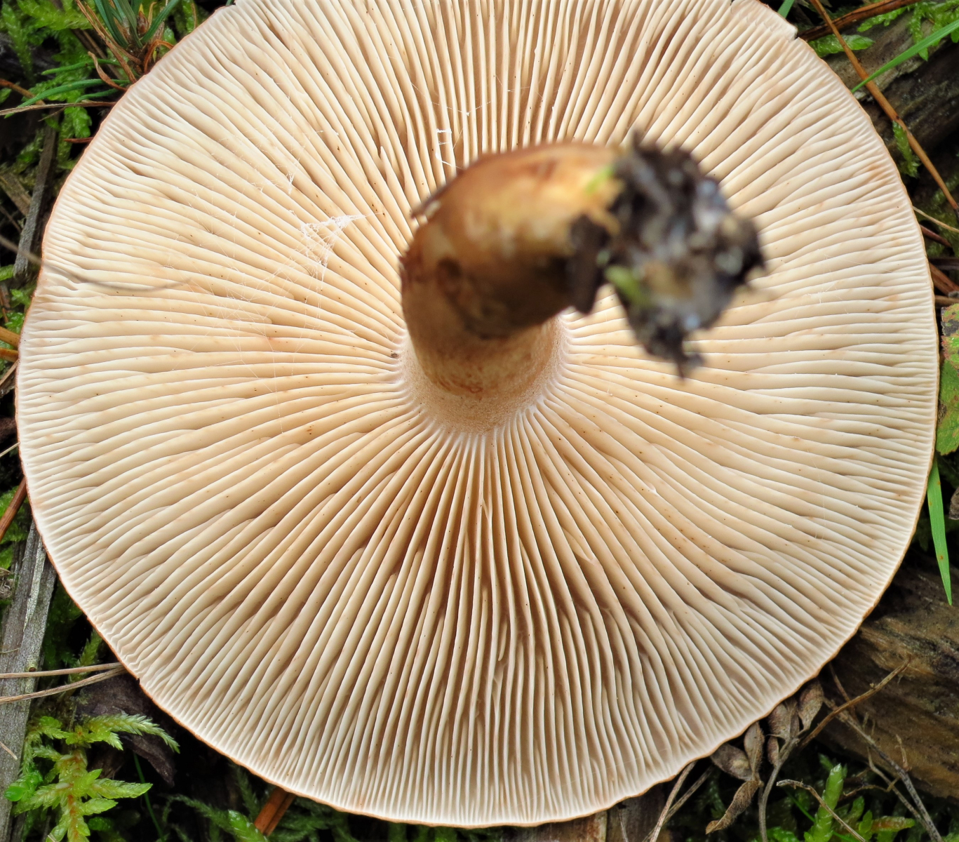 Lamellen: jung weiß, alt hell creme. Breitblättrig und eng stehend, mit Zwischenlamellen und etwas am Stiel herablaufend.
