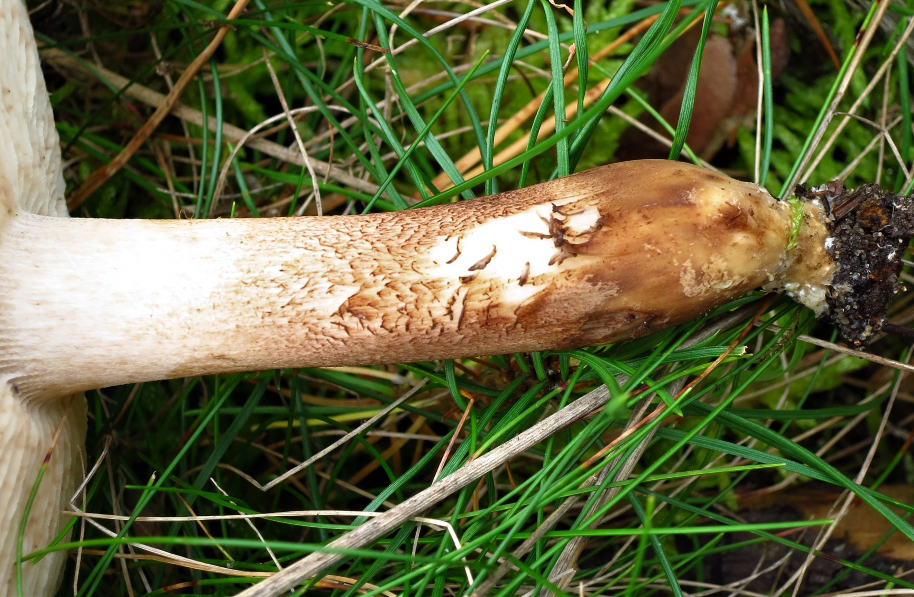 Stiel: kräftig, fest, bis 13cm lang und gerade. Bei alten FK, oben fast weiß, dann beige bis braun zur Basis hin, leicht genattert. Beim größten FK in der Mitte hohl werdend. Stielbasis spitz/wurzelnd. Ohne Ring mit braunem Myzel. Das Stielfleisch war im oberen Drittel weiß und dann beige bis braun werdend.