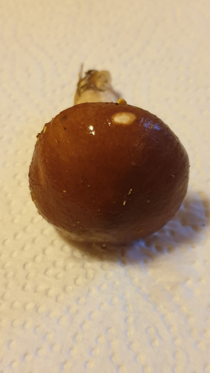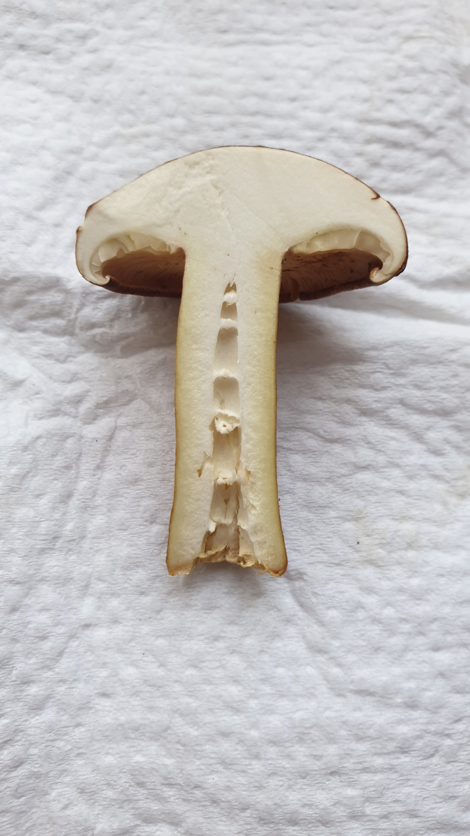 Ein anderer Pilz sieht beim flüchtigen Hinsehen, solange er im Boden wurzelt, fast aus wie ein Maronenröhrling, hat aber einen hohlen Stiel und Lamellen. Könnt Ihr den bestimmen?