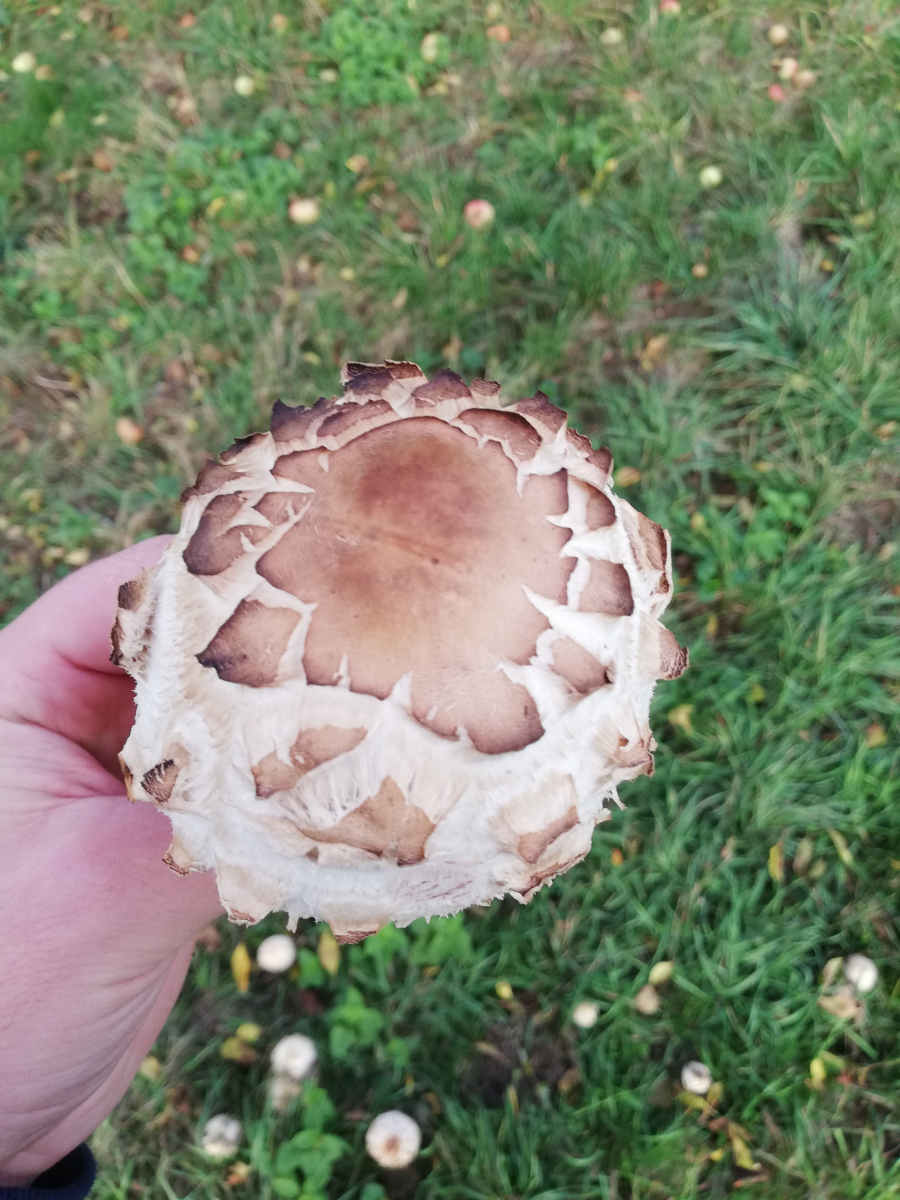 Habe hier unter einem Apfelbaum eine Gruppe Riesenschirmlinge entdeckt die ich nicht zweifelsfrei bestimmen kann. Der Ring ist verschiebbar, Basis knollig verdickt und der Stiel rötet bei Verletzung deutlich, zeigt jedoch nicht die Natterung des gemeinen Safranschirmlings. Könnt ihr mir da weiterhelfen?