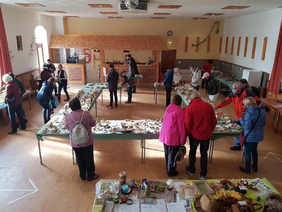 am vergangenen Sonntag fand nun bereits zum dritten Mal eine Pilzausstellung im Saal des Jenaer Forsthaus statt. Organisiert und durchgeführt wurde sie von der Pilzgruppe Jena, aber es gab darüber hinaus noch viel mehr Helfer. Gesammelt wurde in ganz Thüringen: nicht nur um Jena und östlich davon, sondern auch bei Erfurt, Ilmenau oder Eisfeld. Und sogar von der Ausstellung in Schwarza (siehe Wutzis Beitrag) wurden Pilze nachgenutzt. Unter anderem lag ein mittlerweile Forums-bekannter gigantischer Beringter Flämling auf dem Tisch