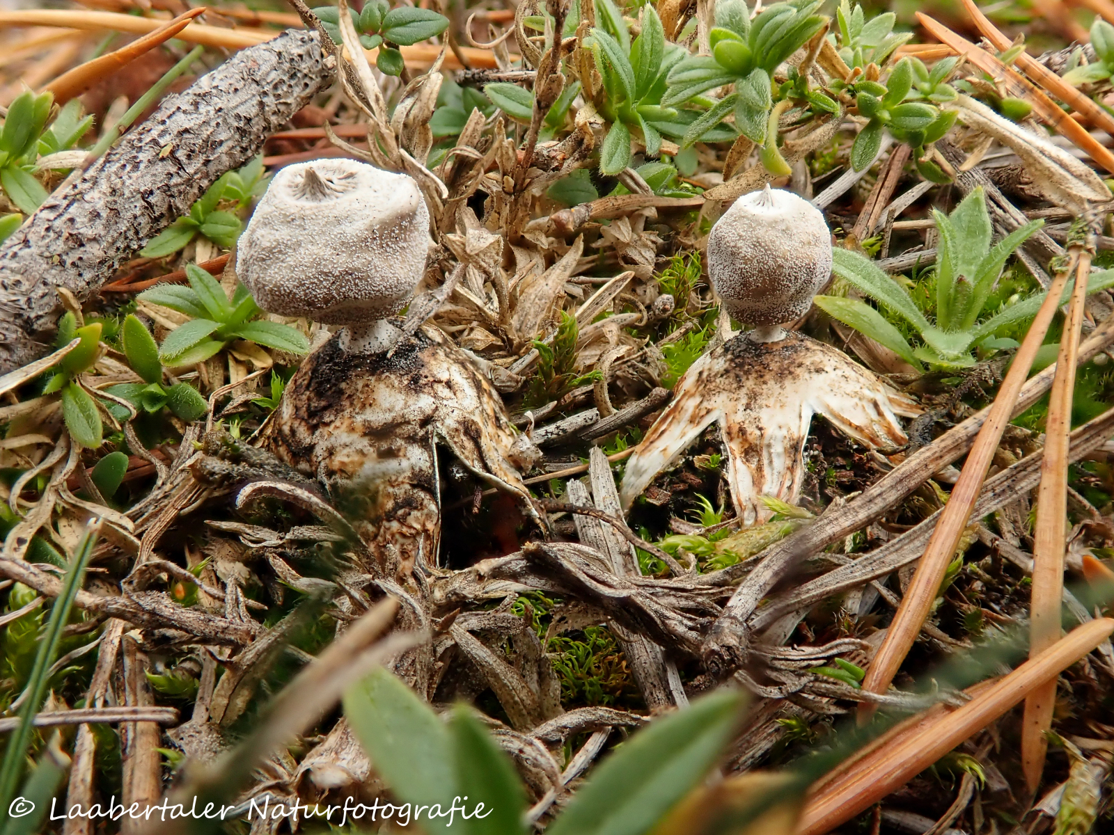 Ich habe mich noch gar nicht weit vom Auto bewegt, da sind mir diese winzigen (1,5 cm Höhe) Erdsterne auf dem Weg nach oben aufgefallen, die sich in der Streu unter den Kiefern befanden. Frische Fruchtkörper konnte ich leider nicht finden. Mit Erdsternen kenne ich mich leider wenig bis gar nicht aus - also bleibt für mich soweit erst einmal Geastrum sp.