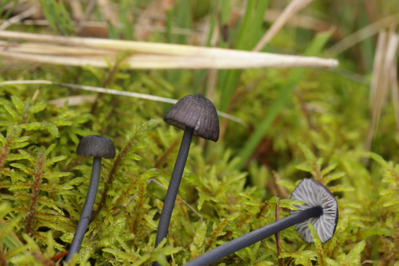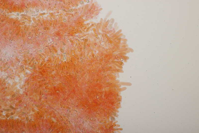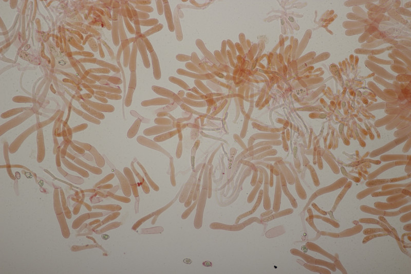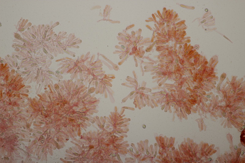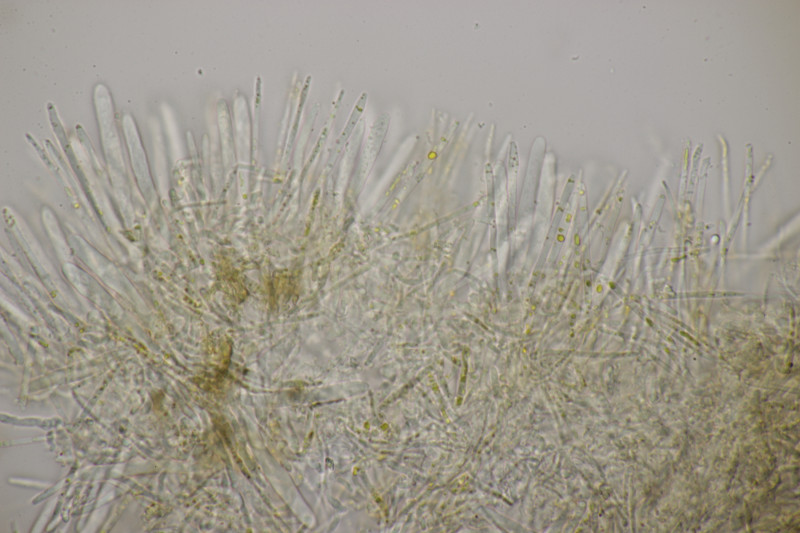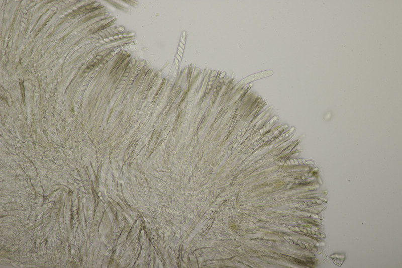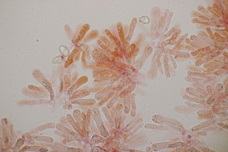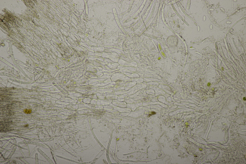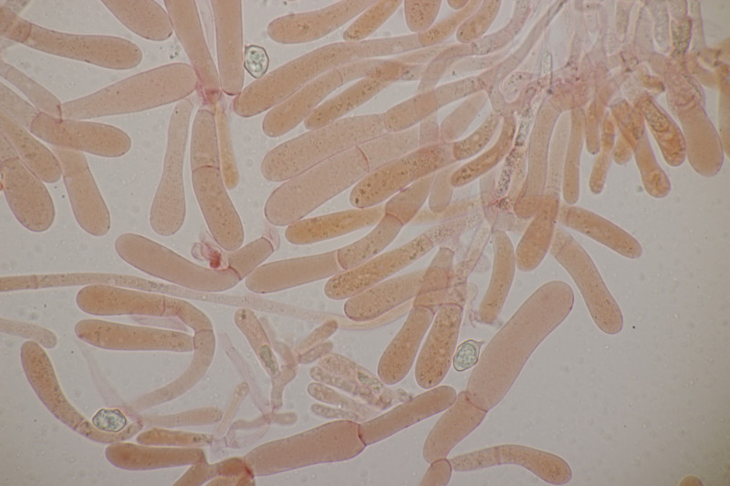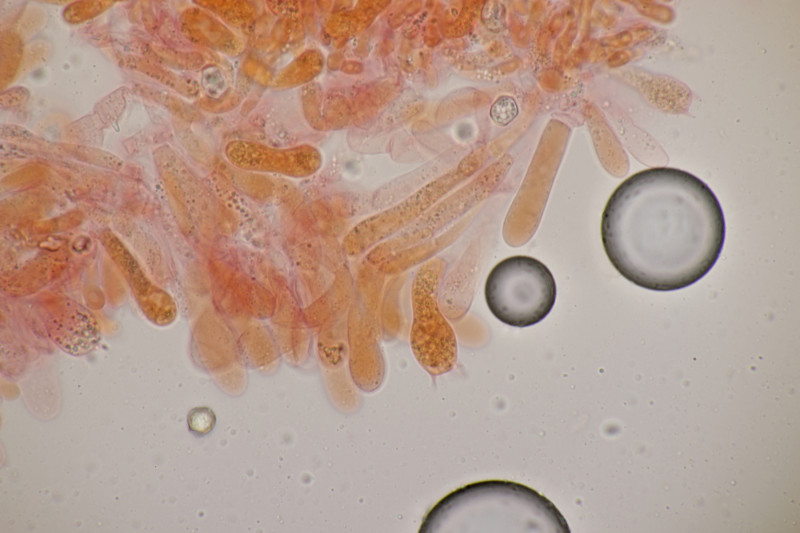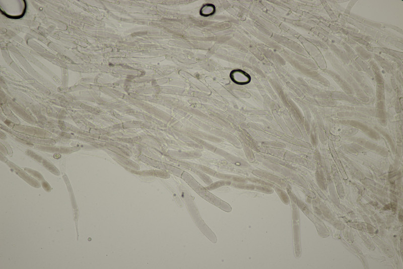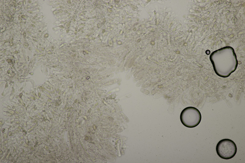 7. Ein blauer Rötling, der einige Fragen aufwirft. Die drei Fruchtkörper wuchens in unmittelbarer Nähe, der rechte Fruchtköper ist aber der einzige mit rein weißen Lamellen. Bei den anderen beiden ist die Lamellenfläche zwar auch weiß, die Schneide ist aber bläulich. Die Farbe ist aber nicht durchgehend sondern eher in kleineren Büscheln verteilt. Die Mikrobilder stammen alle vom mittleren Fruchtkörper. Leider habe ich nicht auf Schnallen an den Basidien geachtet, da das im Funga Nordica Schlüssel bei den blauen Entolomas mit blauer Lamellenschneide nicht abgefragt wurde, in FE5a aber schon eine Rolle beim Schlüsseln spielt. Die Sporen sind (9.9-11.8) µm x (6.9-8.0) µm, Q=1.3-1.6 bzw. (10.9+-0.5) µm x (7.5+-0.3) µm, Q=1.5+-0.1 groß. Die Hyphen der Huthaut sind breiter als 10 µm.