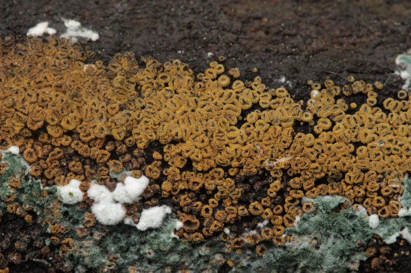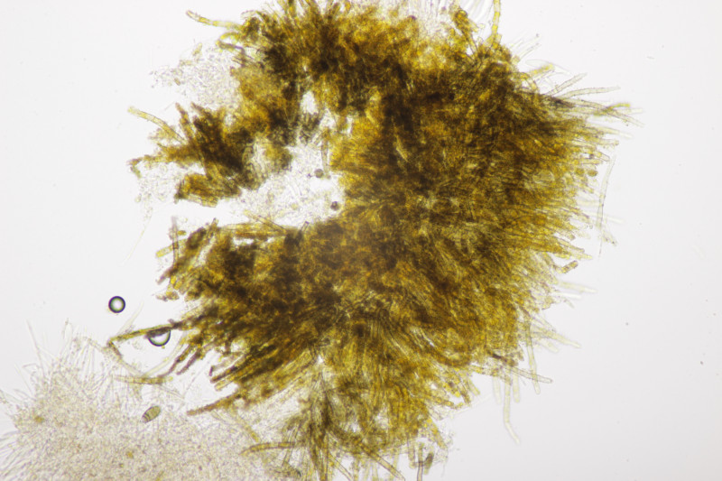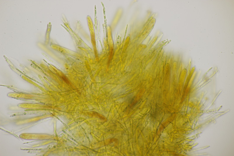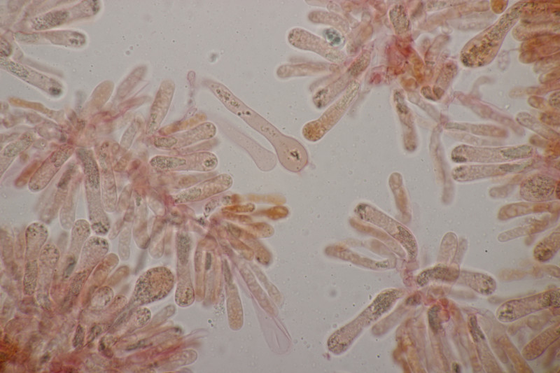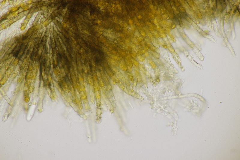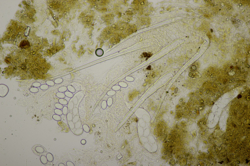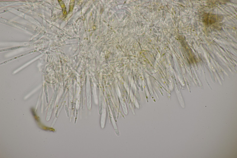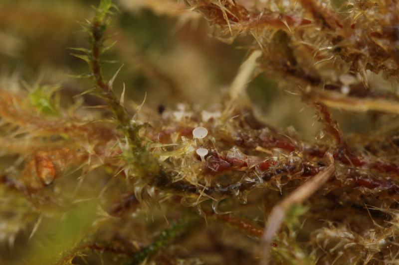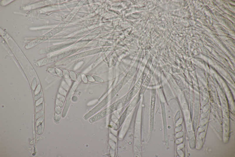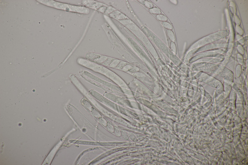 2. Ein Bryoscyphus auf Rhytidiadelphus. Da ist Bryoscyphus rhytidiadelphi natürlich erstmal ein naheliegender Name. Die Art kommt aber wegen der zu kleinen Sporenmaße von (11.4-13.6) µm x (5.2-5.6) µm bei unserem Fund nicht in Frage. Ein heißer Kandidat ist dann Bryoscyphus phascoides. Der hat wohl deutlich kleinere Sporen (obwohl es bei Baral auch Funde mit größeren Sporen gibt), eine blaue Lugolreaktion der Ascusspitze und kann Haken haben wie unser Fund, muß es aber nicht.