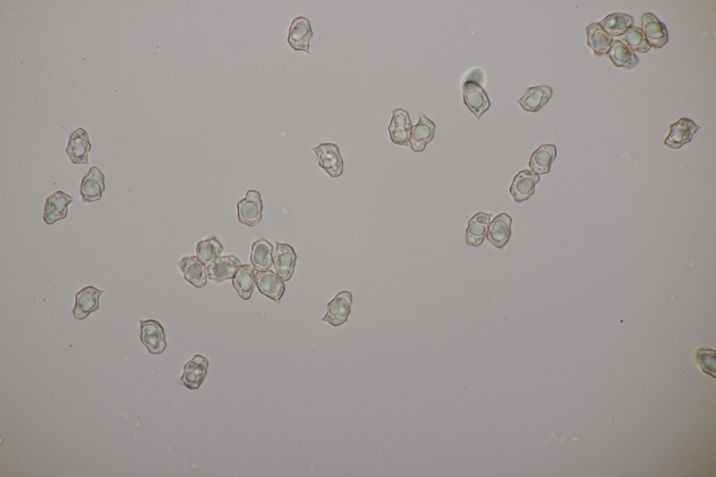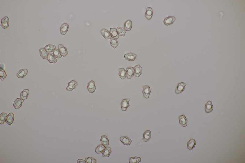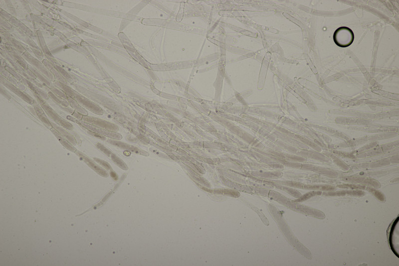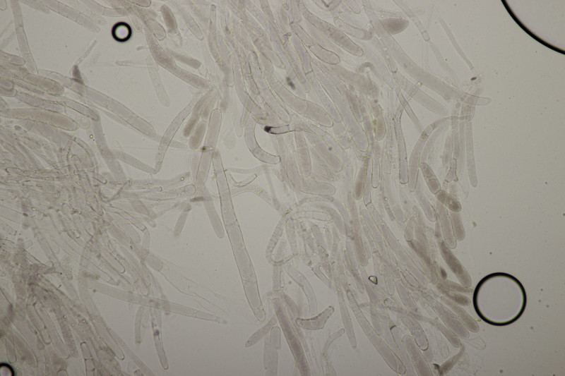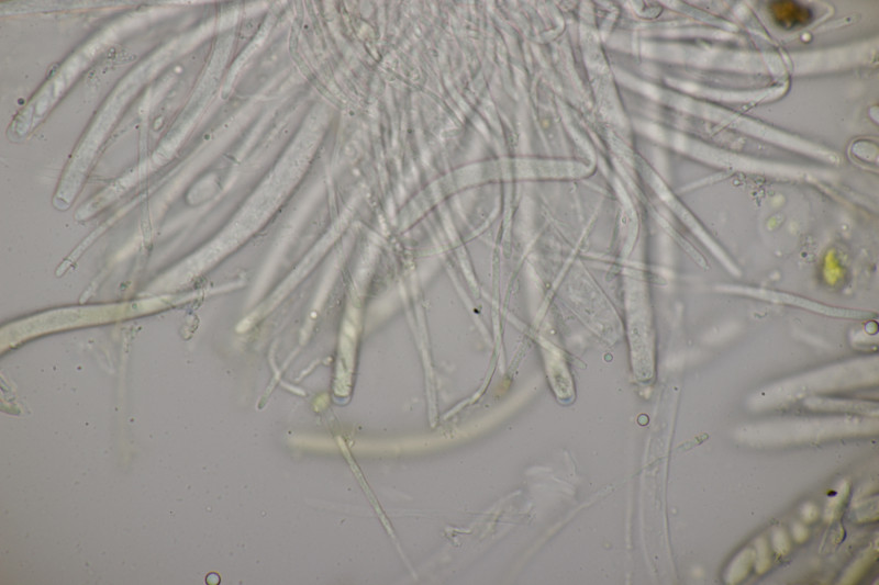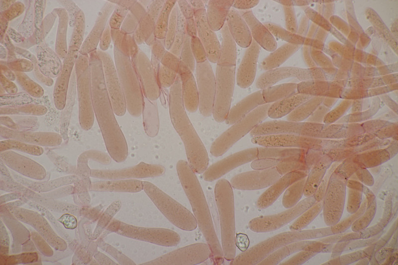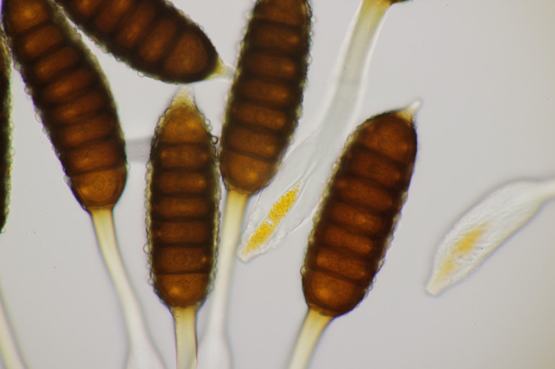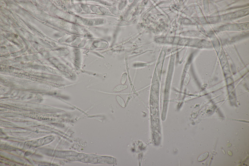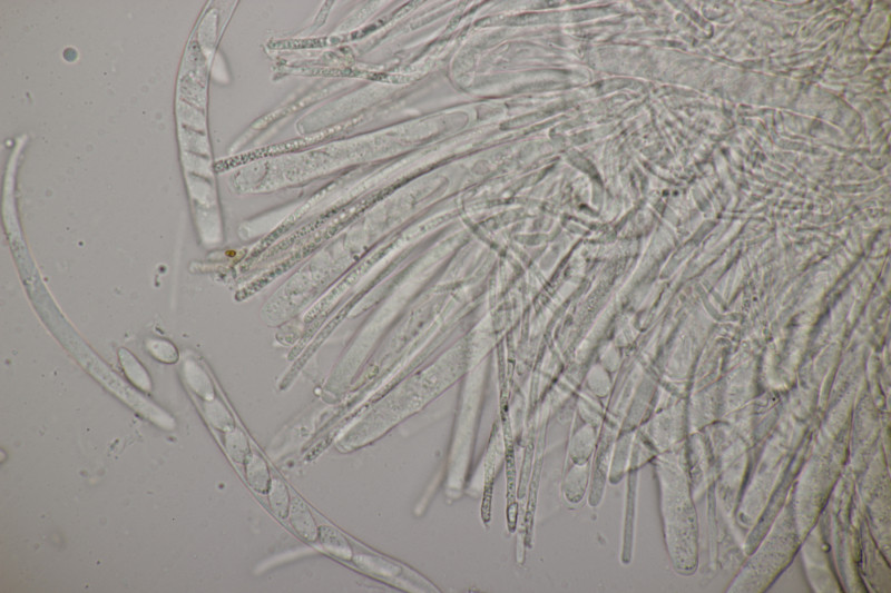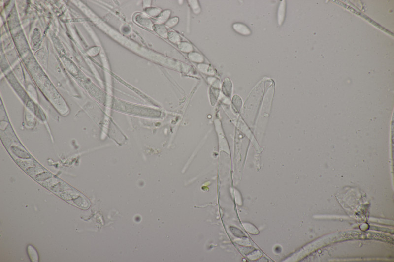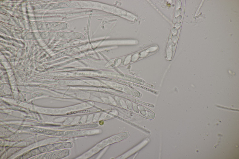 6. Hier lande ich mit Sporenmaßen von (18.7-22.2) µm x (12.6-14.6) µm, Q=1.4-1.7 bzw. (20.7+-1.0) µm x (13.6+-0.6) µm, Q=1.5+-0.1 bei Lasiobolus cuniculi. Ich habe mir auch einige Schafsköttel eingepackt. Mal schauen, was die in Kultur noch alles hervorbringen werden.