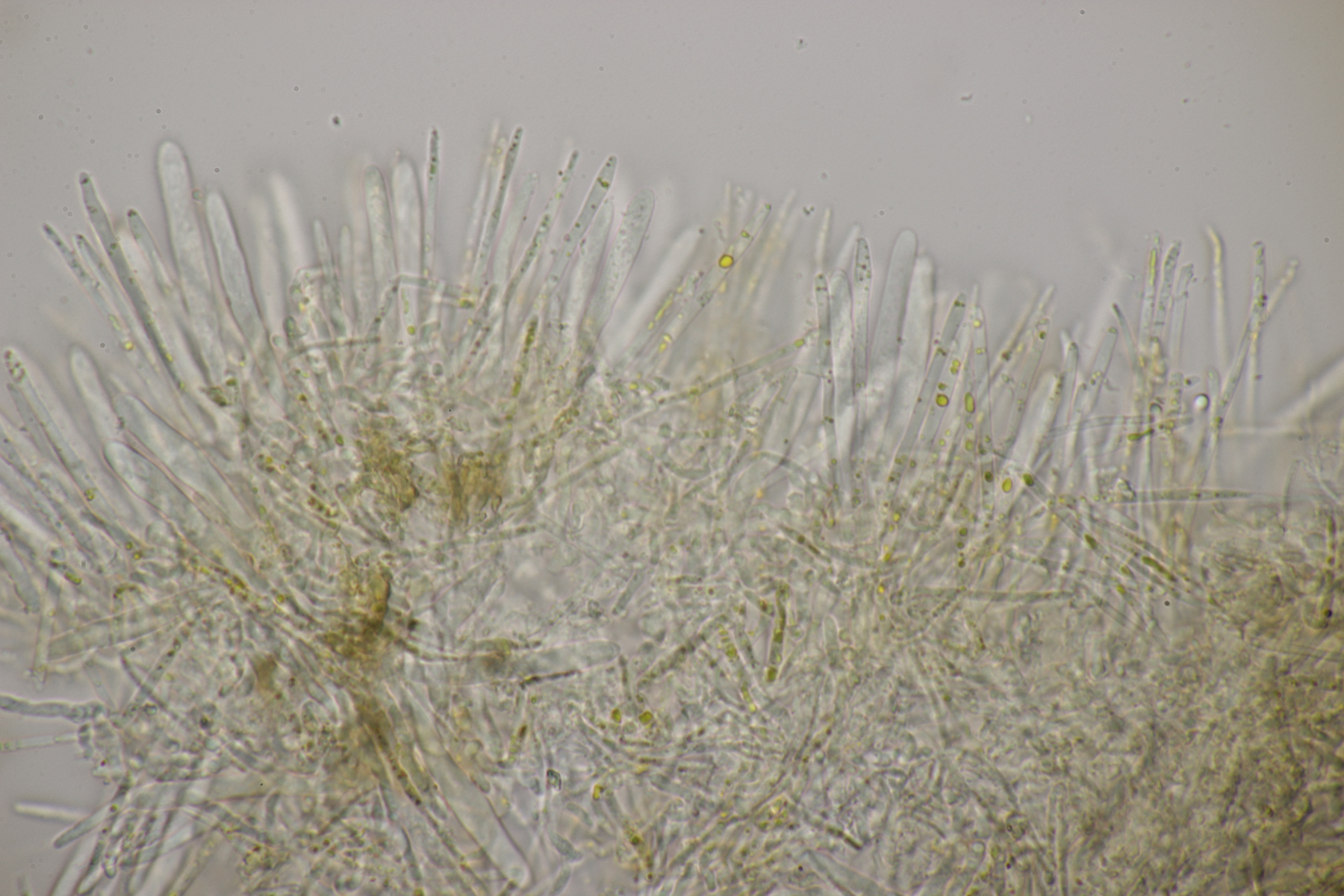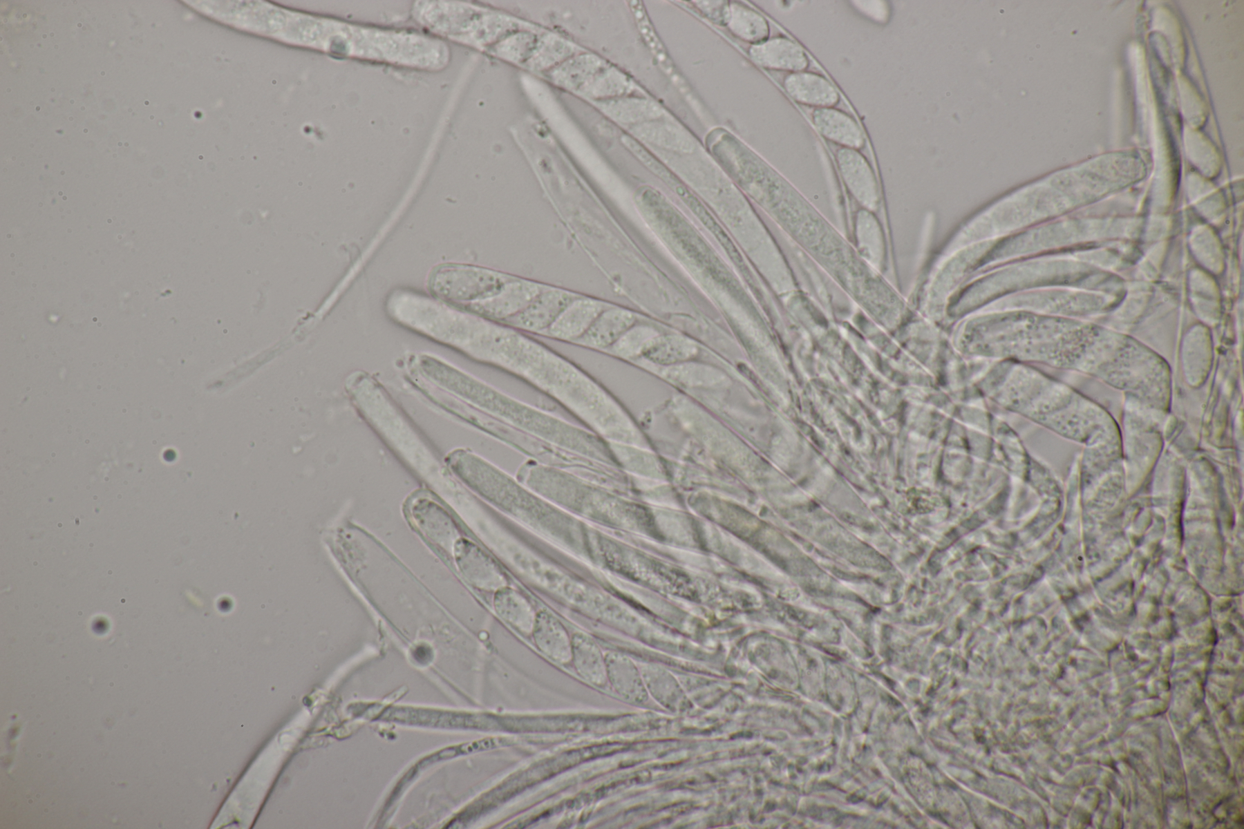 2. Ein Bryoscyphus auf Rhytidiadelphus. Da ist Bryoscyphus rhytidiadelphi natürlich erstmal ein naheliegender Name. Die Art kommt aber wegen der zu kleinen Sporenmaße von (11.4-13.6) µm x (5.2-5.6) µm bei unserem Fund nicht in Frage. Ein heißer Kandidat ist dann Bryoscyphus phascoides. Der hat wohl deutlich kleinere Sporen (obwohl es bei Baral auch Funde mit größeren Sporen gibt), eine blaue Lugolreaktion der Ascusspitze und kann Haken haben wie unser Fund, muß es aber nicht.