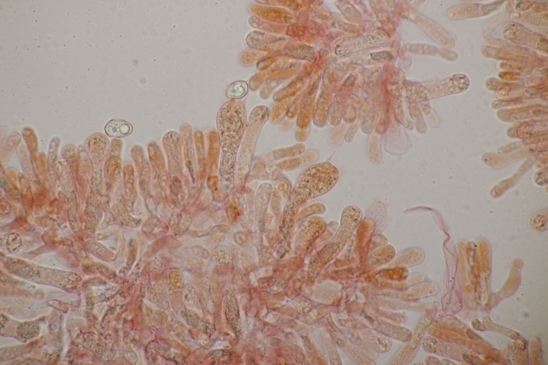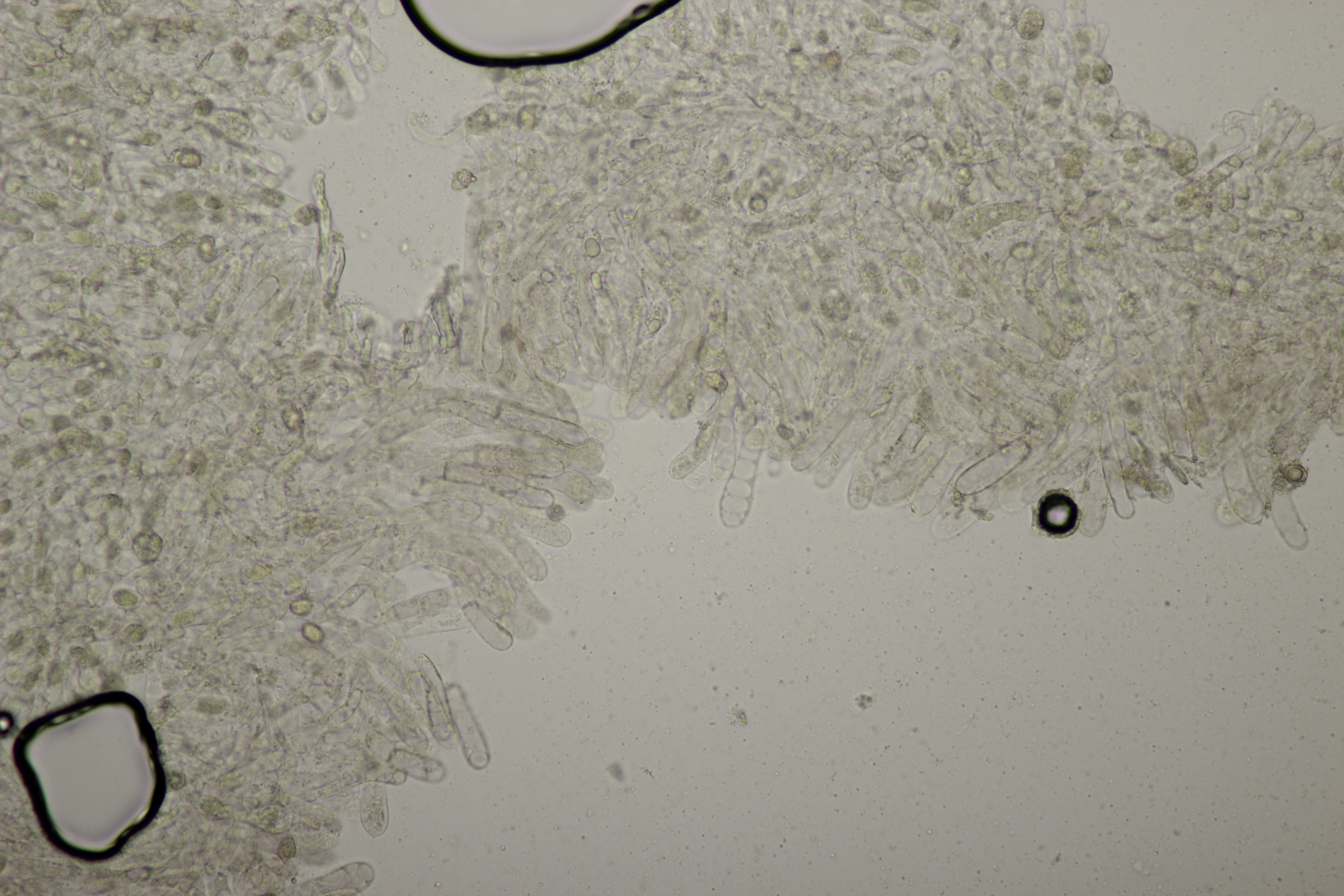 7. Ein blauer Rötling, der einige Fragen aufwirft. Die drei Fruchtkörper wuchens in unmittelbarer Nähe, der rechte Fruchtköper ist aber der einzige mit rein weißen Lamellen. Bei den anderen beiden ist die Lamellenfläche zwar auch weiß, die Schneide ist aber bläulich. Die Farbe ist aber nicht durchgehend sondern eher in kleineren Büscheln verteilt. Die Mikrobilder stammen alle vom mittleren Fruchtkörper. Leider habe ich nicht auf Schnallen an den Basidien geachtet, da das im Funga Nordica Schlüssel bei den blauen Entolomas mit blauer Lamellenschneide nicht abgefragt wurde, in FE5a aber schon eine Rolle beim Schlüsseln spielt. Die Sporen sind (9.9-11.8) µm x (6.9-8.0) µm, Q=1.3-1.6 bzw. (10.9+-0.5) µm x (7.5+-0.3) µm, Q=1.5+-0.1 groß. Die Hyphen der Huthaut sind breiter als 10 µm.