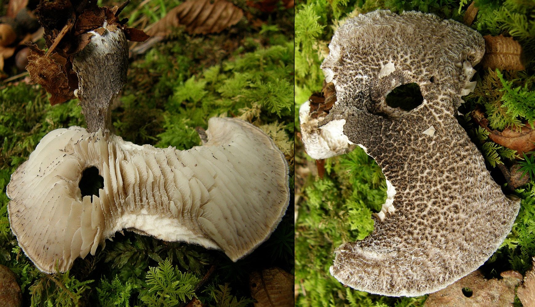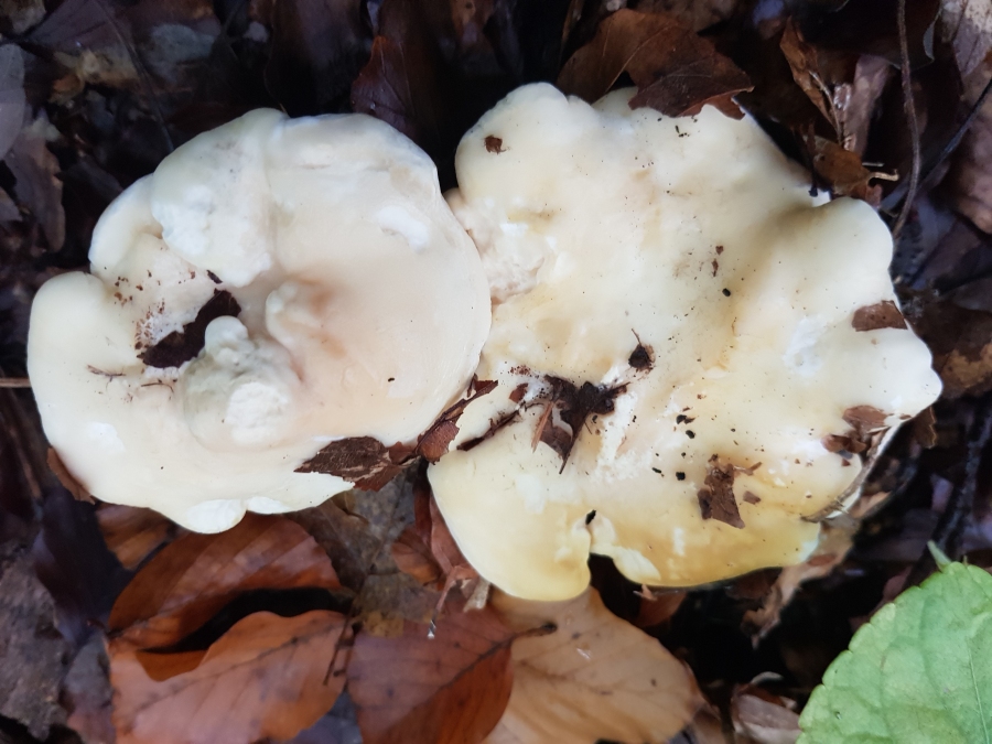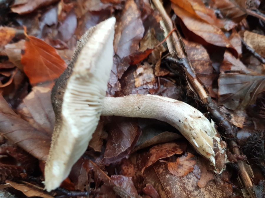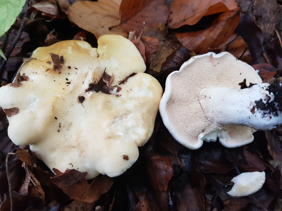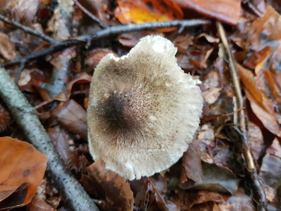6) Ein weiterer Fund hat mich genarrt. Von oben dachte ich eher an eine weiße Tricholoma, die Blick unters Hütchen hat aber die Gattung veraten: Semmelstoppelpilze. Hier vermutlich Hydnum albidum.