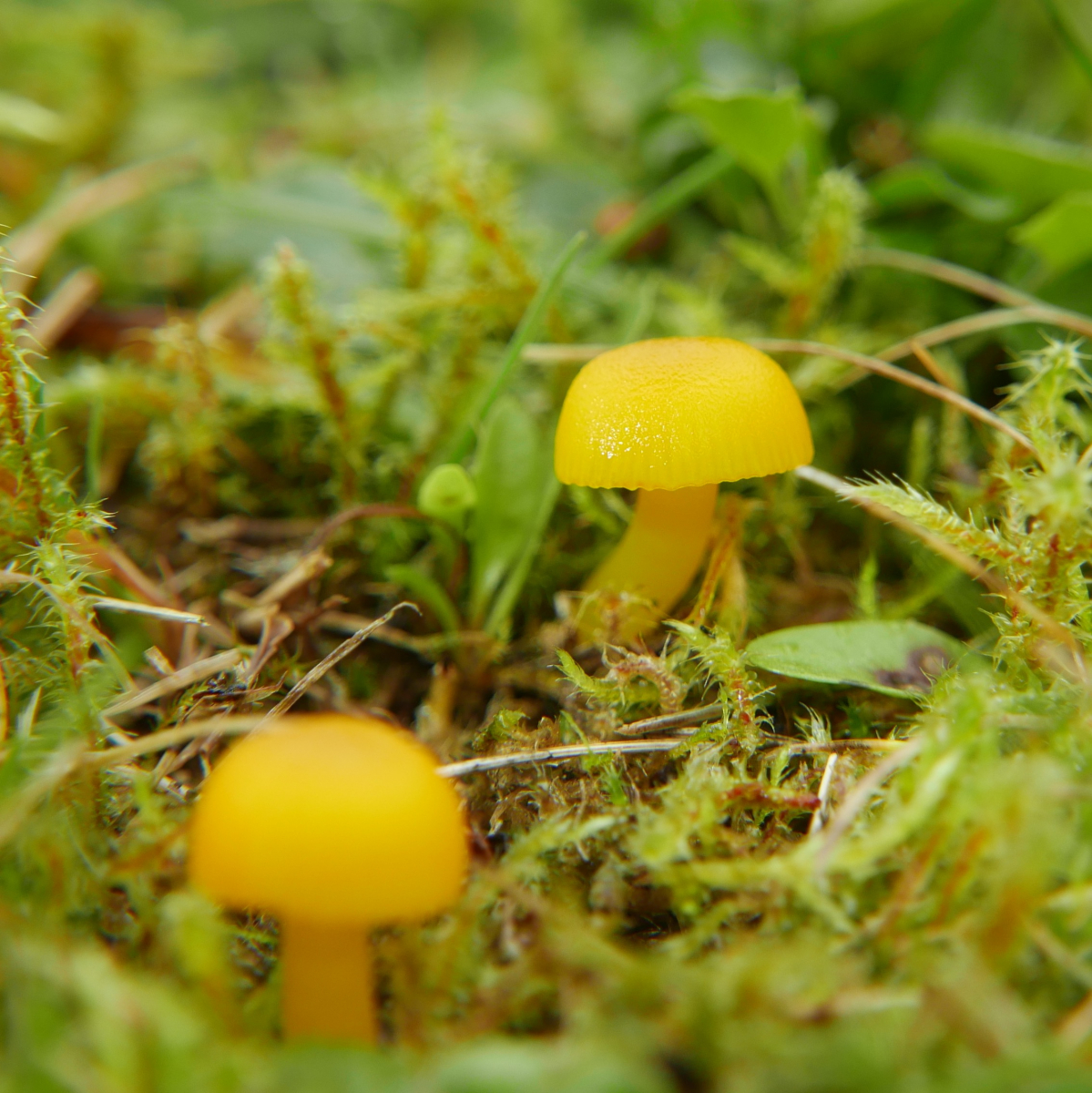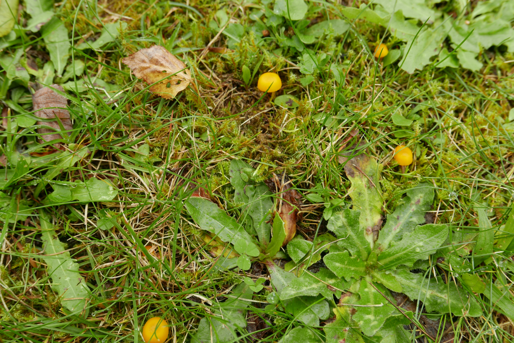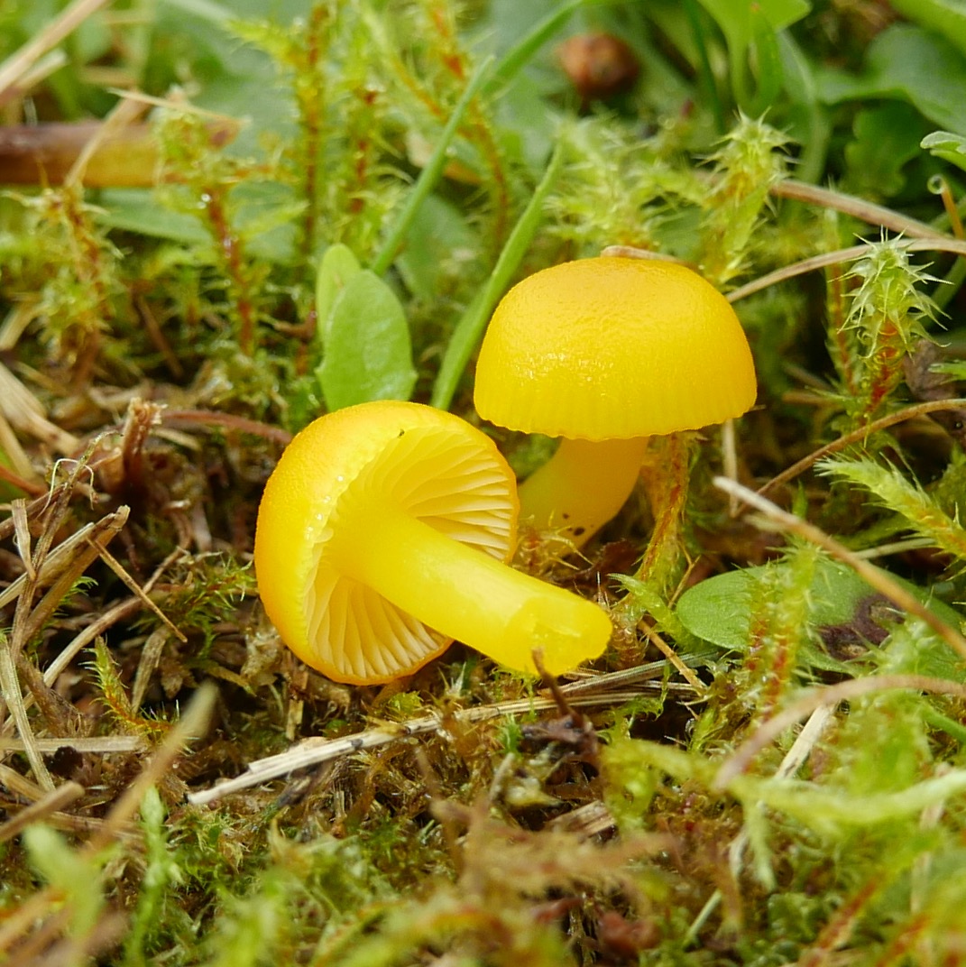 12. Gelber Saftling, Hygrocybe sp., könnte das der Stumpfe Saftling sein? Sie waren so klein, dass ich erst dachte, es hätte jemand Maiskörner verstreut. Edit: Karl W sagt, das sind Hygrocybe ceracea, Zerbrechlicher Saftling