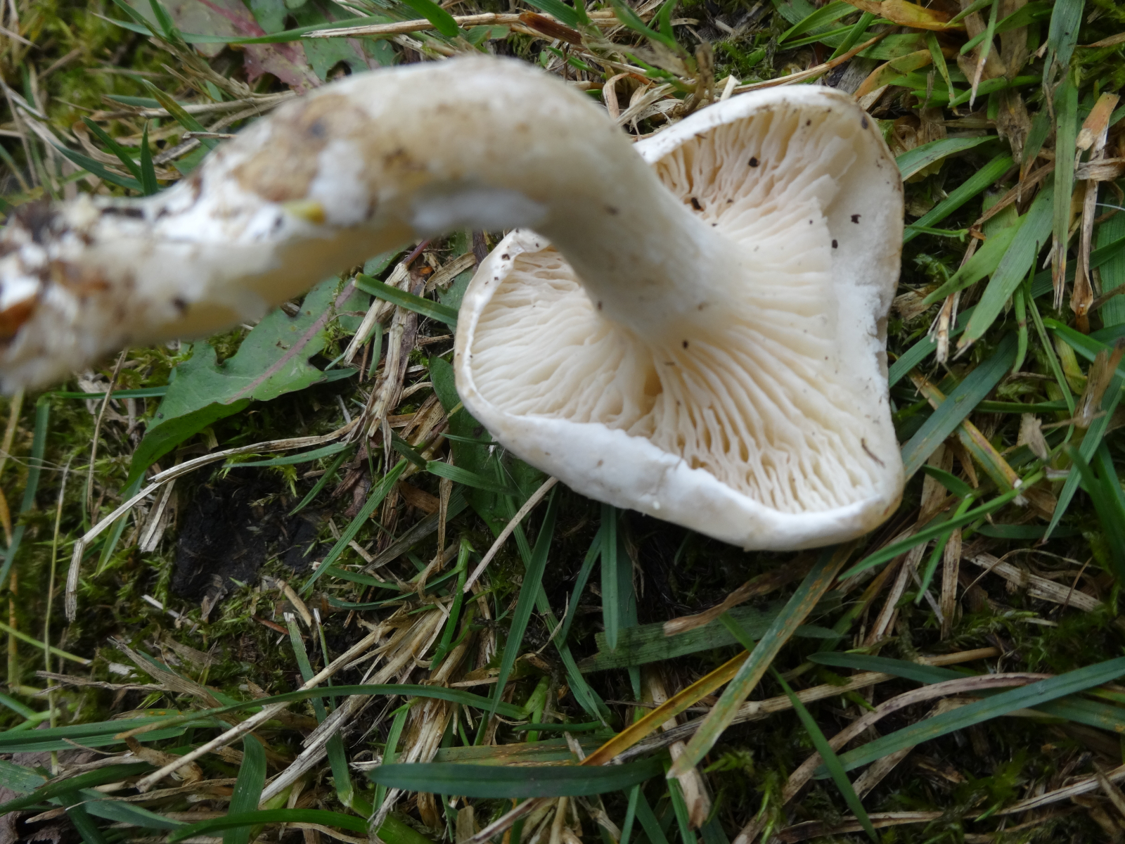 auf mich macht der Pilz einen tricholomatoiden Eindruck, weswegen ich hier eher einen weißen Ritterling oder Leucocybe connata sehe...