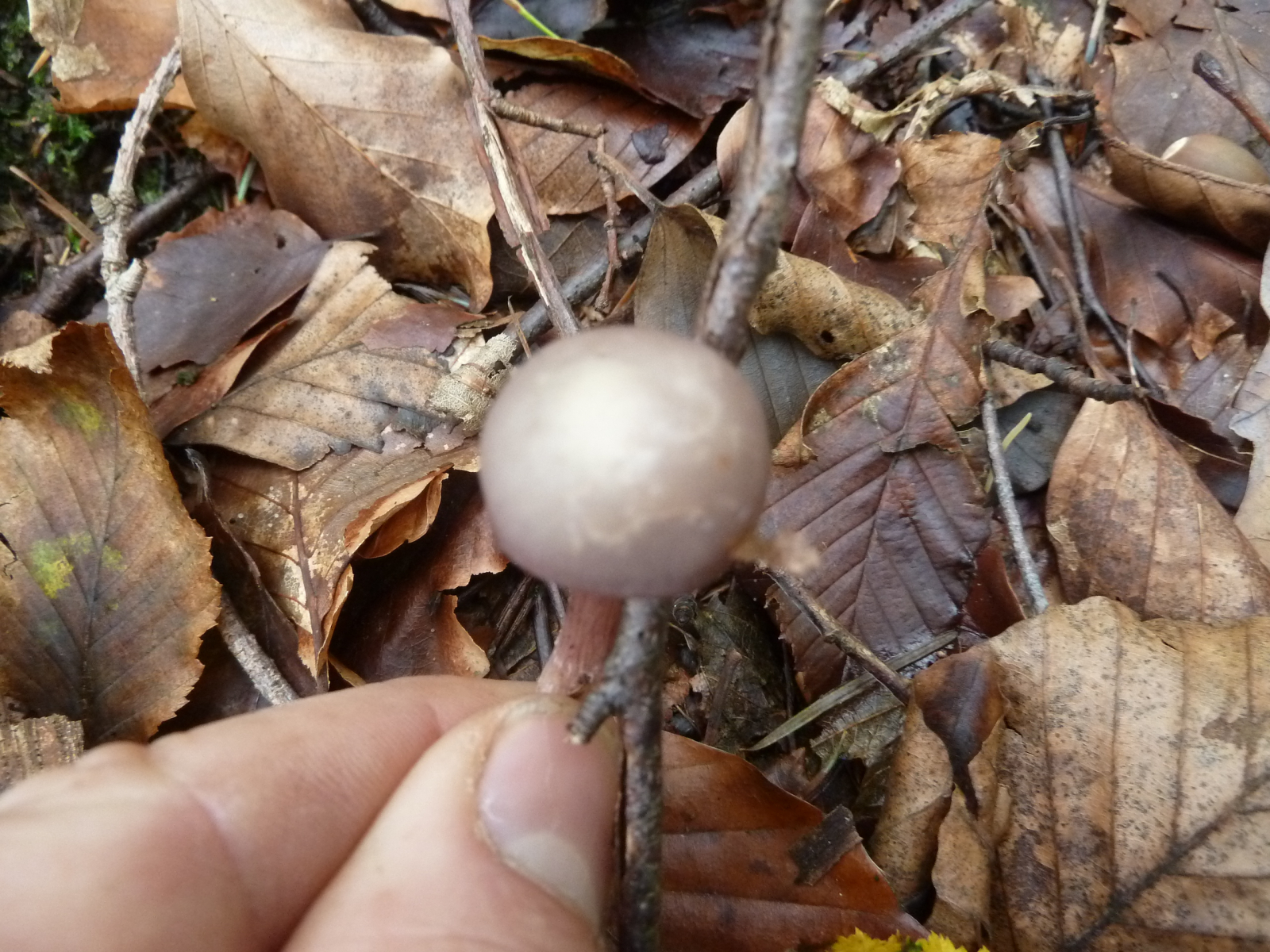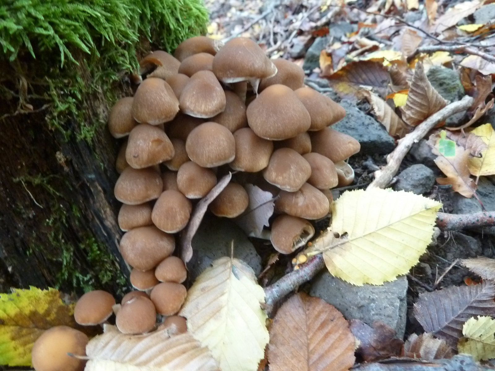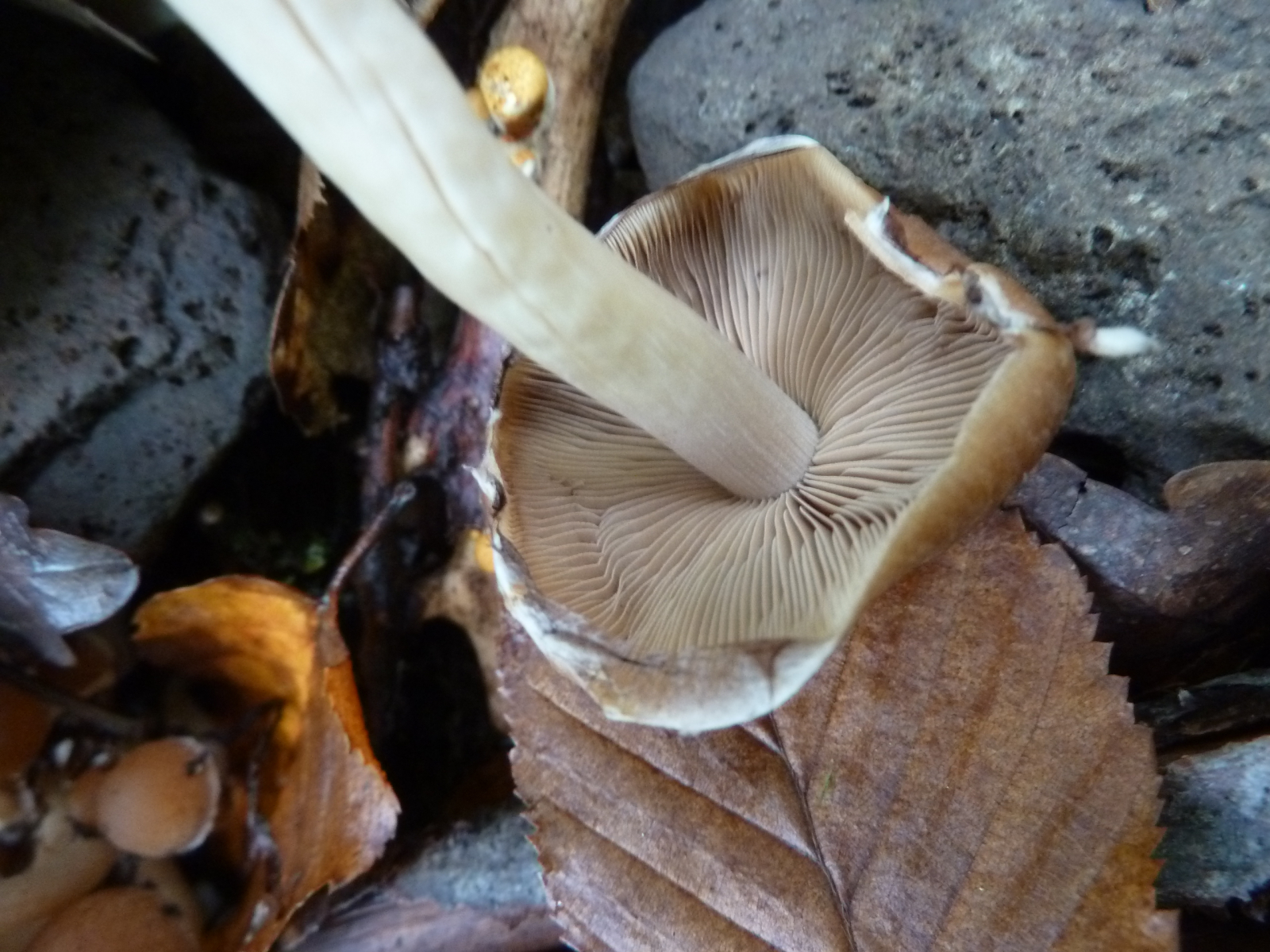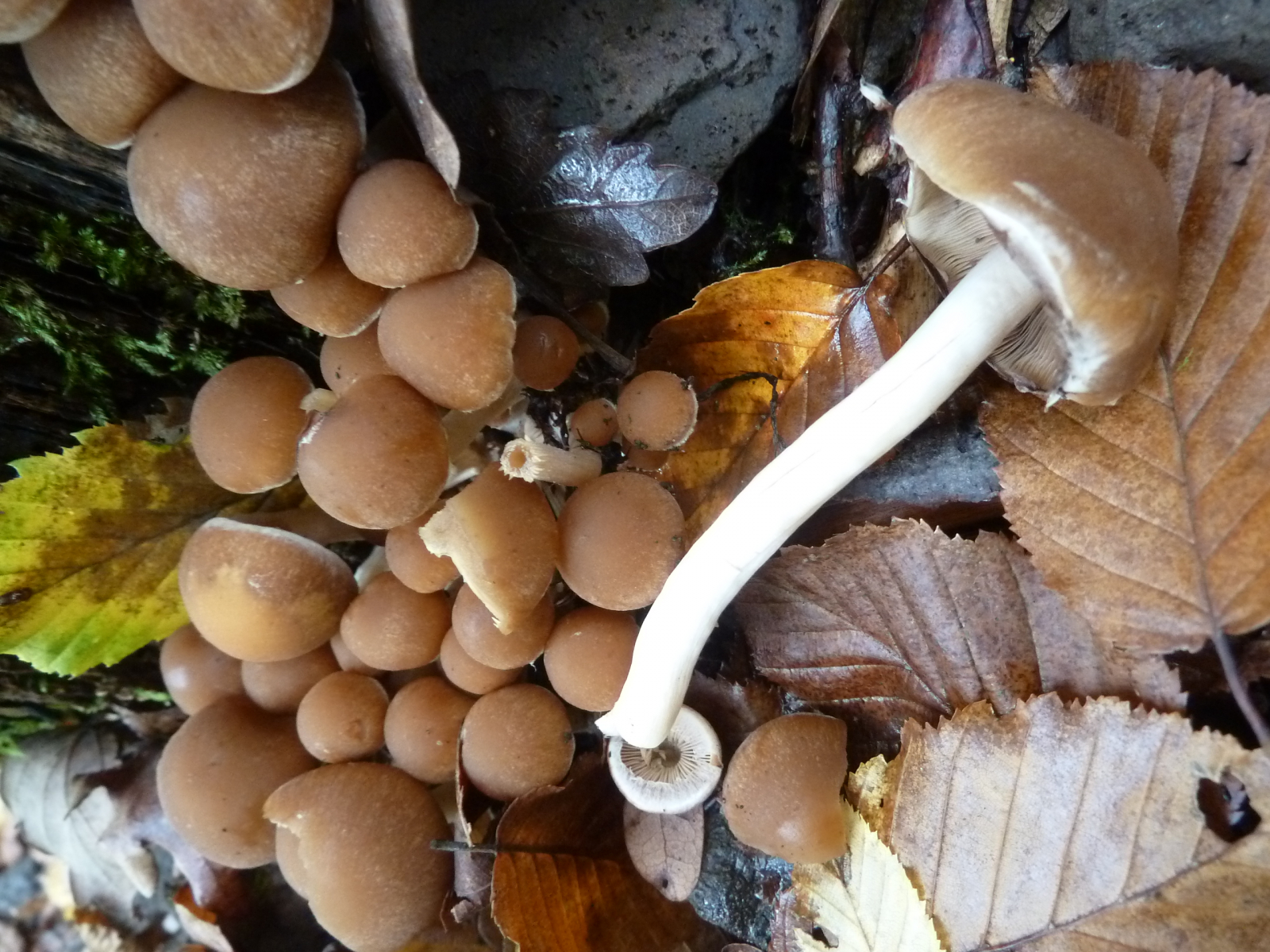 Fast vier Stunden bin ich heute im Eichen-Buchen-Mischwald auf basischem Basaltboden herumgelatscht und habe nur wenige Pilze finden können. Wenn man einmal vom saitenstieligen Knoblauchschwindling absieht, der in ordentlichen Stückzahlen wuchs, waren die wenigen anderen Arten auch jeweils nur in geringer Stückzahl zu finden.