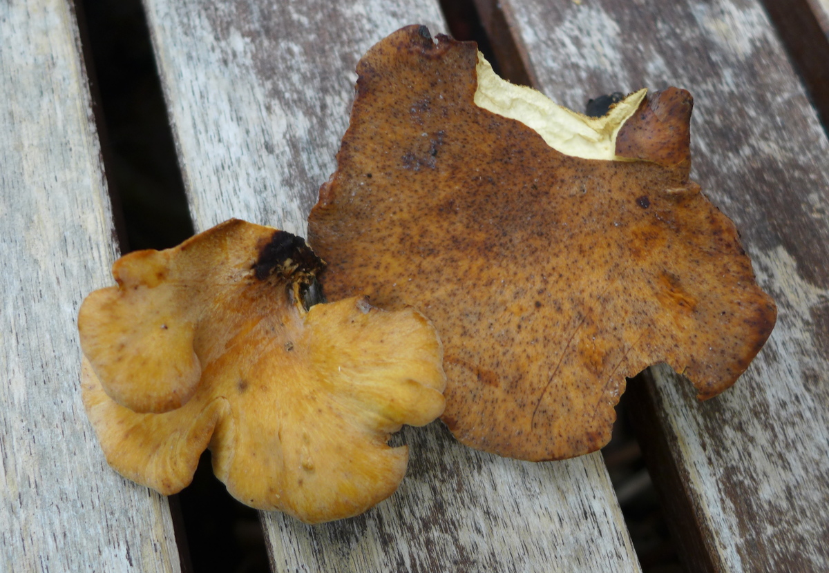 Zwei Porlinge einer Art, die ich vorher noch nie bewusst gesehen habe, nahm ich auch noch mit. Extrem fest und zäh, der jüngere gelbbraun, der ältere eher braun, mit feinen Poren und schwarzem Fuß. Könnte das der löwengelbe Stielporling sein, bei dem ich gerade kürzlich in Hans' Rätsel danebenlag?