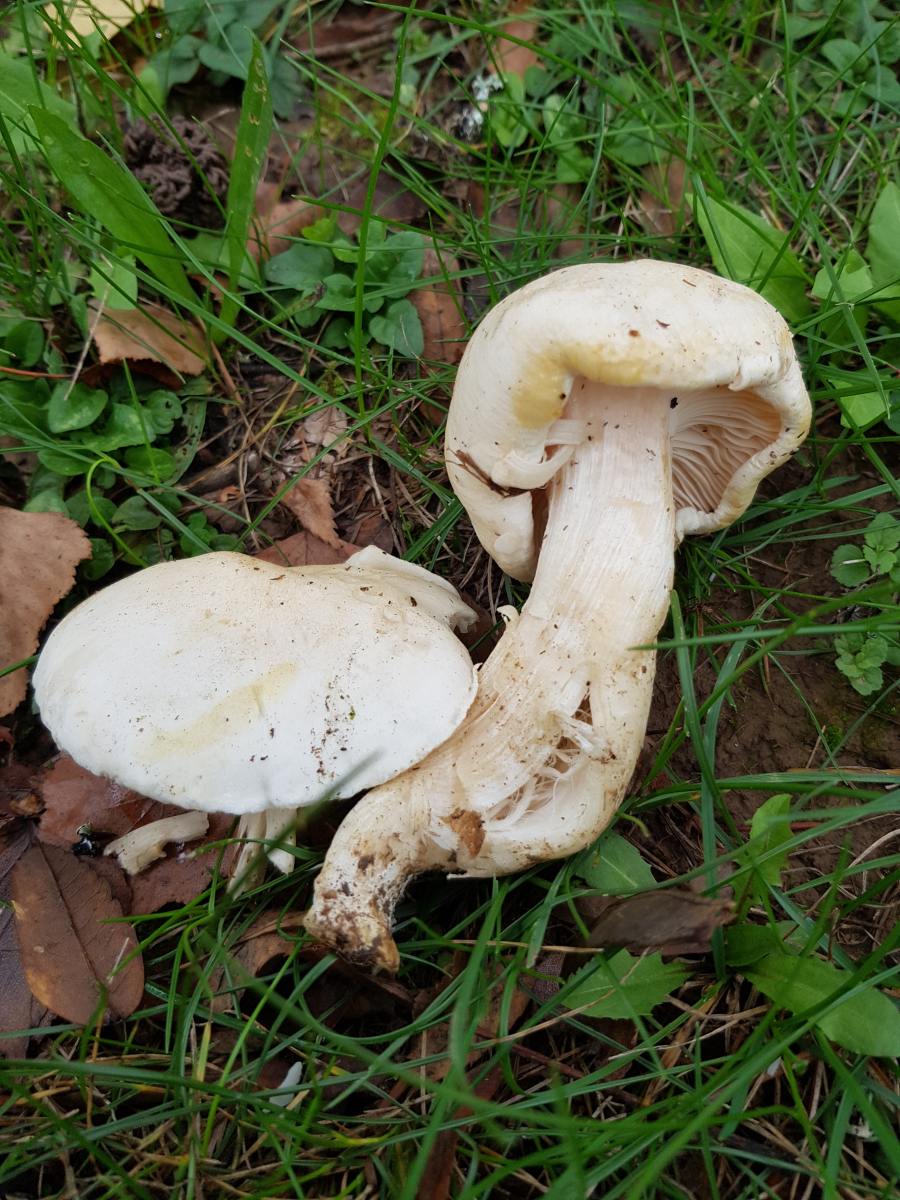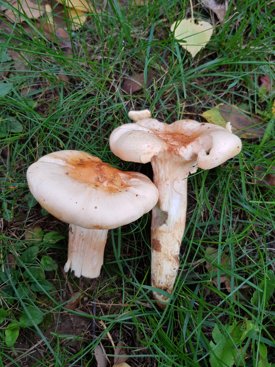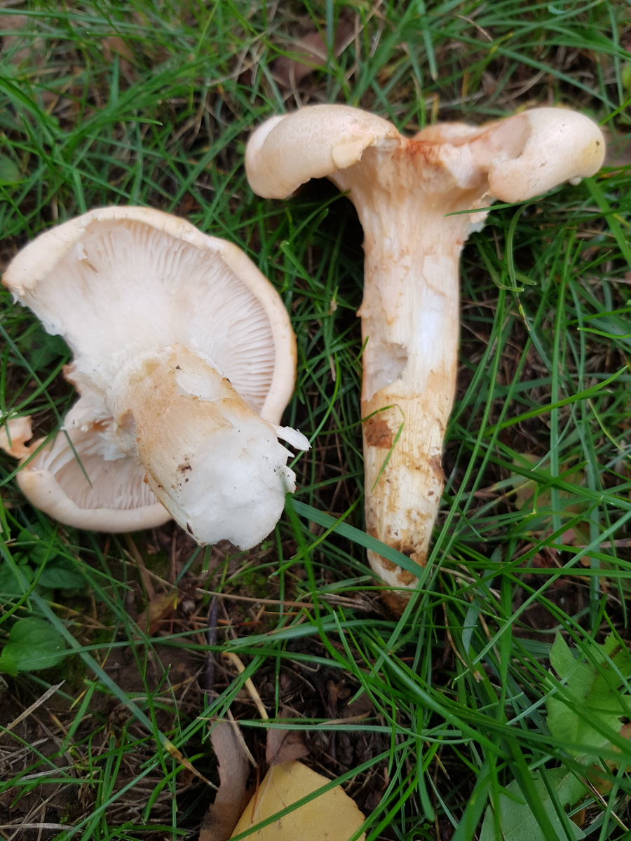 Gefunden haben wir außerdem zwei Arten, die ich im Augenblick noch nicht mal einer Gattung zuordnen kann. Es sind beides handflächengroße Fruchtkörper mit herablaufenden Lamellen. Schöne Pilze, die vom Habitus auch so pfifferlingsähnlich daherkommen. Ich kann die absolut nicht einordnen. Gerüche bei beiden banal. Keine weichen, wachsartigen Lamellen, kein Burggraben, kein würziger Geruch, kein abstosender oder parfümartiger Geruch!???