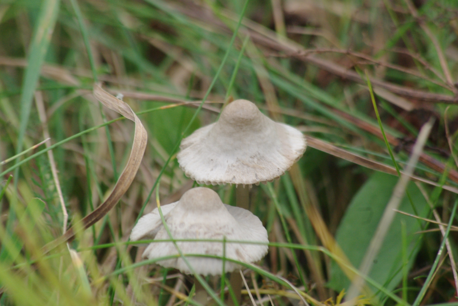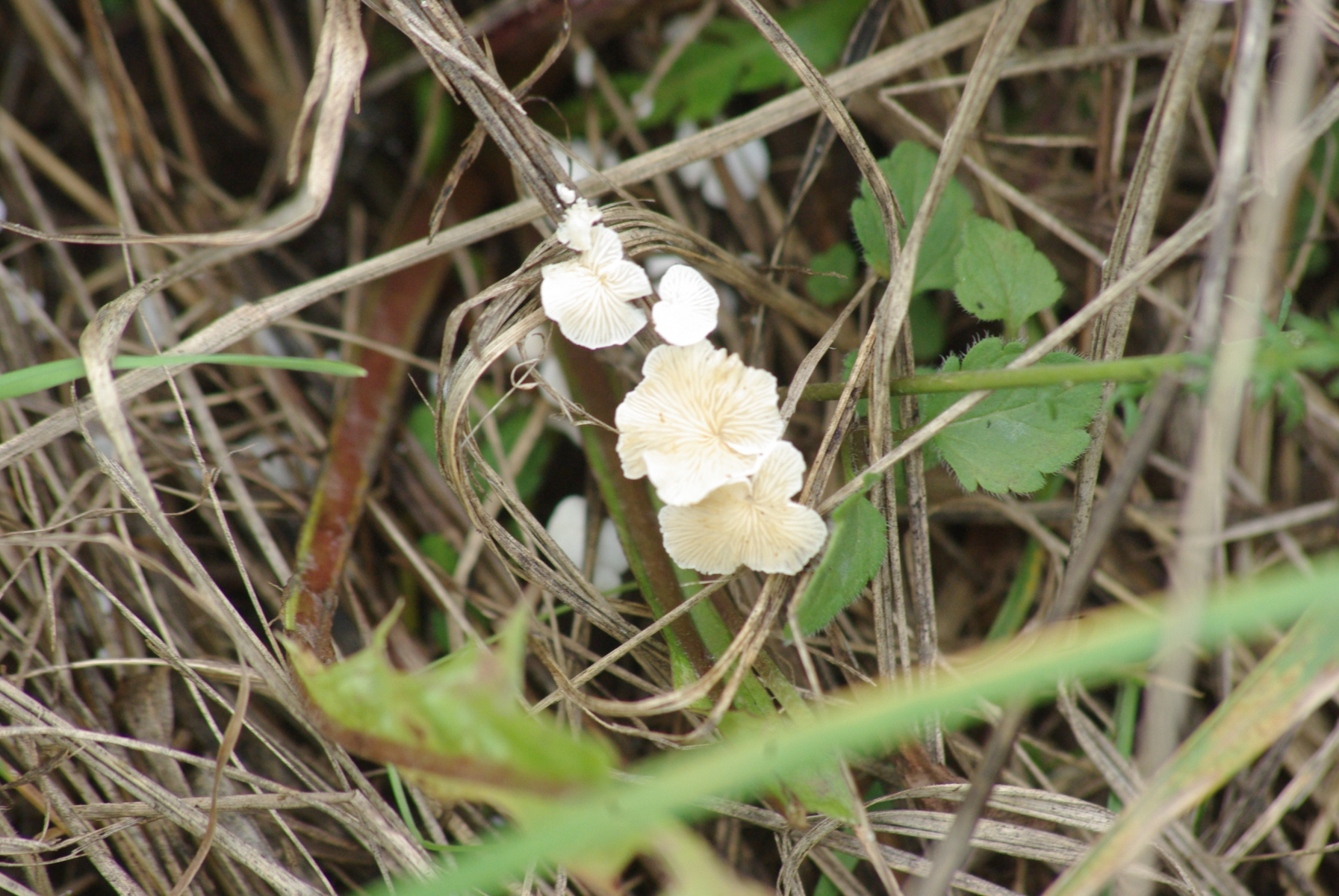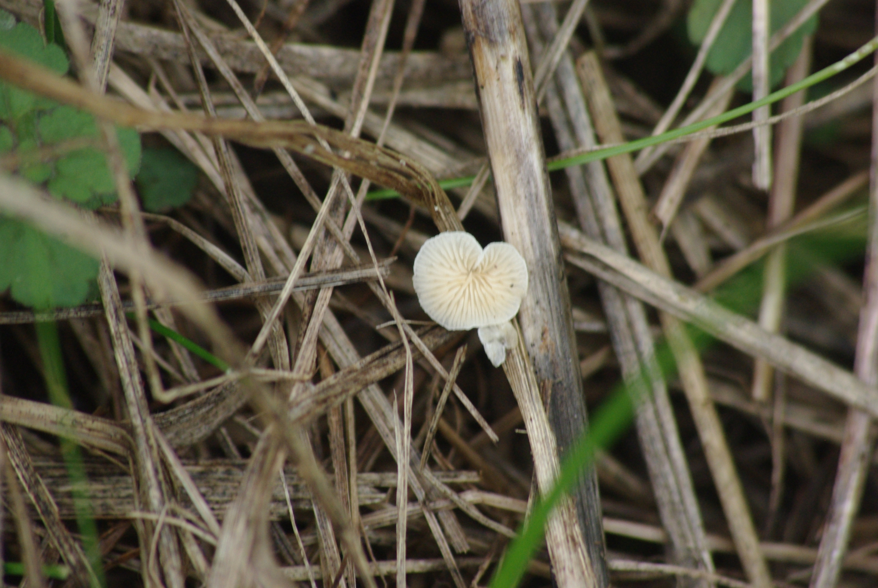5) Ein kleiner weißer Pilz an nicht eingebrachtem Heu (wohl Land-Reitgras), gemäht nur in einem Streifen, da wo der Zaun fürs Vieh aufgestellt wird.