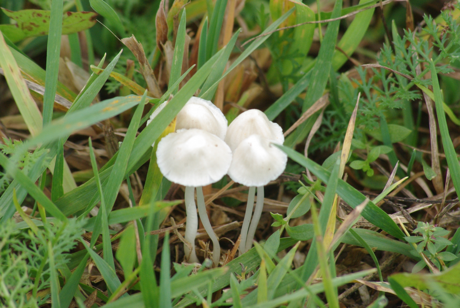 1) Ein Helmling (?) in reinweiß, mäßig magere Wiese (Sand, Kies, leicht kalkhaltig), der rausgezogene Pilz erkennbar auf organischem Substrat (Graswurzel?). Spezifischer, erträglicher Geschmack, kann ich aber nicht beschreiben. Geruch indifferent.