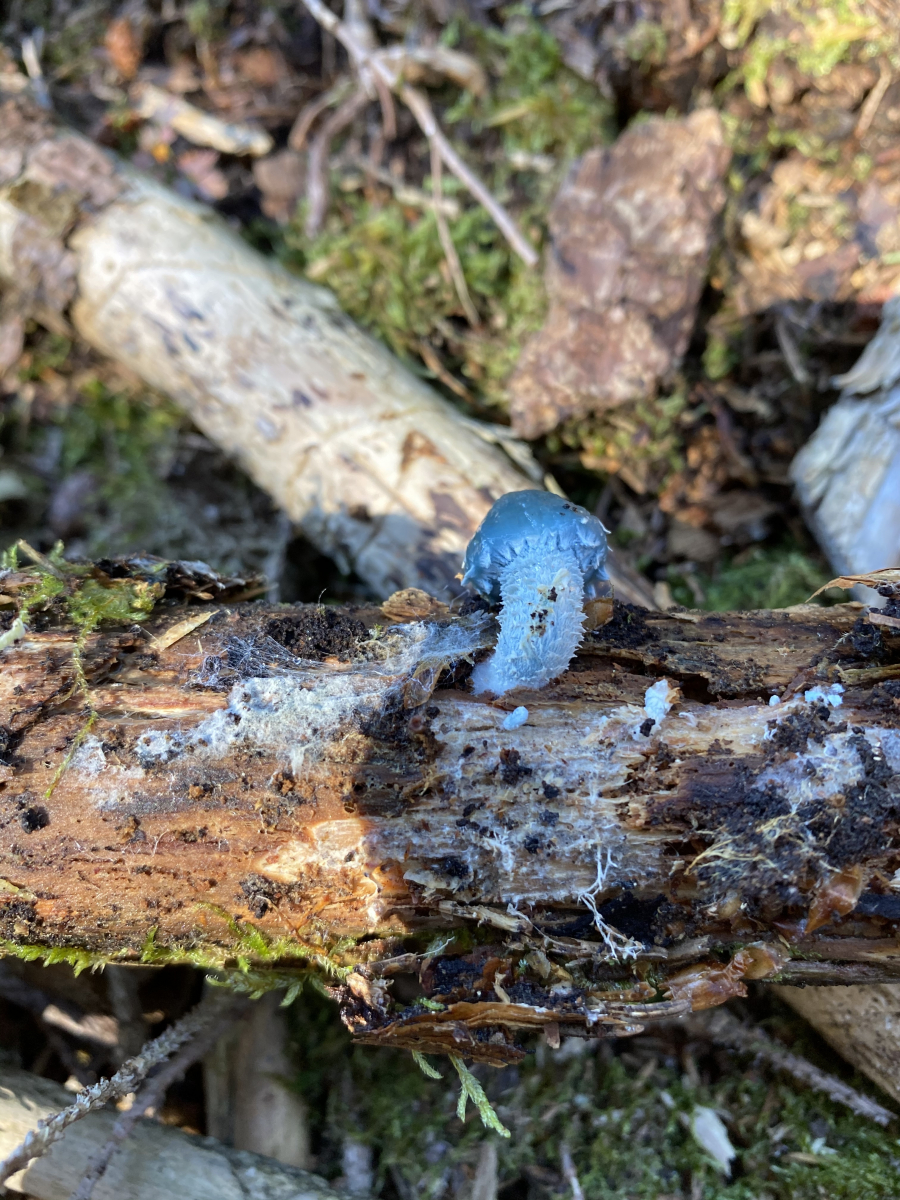 Ich habe am Wochenende in einem Nadelwald (ca. 1600 HM) einen blauen Pilz gefunden. Er ist in etwas 2cm groß und wächst auf Holz. Um welchen Pilz könnte es sich da handeln?