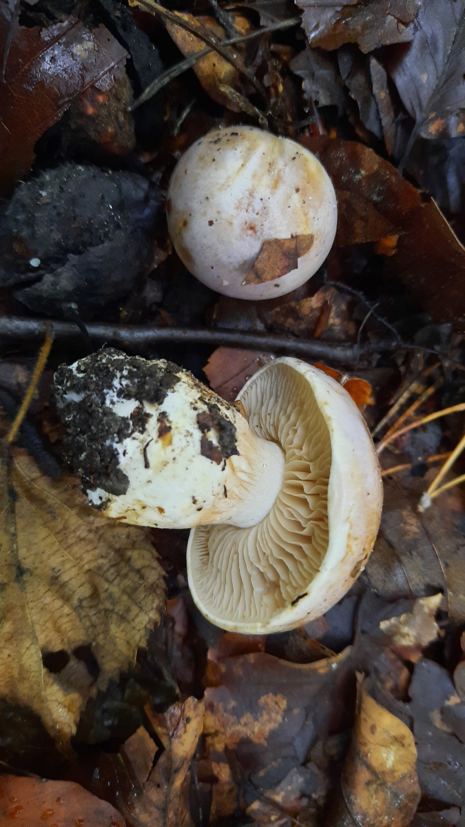 Hut war im Wald etwas schmierig, Stiel trocken. Huthaut mit Violetttönen, Lamellen aber fahl-orangegelblich, komplett ohne Violett.