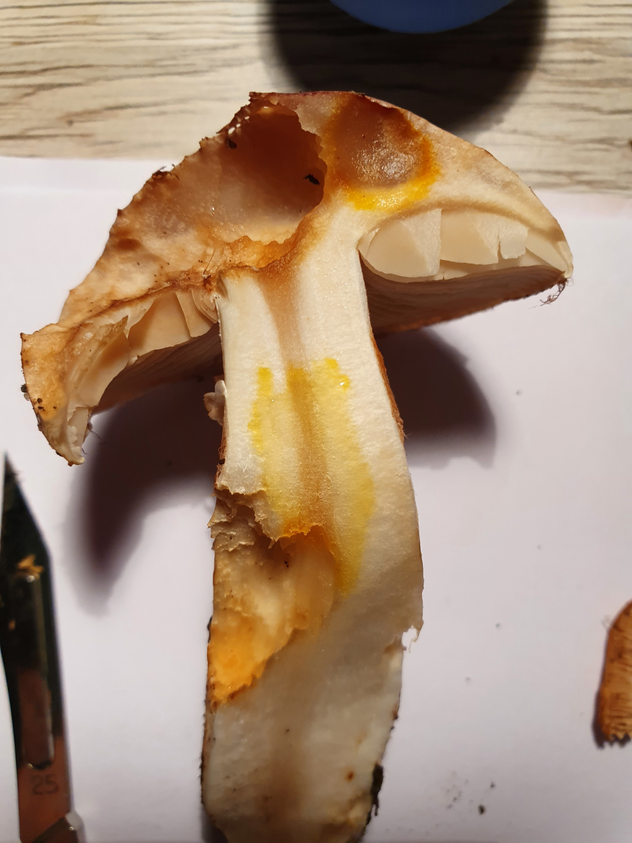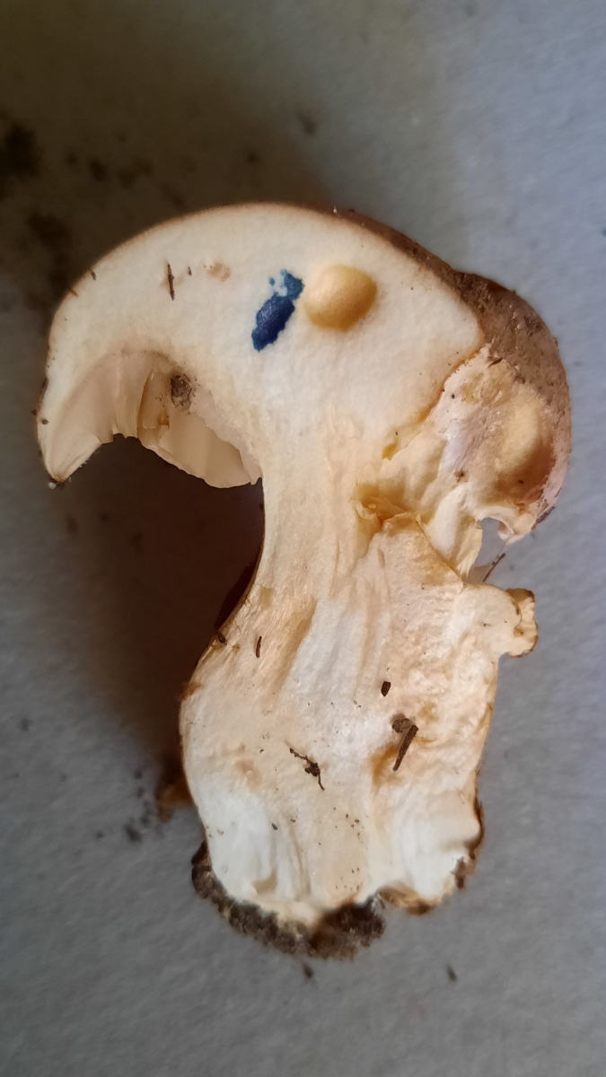 Hut war im Wald etwas schmierig, Stiel trocken. Huthaut mit Violetttönen, Lamellen aber fahl-orangegelblich, komplett ohne Violett.