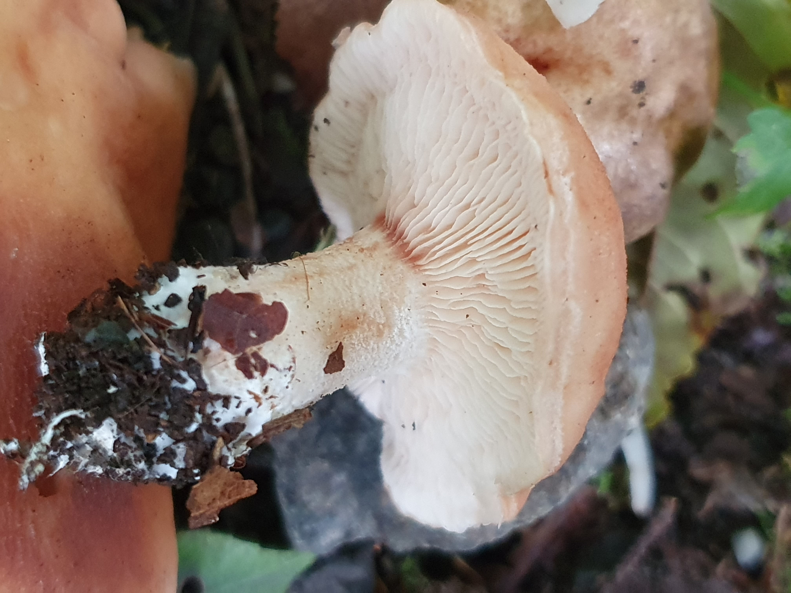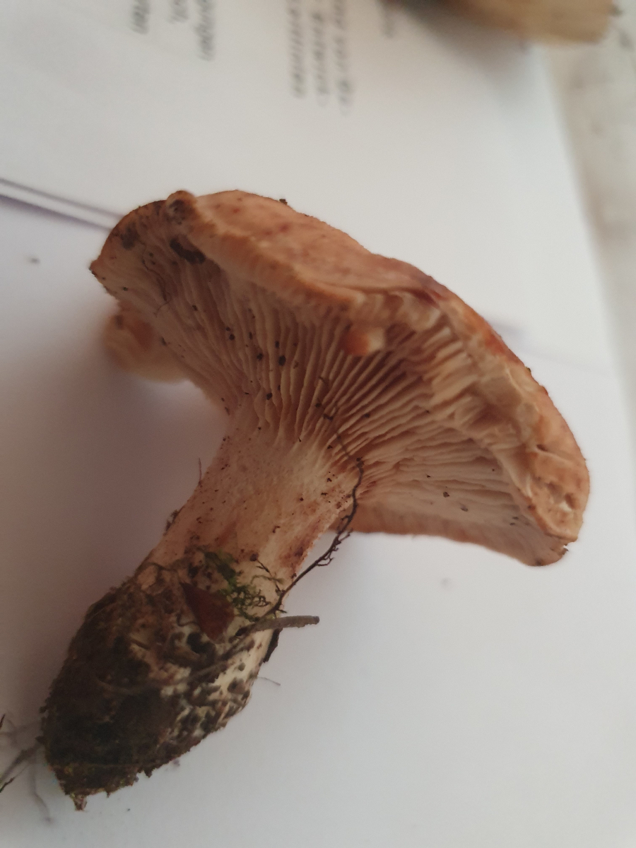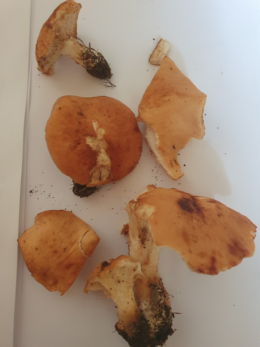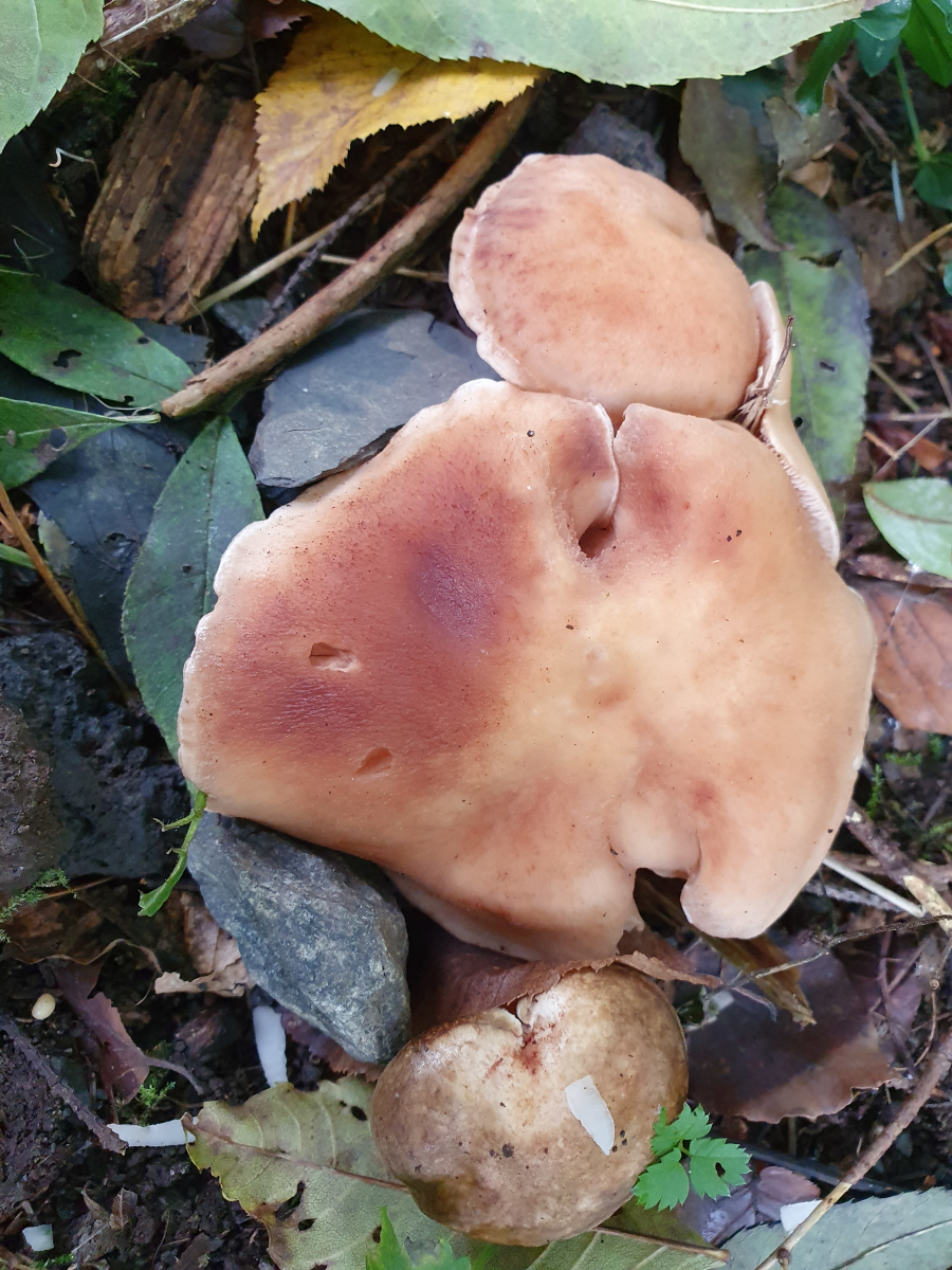 Hut dickfleischig, ocker gelblich, aber auch bräunlich (rötlich) fleckig werdend (auch an Stiel). Hut nicht zentral vertieft, eher flach ausgebreitet. Samtig.