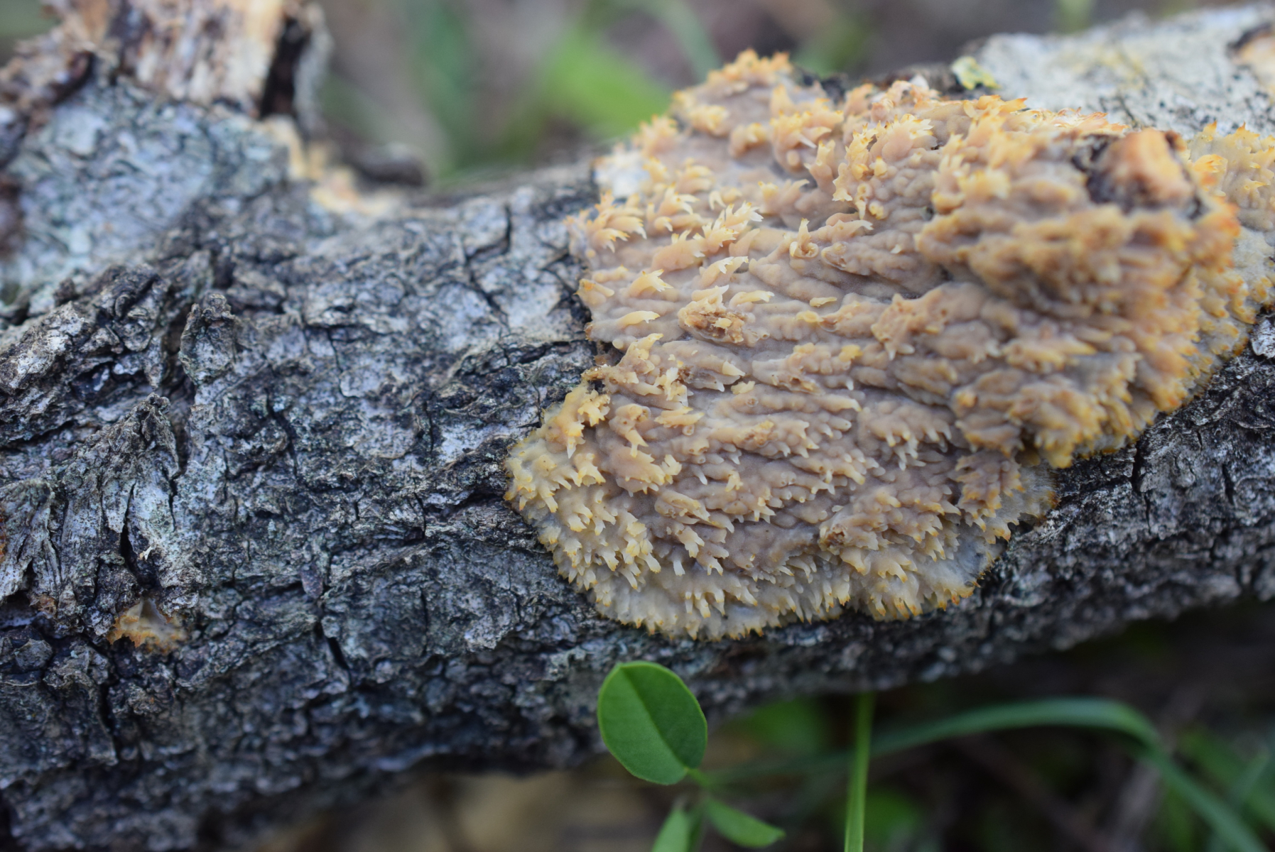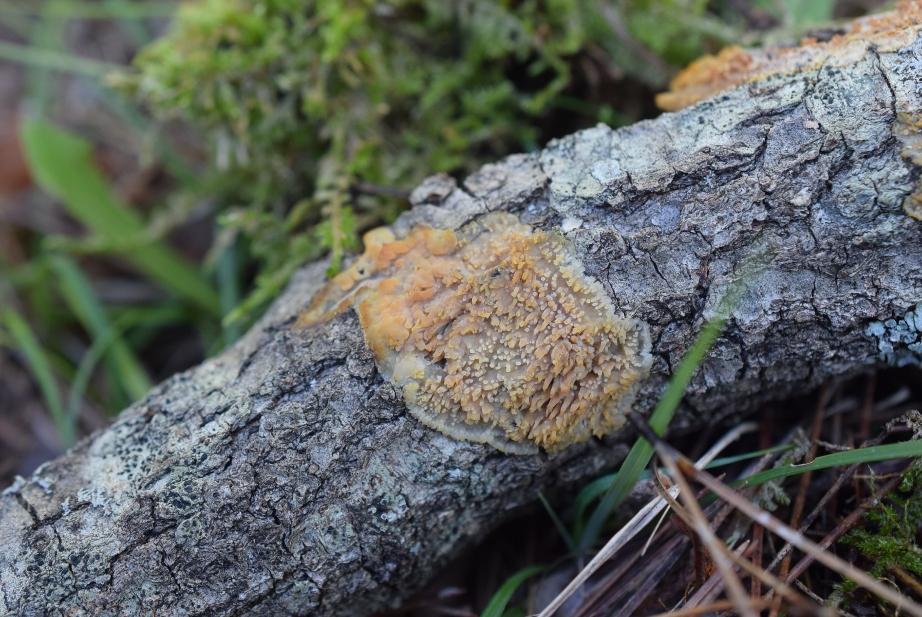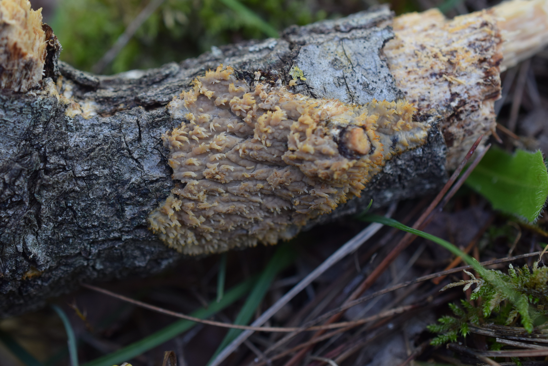 Etwas ungewöhnlich gewachsen, aber der Pilz bildet ddie Fruchtkörper normalerweise an abgestorbenen, aber noch ansitzenden Ästen. Wenn die Äste aber runterfallen, verändert sich ihre Position, und der Pilz muss die Stacheln anders ausrichten, da habe ich ab und an schon sehr merkwürdige Formen bei Radulomyces molaris gefunden.