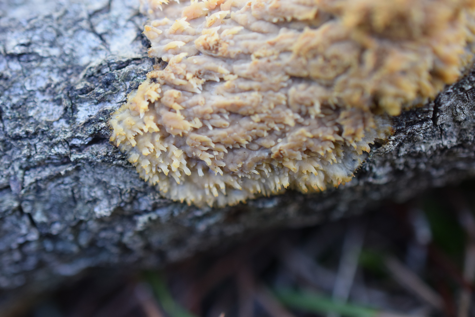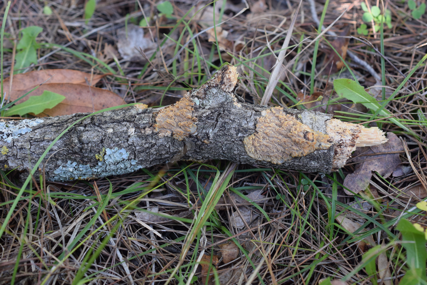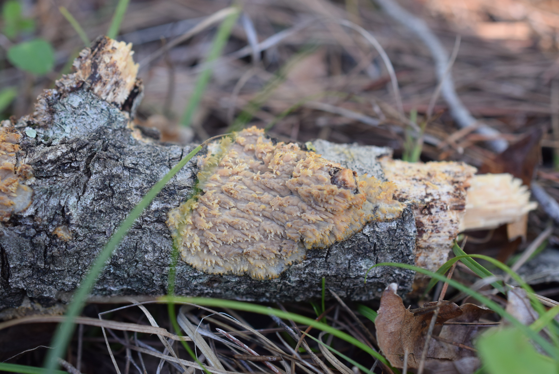 Etwas ungewöhnlich gewachsen, aber der Pilz bildet ddie Fruchtkörper normalerweise an abgestorbenen, aber noch ansitzenden Ästen. Wenn die Äste aber runterfallen, verändert sich ihre Position, und der Pilz muss die Stacheln anders ausrichten, da habe ich ab und an schon sehr merkwürdige Formen bei Radulomyces molaris gefunden.